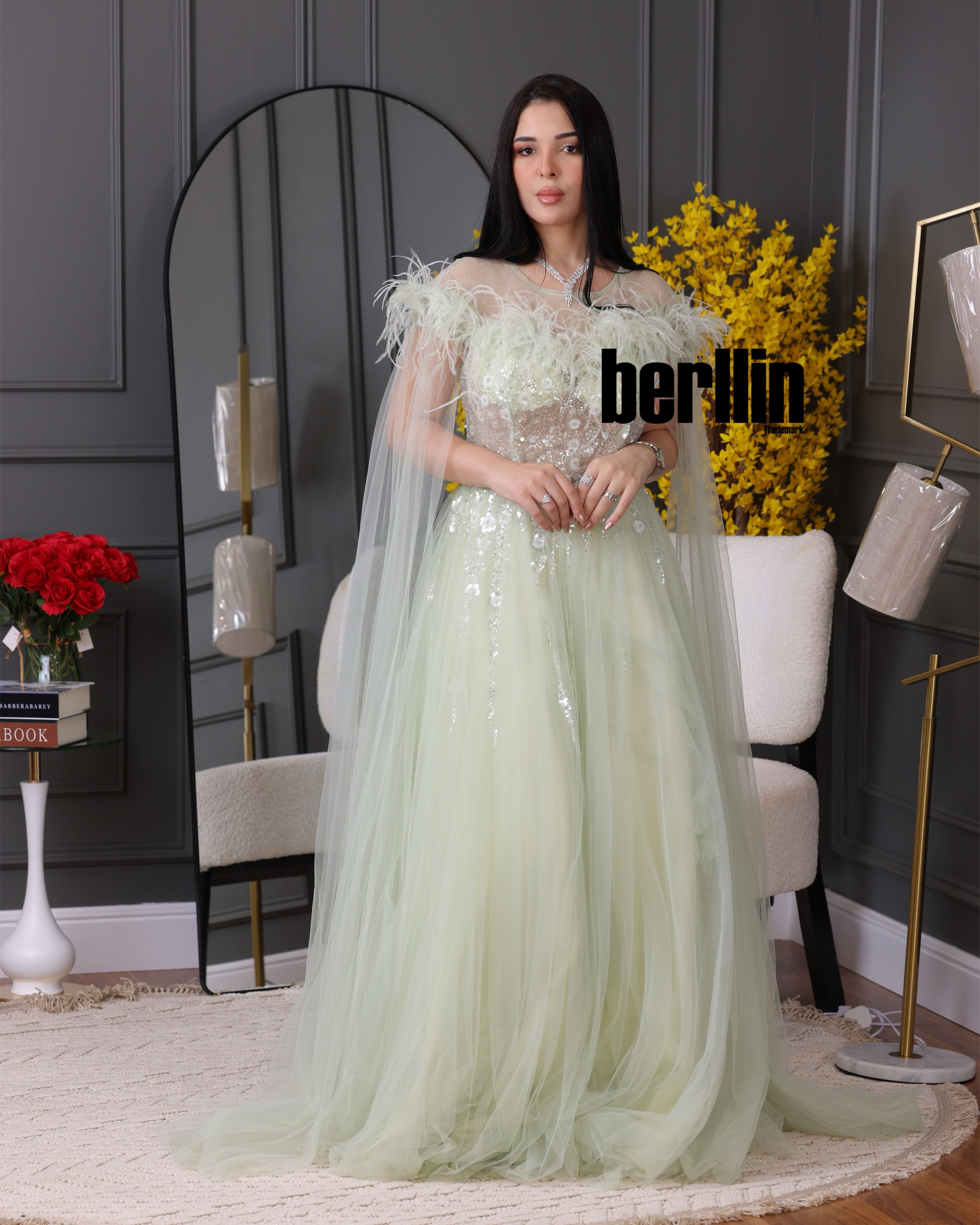 اكتشفي فستان سهره تول مطرز مميز بالريش لون تفاحي فاتح رائع وقصة عصرية. مثالي لإطلالة أنيقة ومتوفر بجميع المقاسات.
