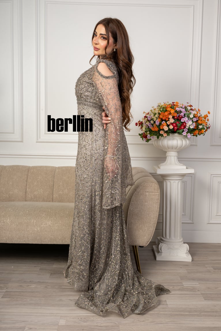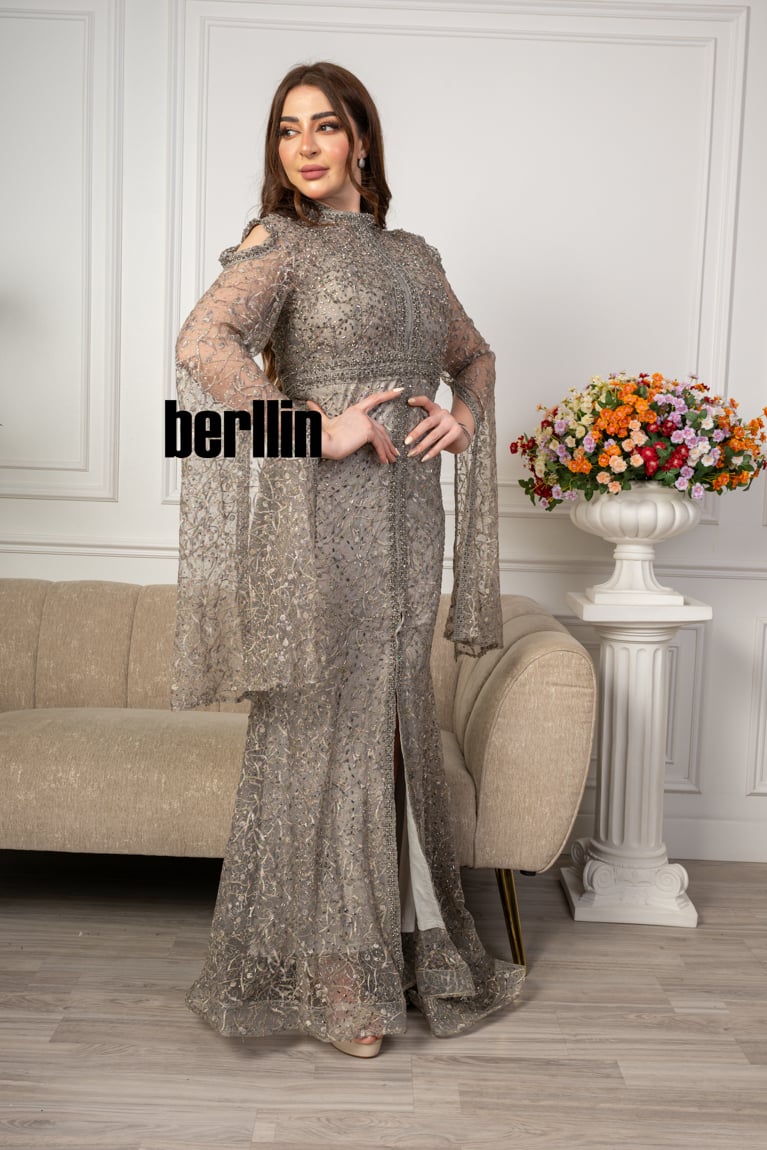 يتميز فستان سهره طويل بنمط الياقة المرتفعة مزين بالتطريز المشجر والفصوص لون رمادي تضفي لمسة ساحرة على مظهرك في المناسبات الخاصة. ويأتي مصنوعًا من تول مسامي يمنحك إطلالة راقية عند تنسيقه مع مجوهرات وحذاء بكعب مرتفع وسيور.