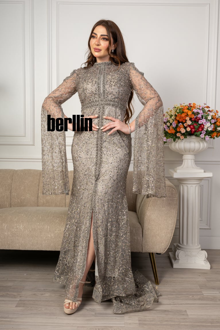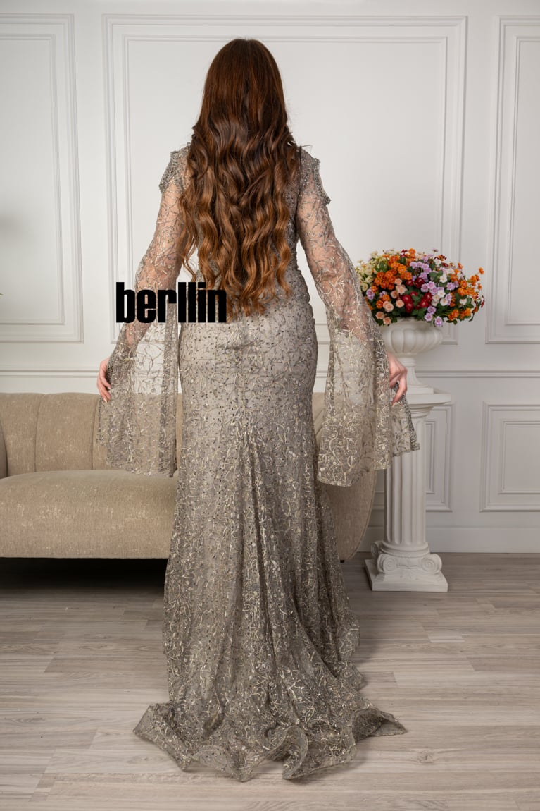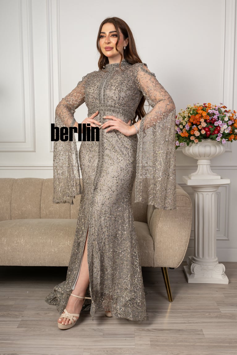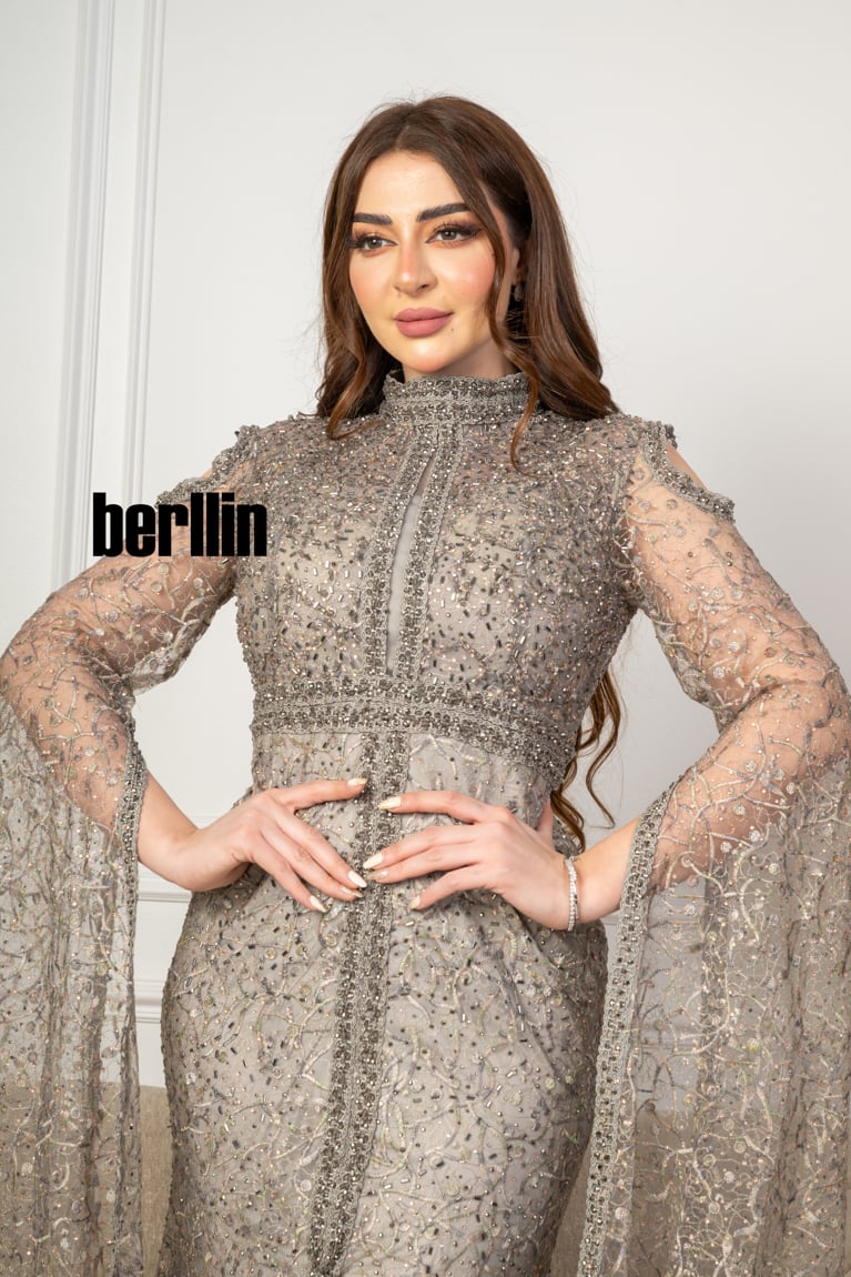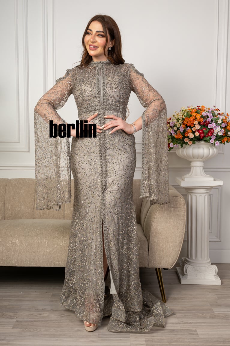 نوع القصة: فستان سهرة مزين بالفصوص بفتحة من الأمام وأكمام كيب
