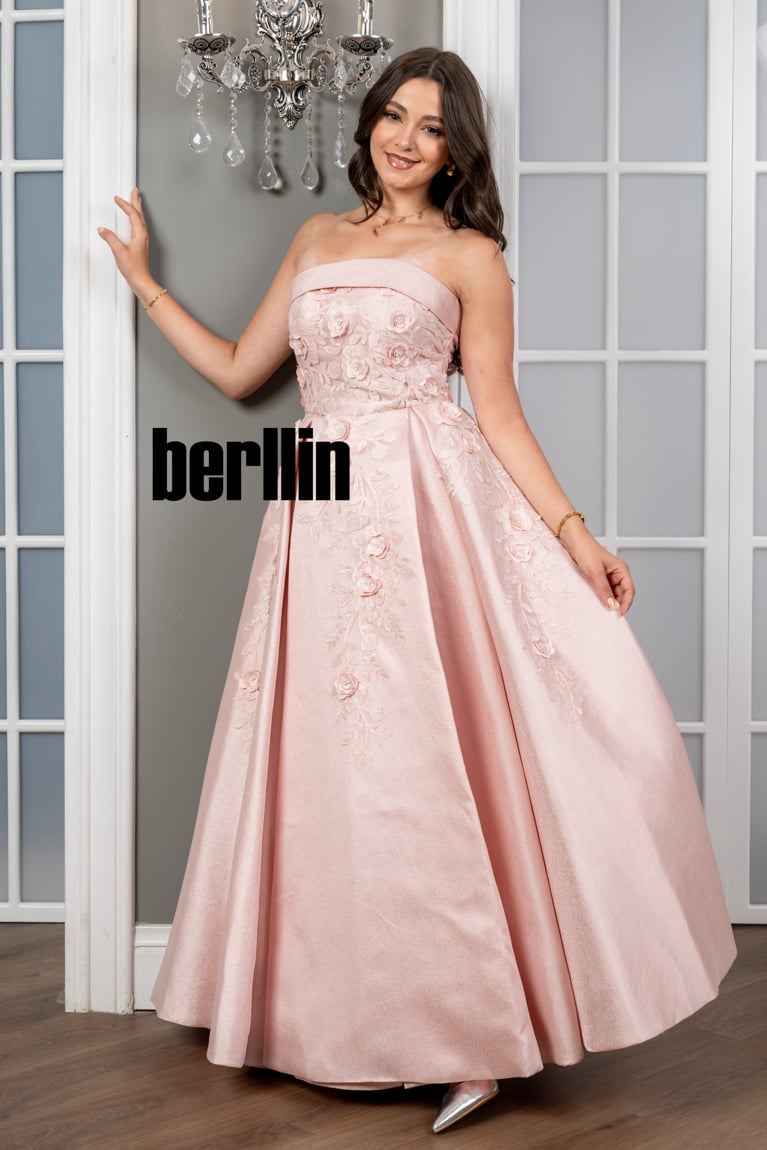 نوع التصميم: فستان سهرة طويل وردي مزين بتطريز زهور