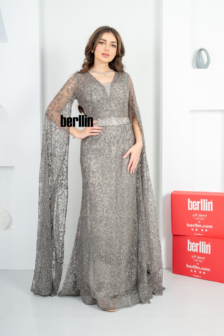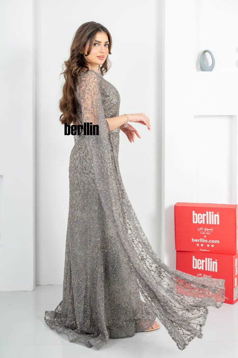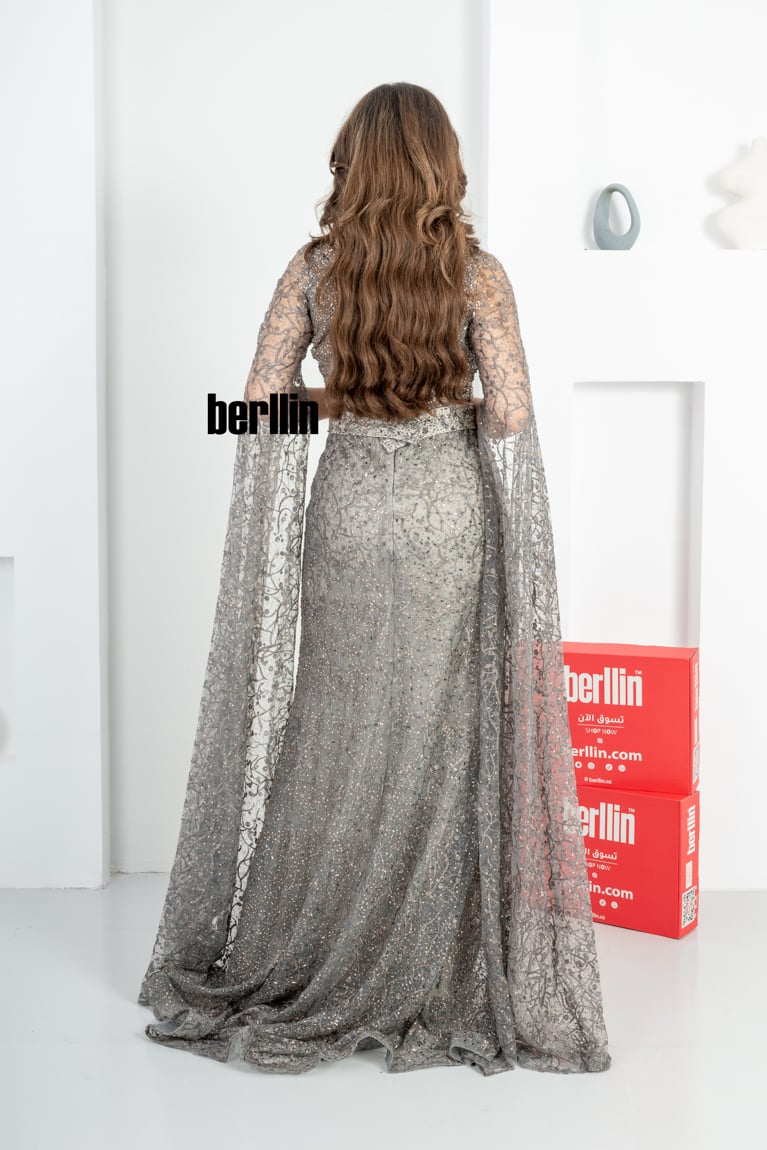 نوع التصميم: فستان سهرة مزين بالفصوص بأكمام كيب لون رصاصي