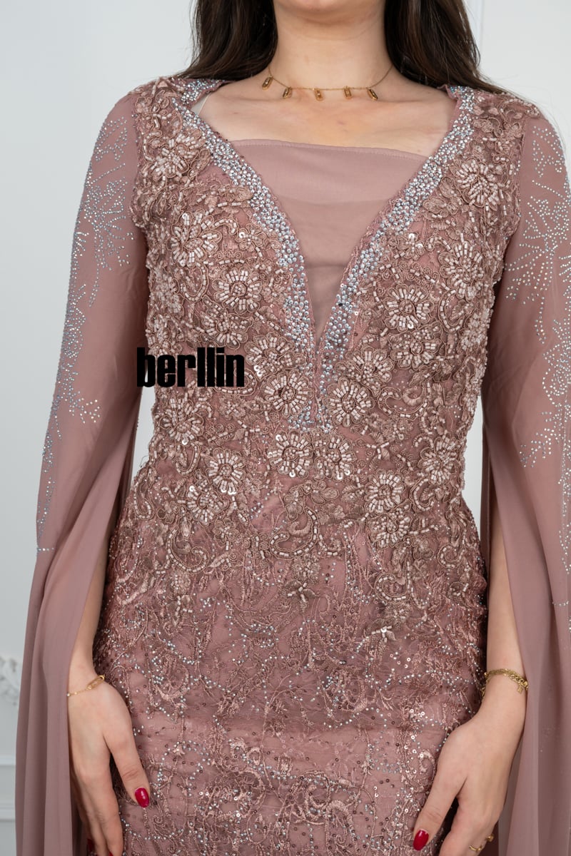 – الأكمام مصنوعة من قماش الشيفون الشفاف مع تطريزات أنيقة تمتد حتى المعصم، مما يمنح الإطلالة لمسة ملكية ناعمة.