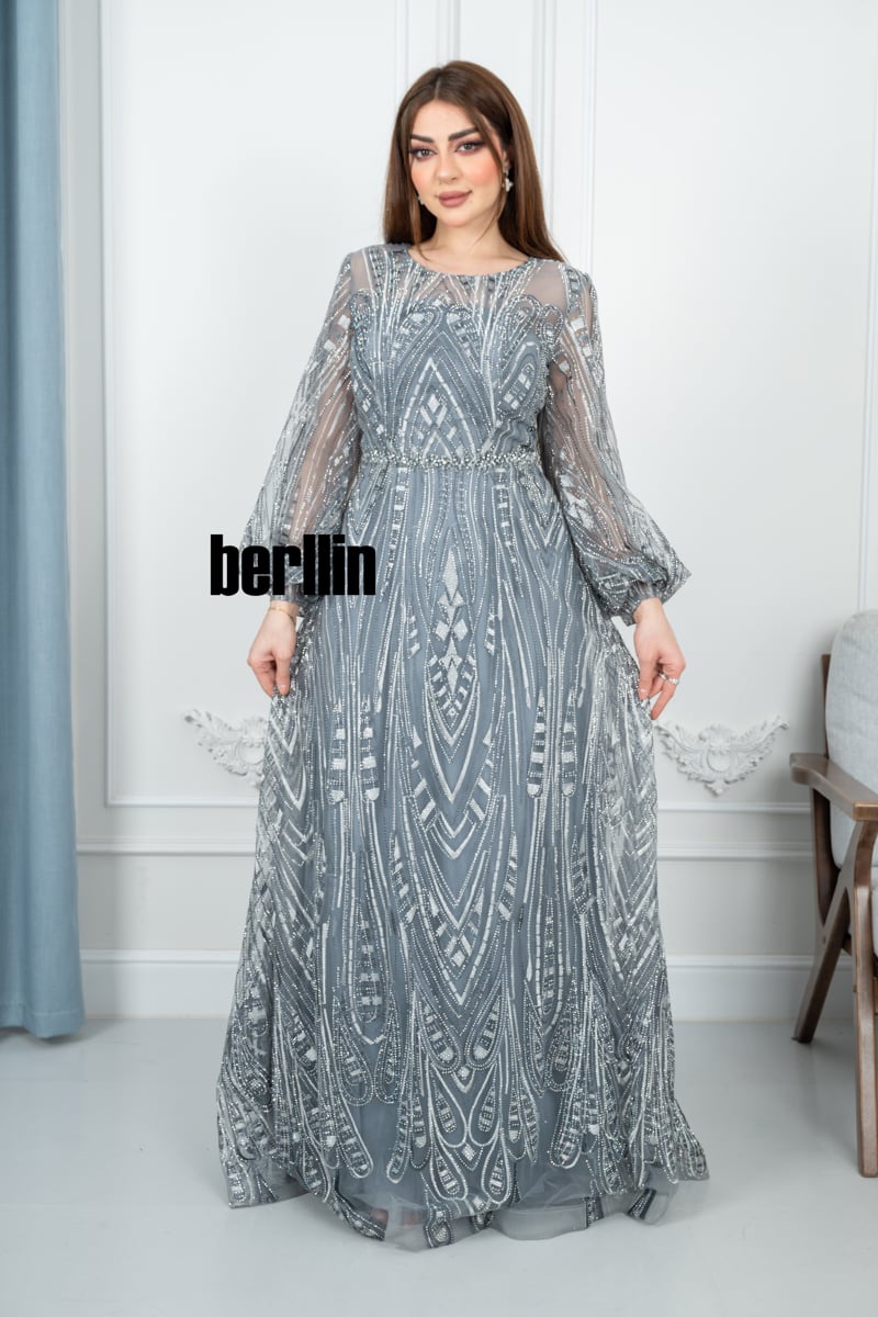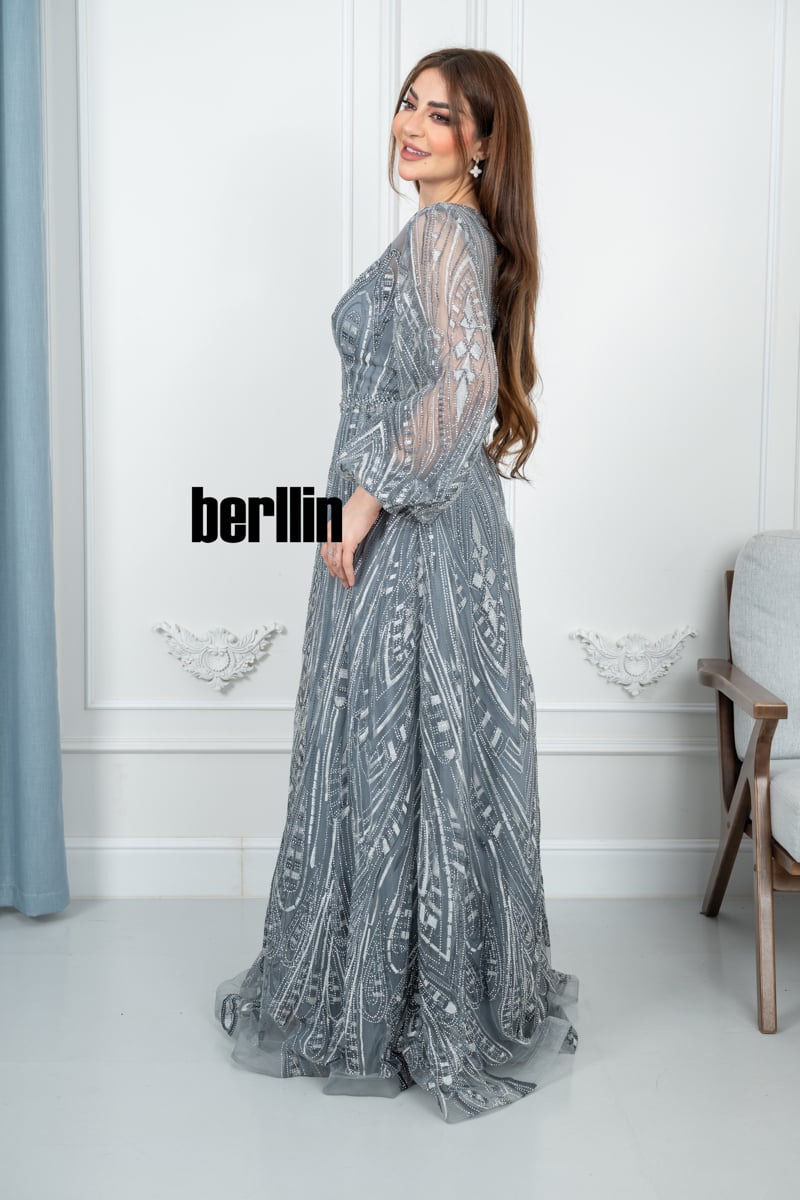 هذا الفستان الفاخر يتميز بلونه الرمادي الأنيق الذي يضفي عليه لمسة راقية وفخمة. التصميم يجمع بين الأناقة العصرية والفخامة الكلاسيكية، حيث يأتي بقصة واسعة تنسدل بانسيابية لإضفاء إطلالة راقية ومميزة.