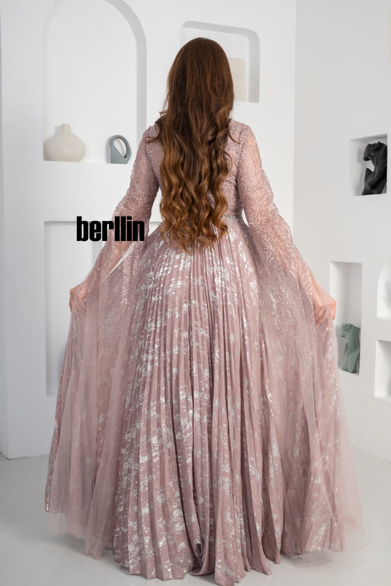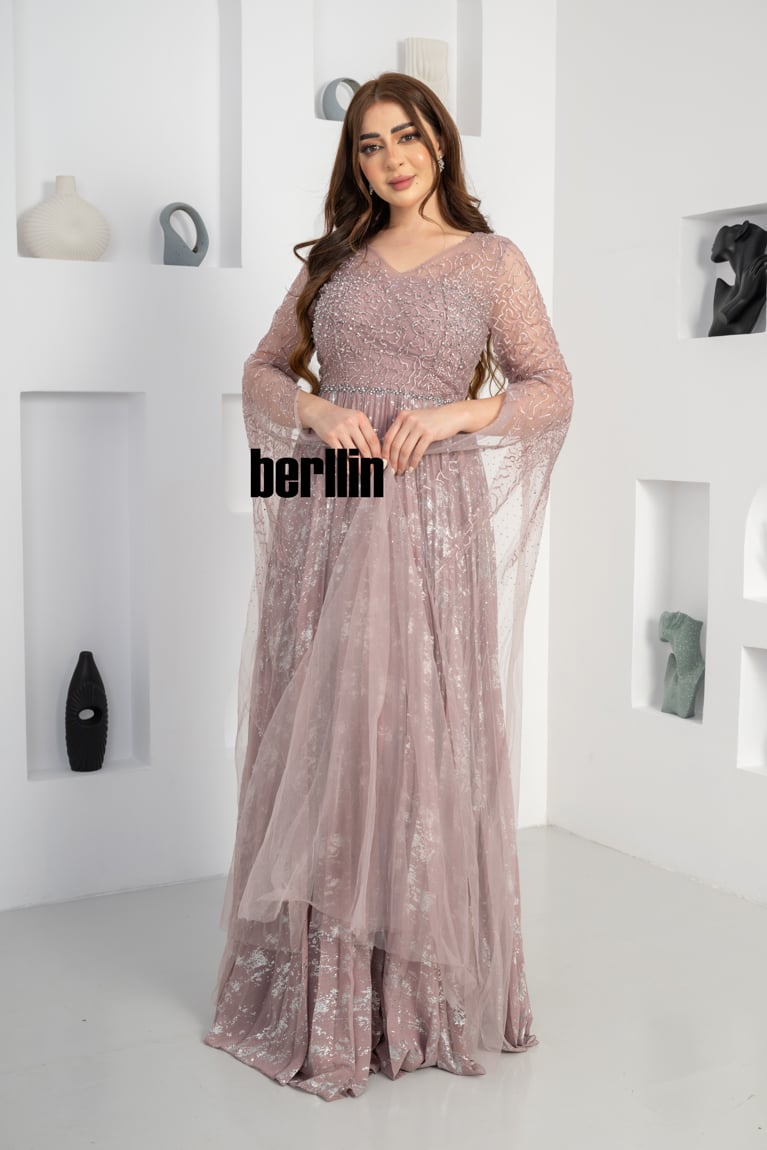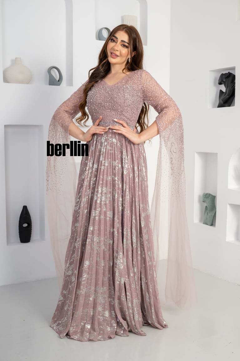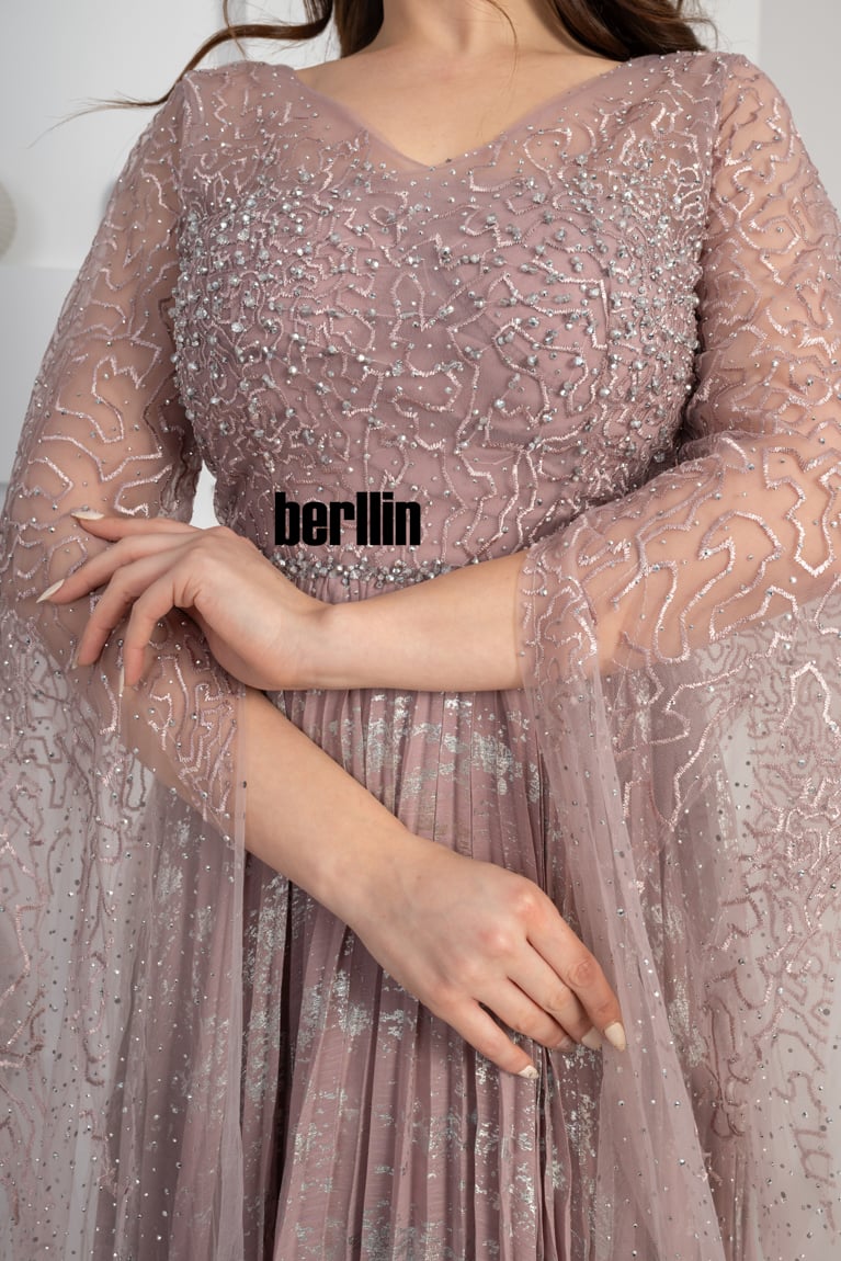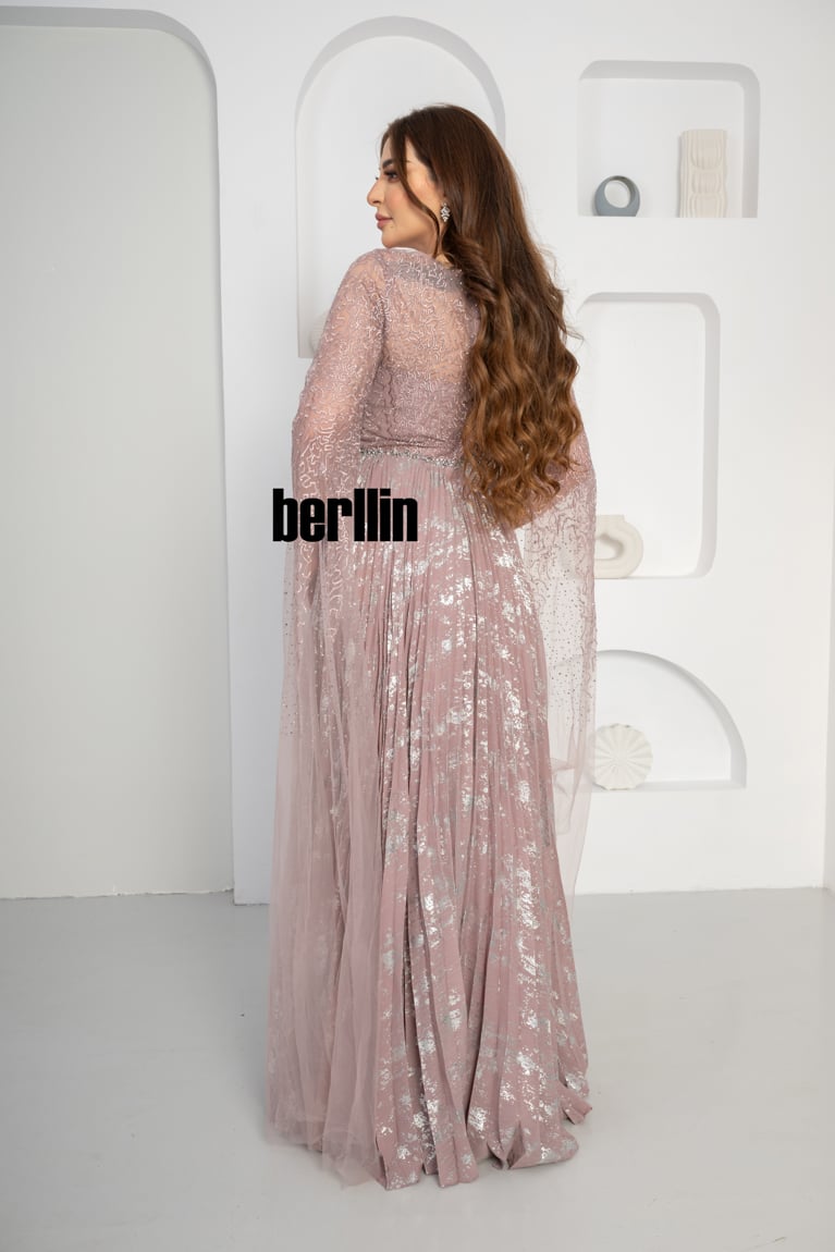 نوع التصميم: فستان سهرة مزين بالفصوص بأكمام كيب لون اخضر غامق