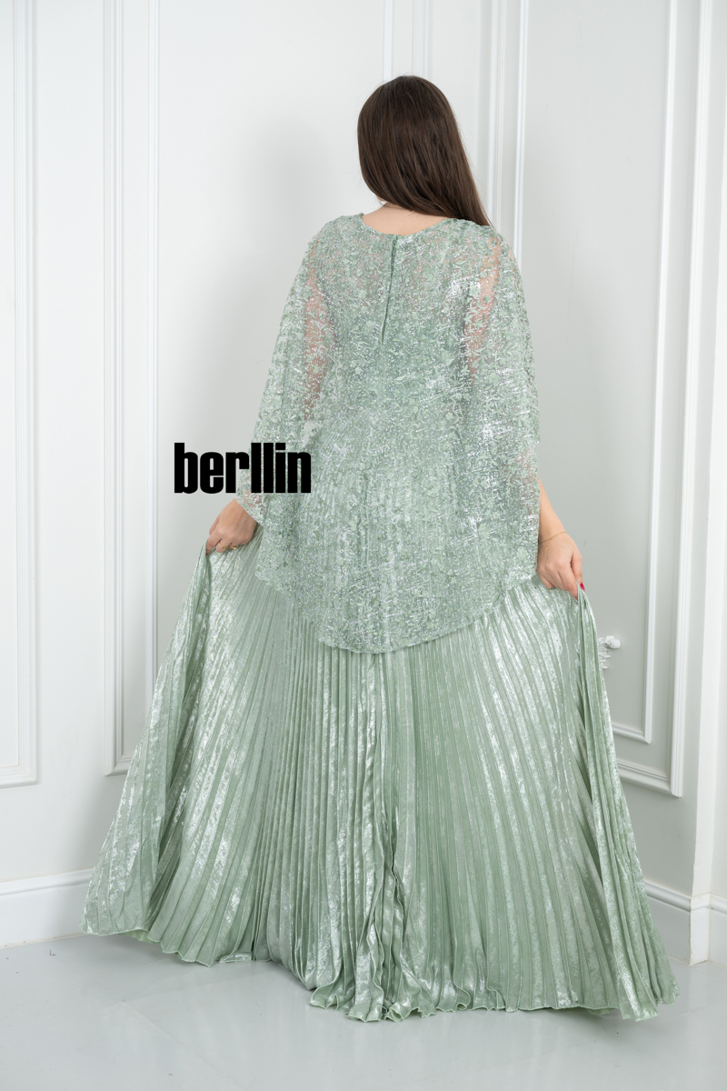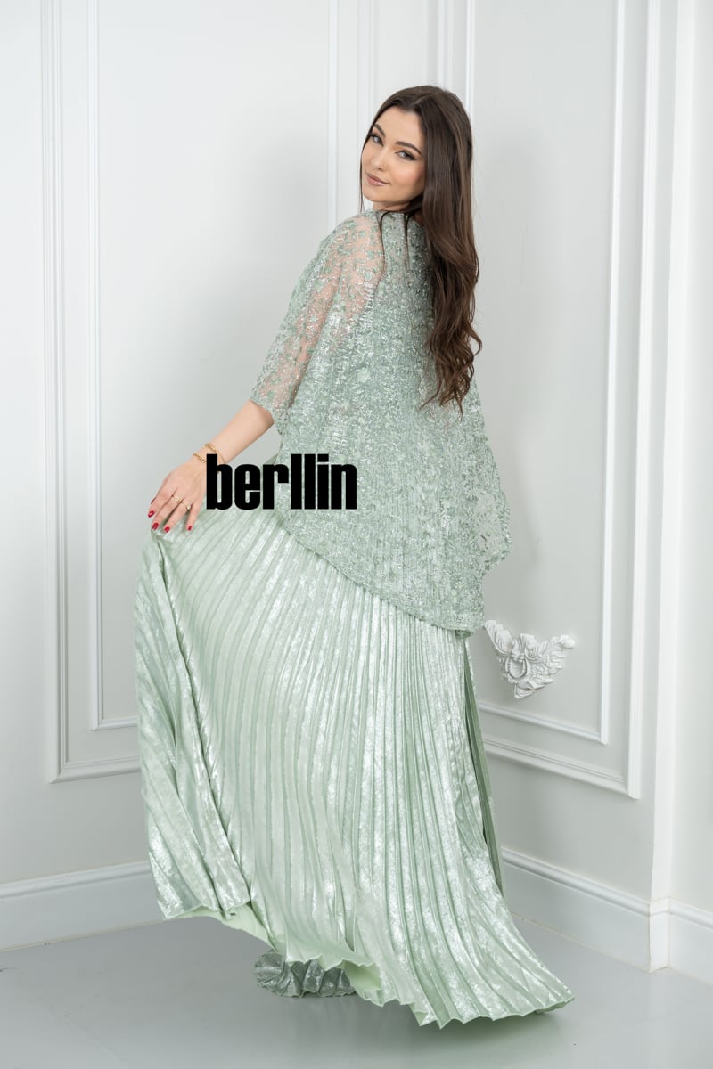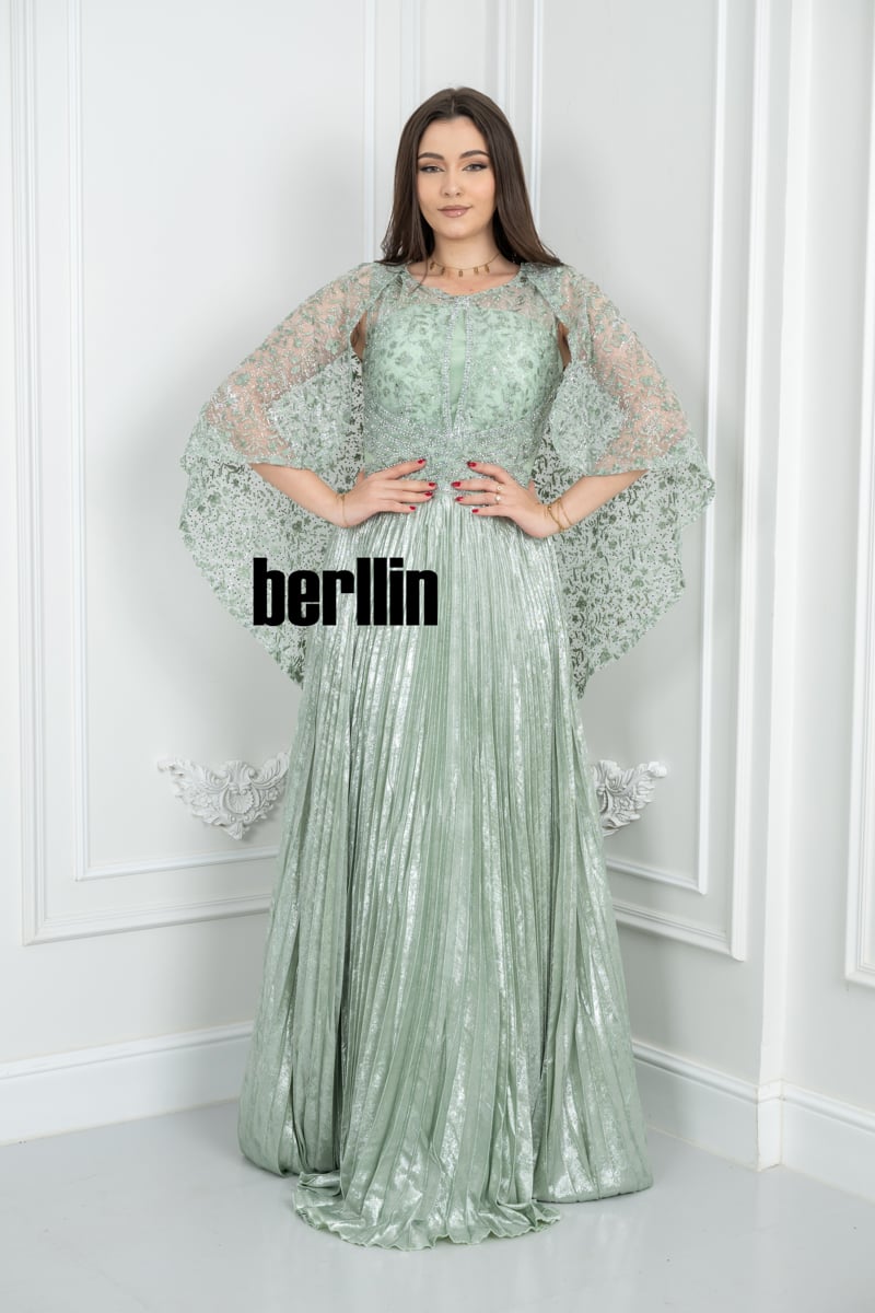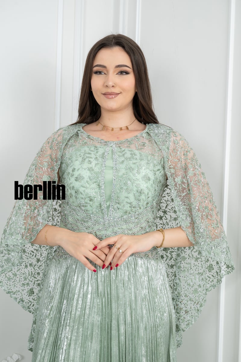 - أكمام من الدانتيل الفاخر مصممة على شكل كاب واسع، مما يضفي لمسة درامية راقية تناسب المناسبات الفخمة.