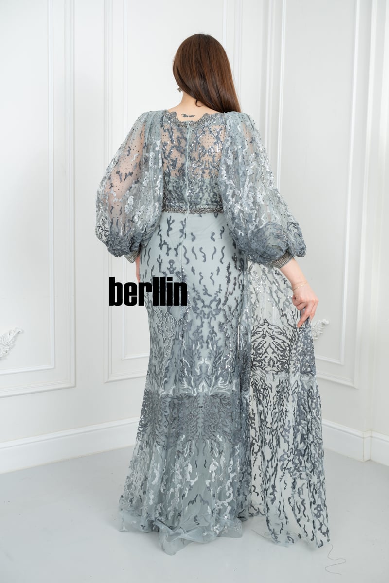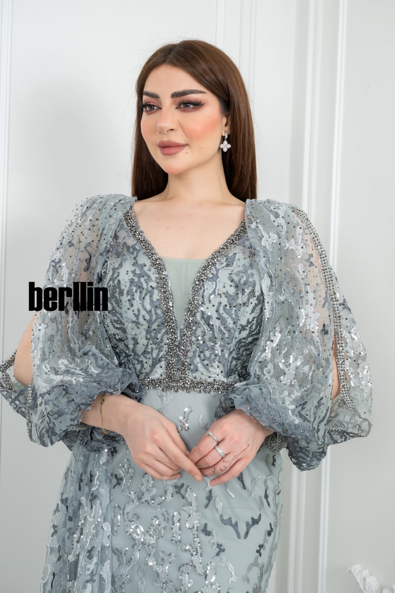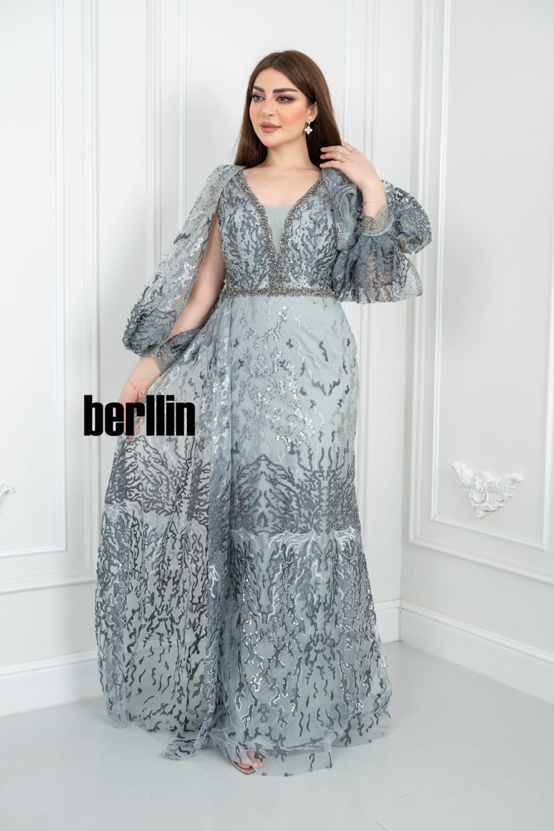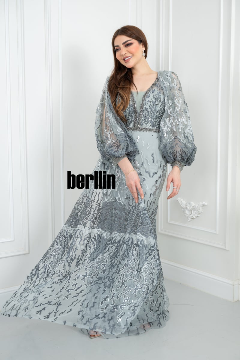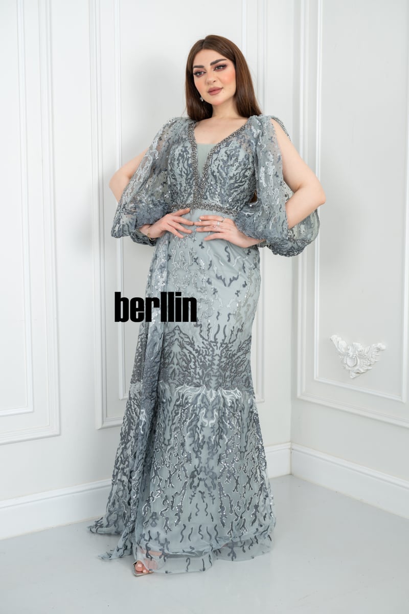 يأتي الفستان بلون رمادي فضي راقٍ يعكس الأناقة والفخامة، مما يجعله خيارًا مثالياً للسهرات الراقية. يمكن تنسيقه مع إكسسوارات فضية أو ماسية لإطلالة متكاملة وأنيقة.