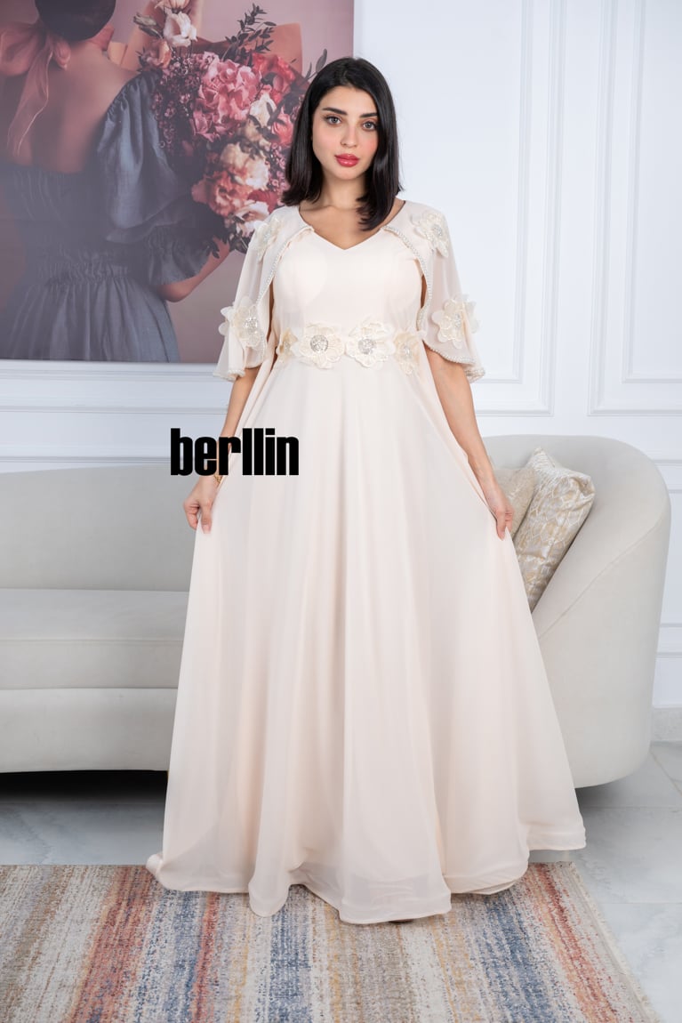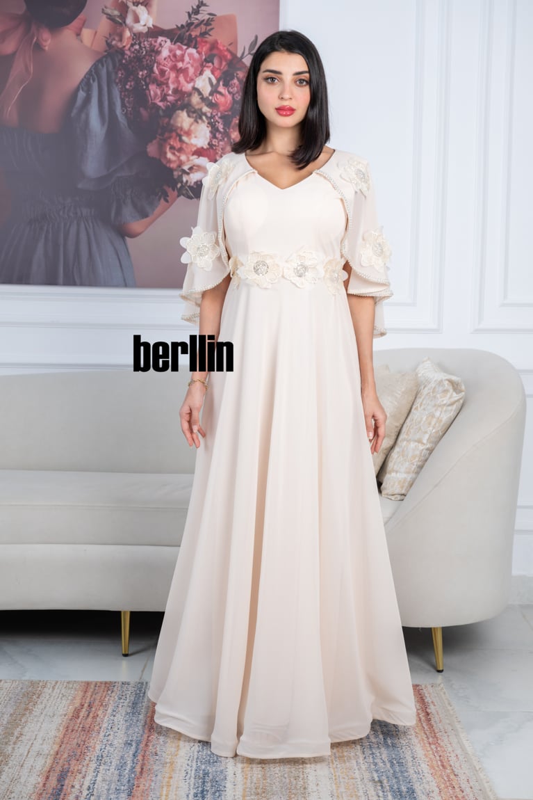 - الأكمام: بتصميم كاب فضفاض مزين بتطريزات أنيقة من الورود والدانتيل، مما يمنح الفستان لمسة ملكية جذابة.