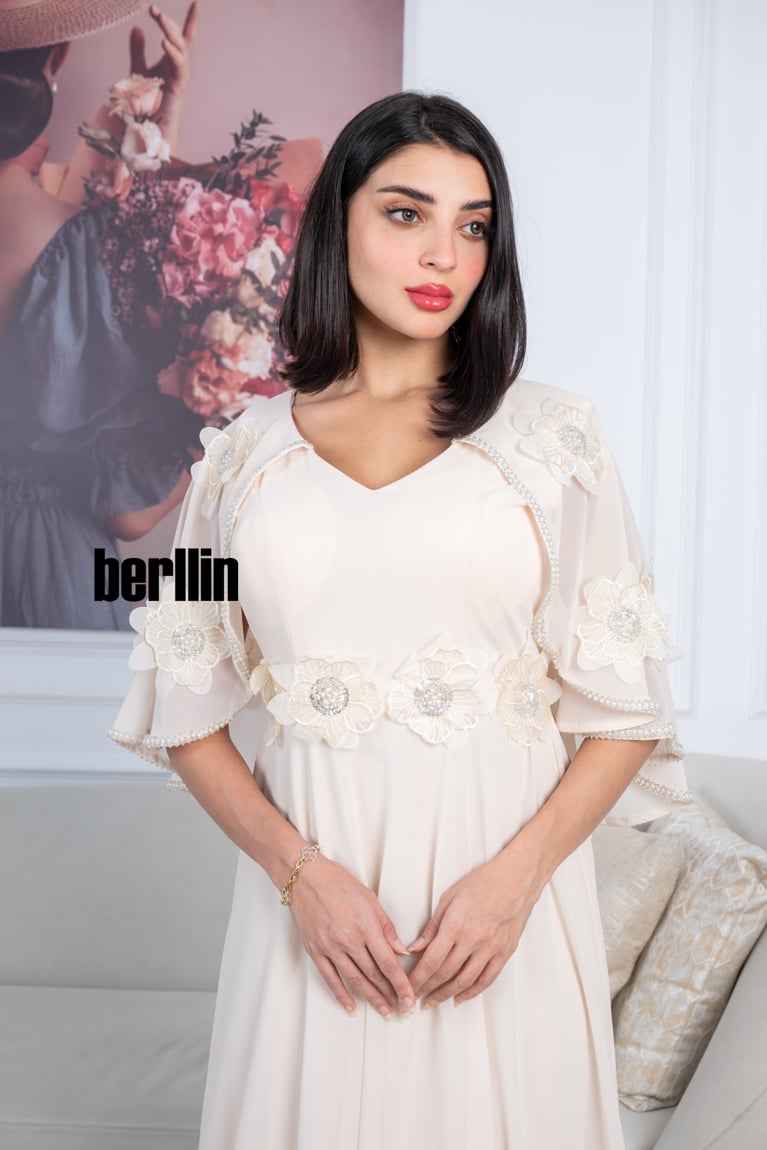 يتميز بتصميم أنثوي ناعم باللون العاجي، مما يمنحه طابعًا راقيًا وفخمًا. يأتي بقصة طويلة وانسيابية تضفي لمسة من الأناقة والرقي، مع ياقة على شكل V تعزز من جمال الإطلالة.