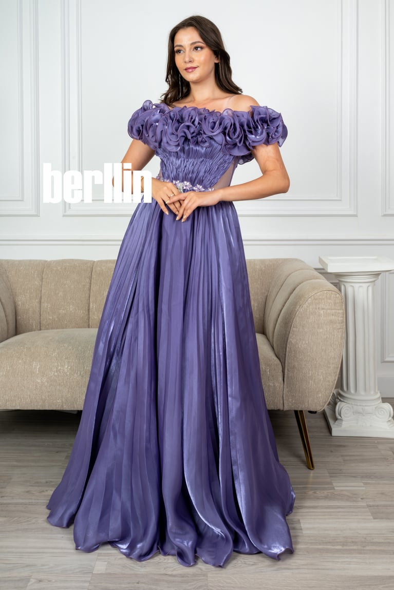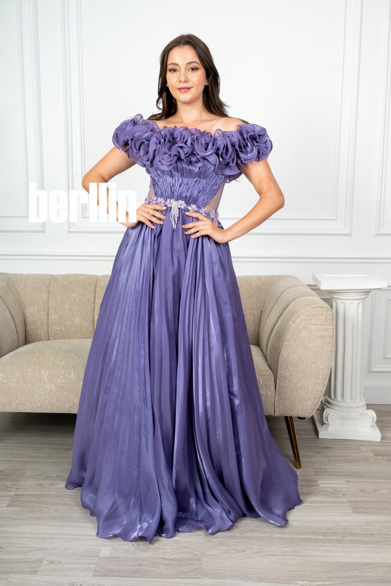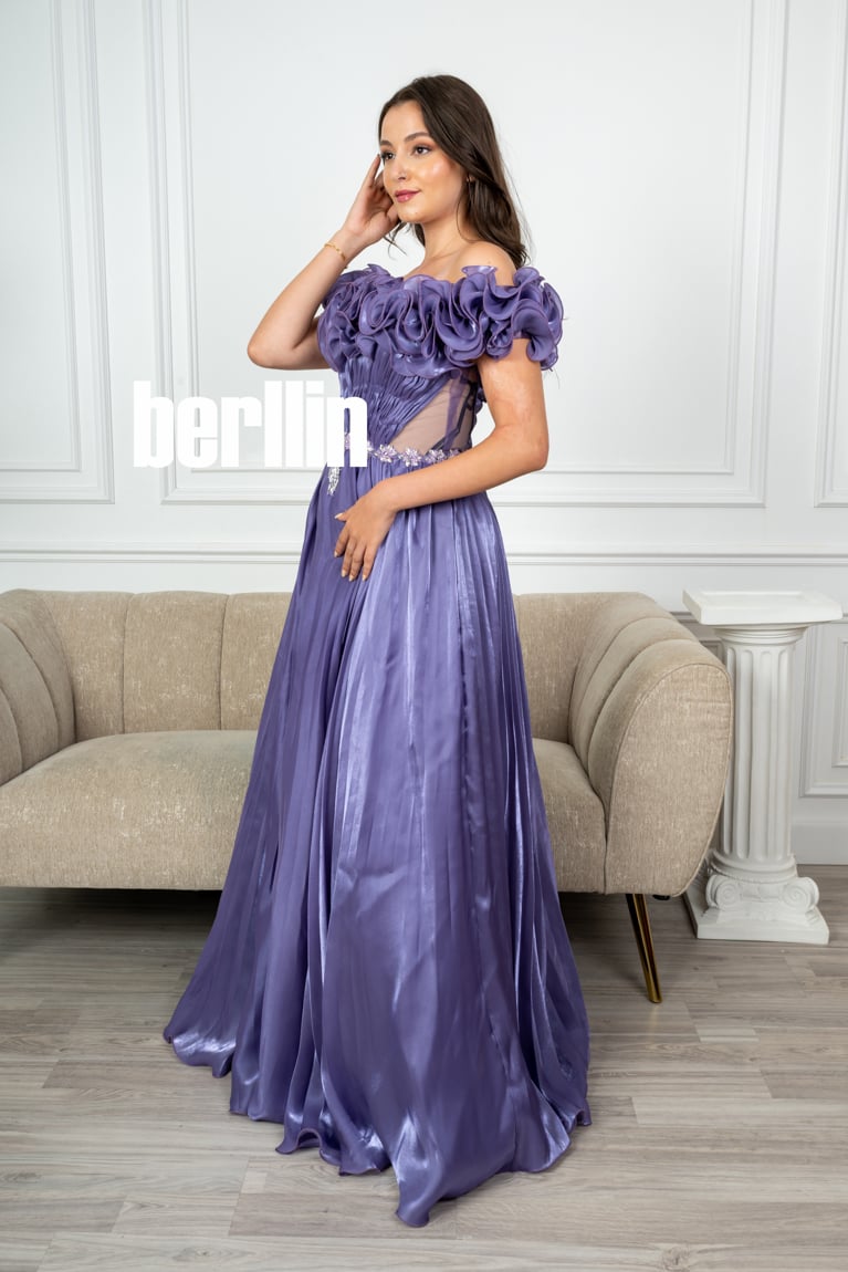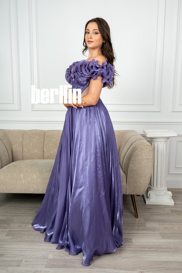 نوع التصميم: فستان سهرة طويل بتطريز ورد فخم لون بنفسجي