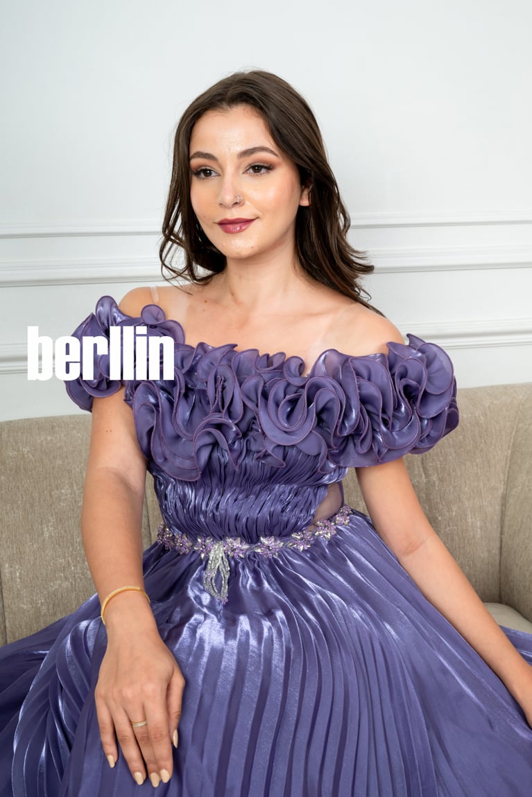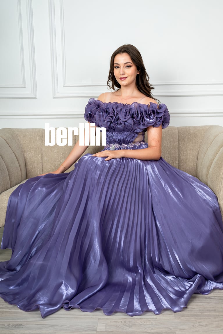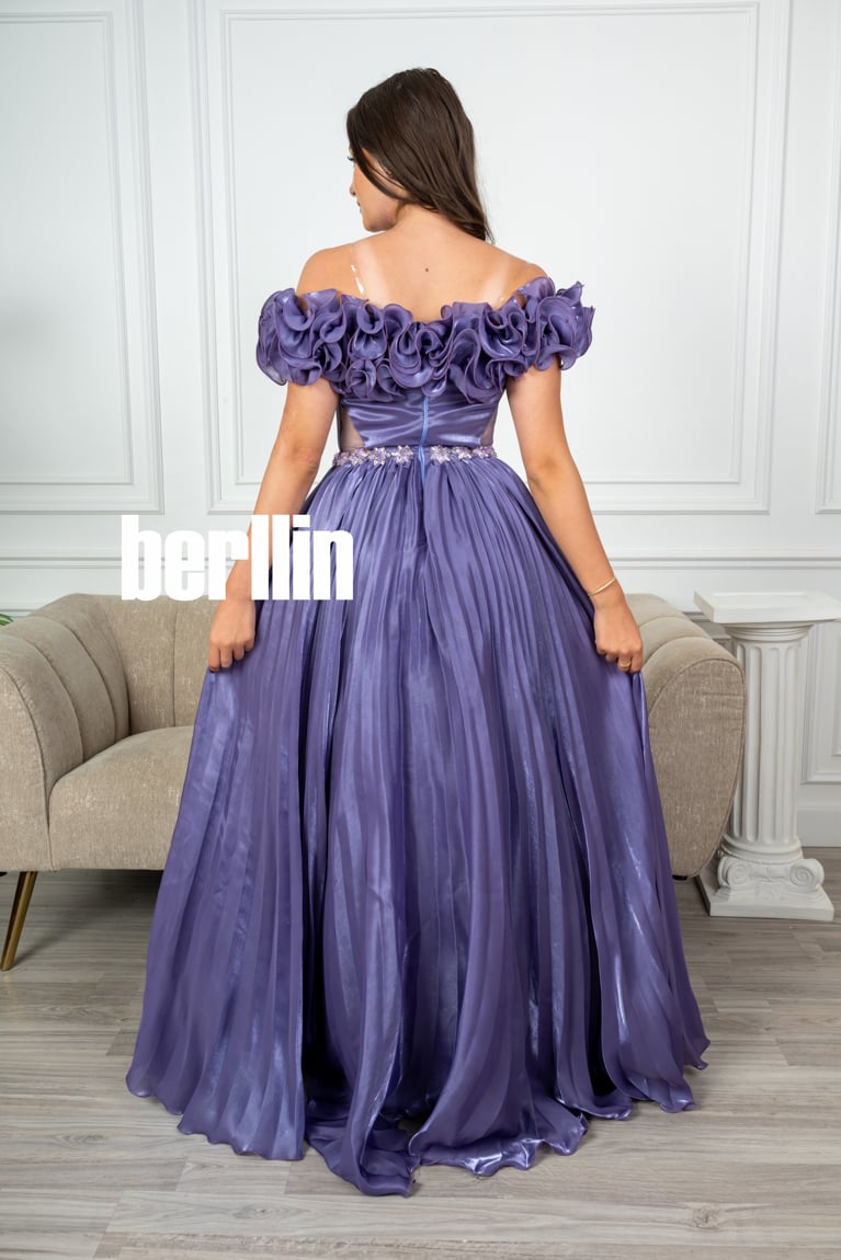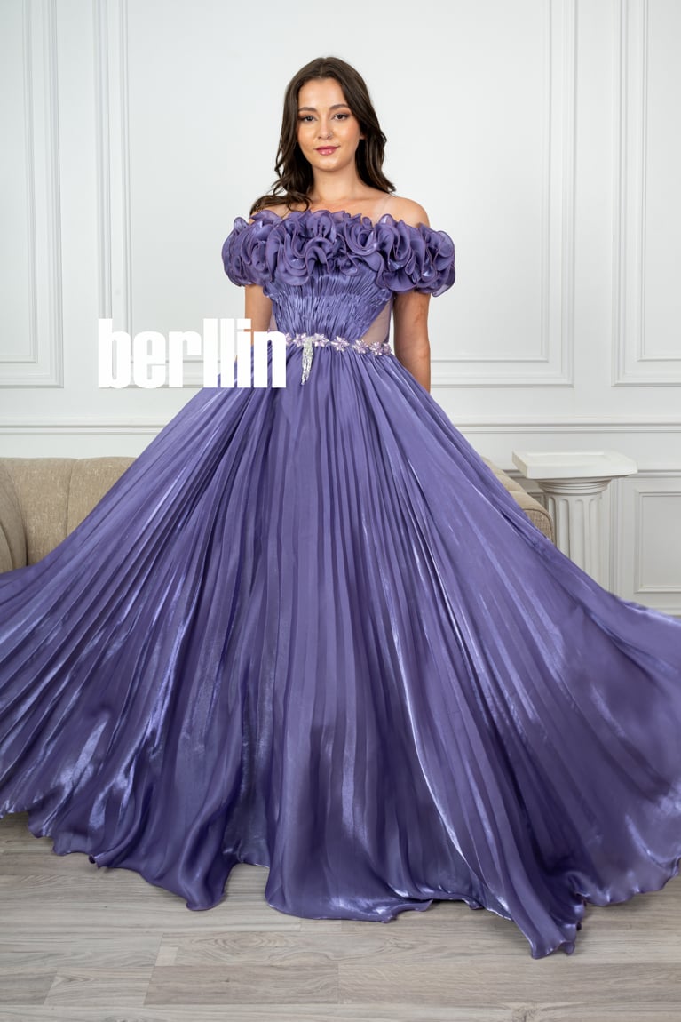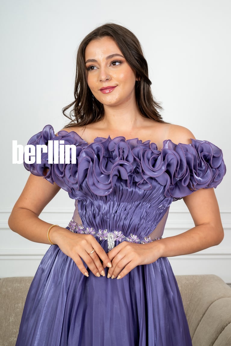 نوع التصميم: فستان سهرة طويل بتطريز ورد فخم لون بنفسجي