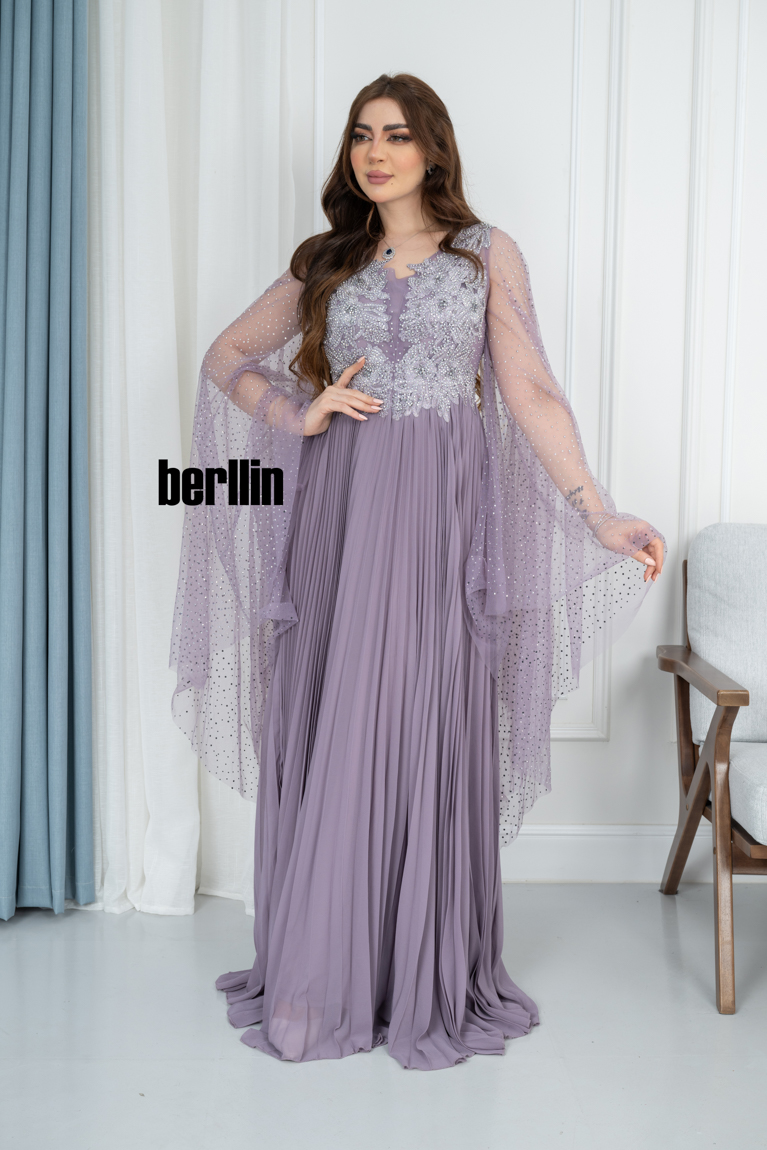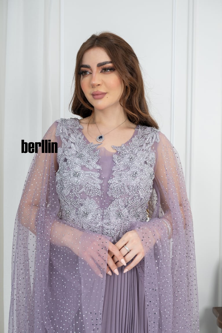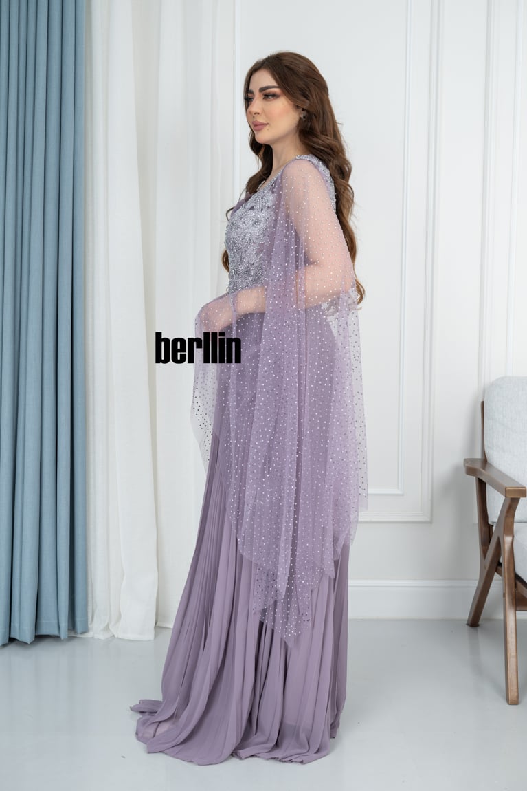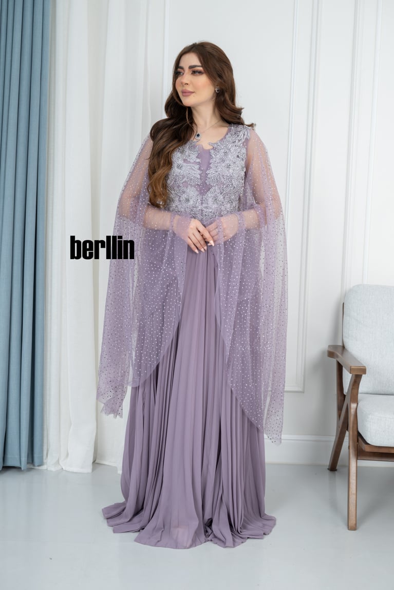 نوع التصميم: فستان سهرة مميز بمطرز وبأكمام كيب تل لون موف