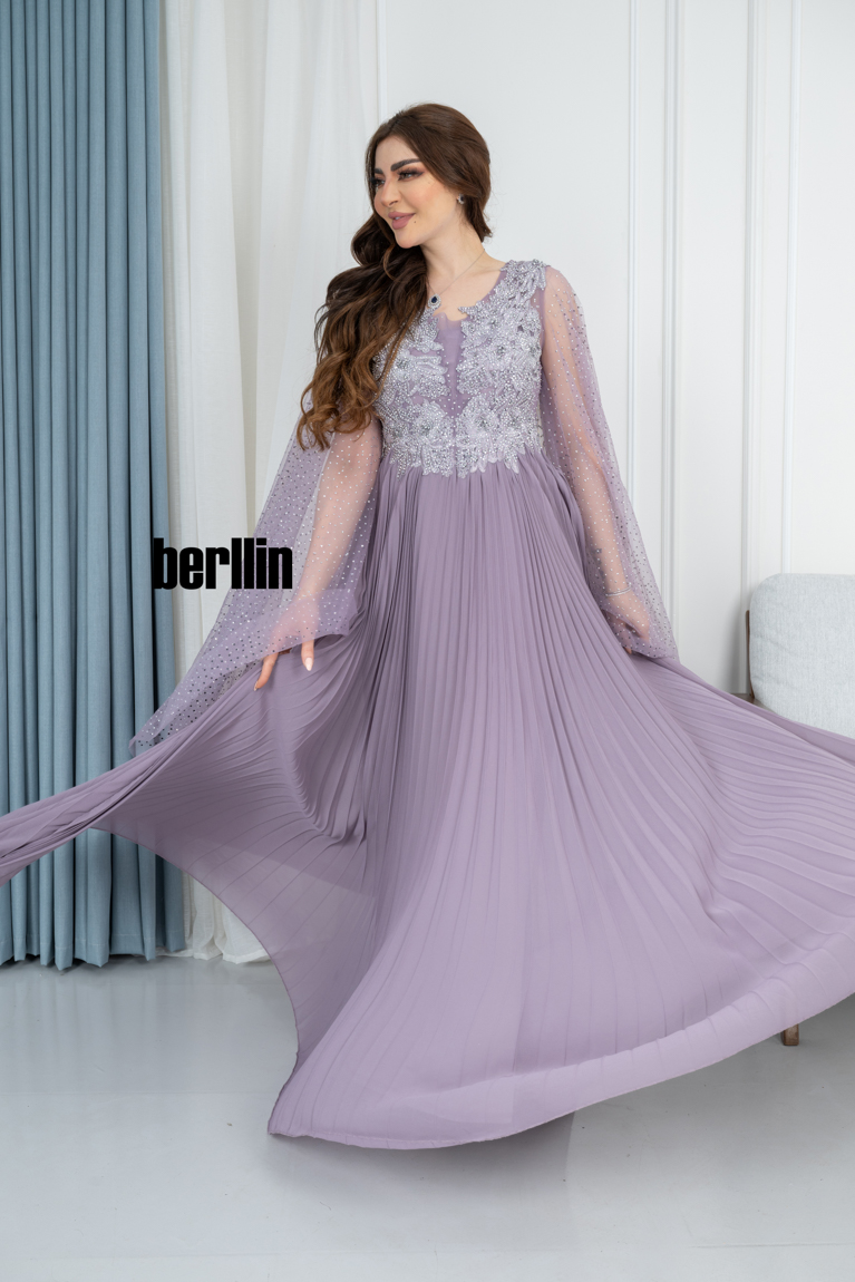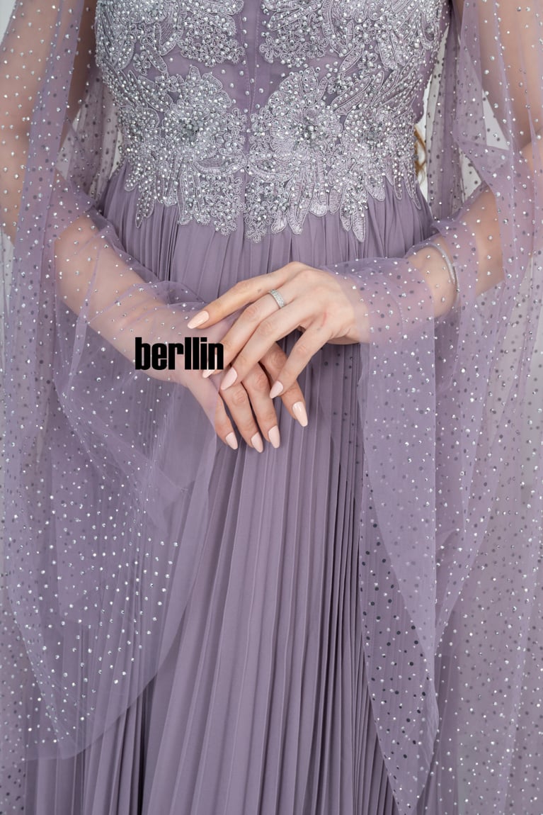يتميز الفستان بتطريز وبأكمام كيب تل لون موف من برلين بأكمام كيب تول طويلة مزينة بالفصوص تضفي لمسة ساحرة على مظهرك في المناسبات الخاصة. ويأتي مصنوعًا من الشيفون المكسر و تول مسامي على شكل ازهار ورق الشجر مطرز يمنحك إطلالة راقية عند تنسيقه مع مجوهرات وحذاء بكعب مرتفع وسيور.