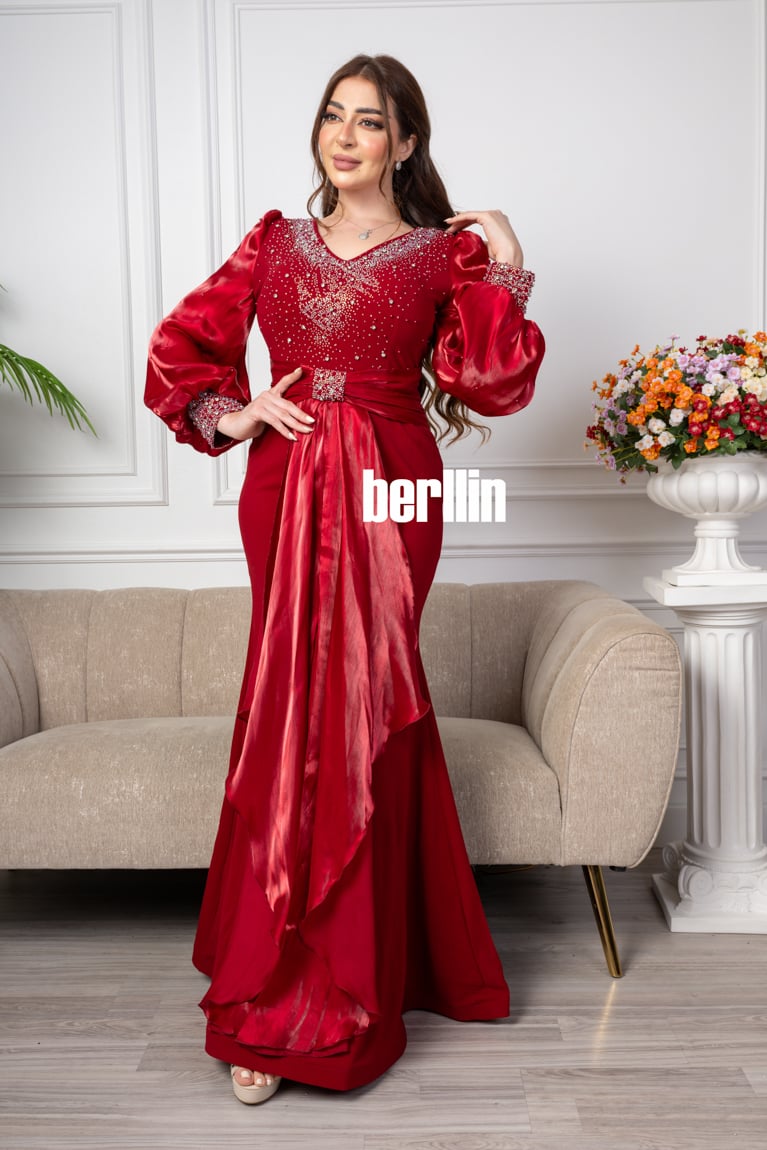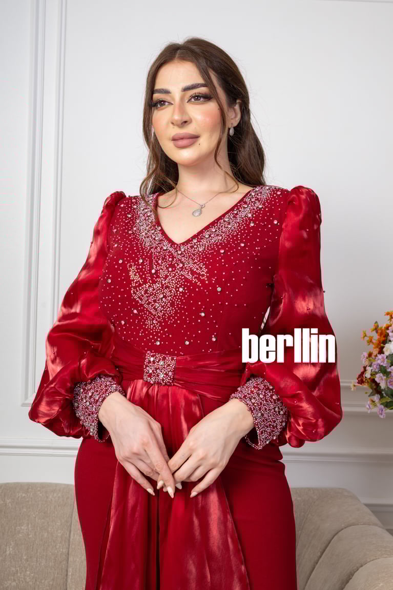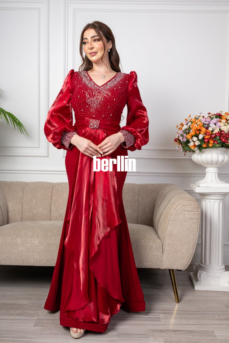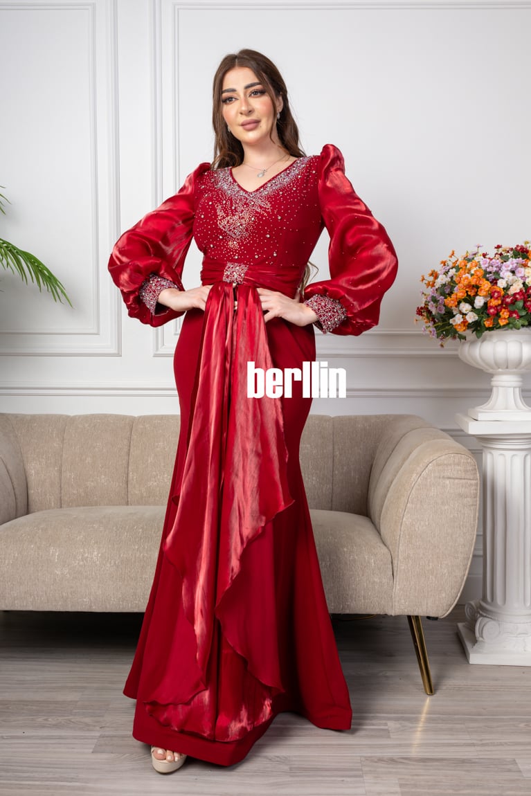 اكتشفي فستان سهرة طويل مميز بالفصوص لون احمر رائع وقصة لف وبفتحة مميزة بالفصوص العصرية. مثالي لإطلالة أنيقة ومتوفر بجميع المقاسات.