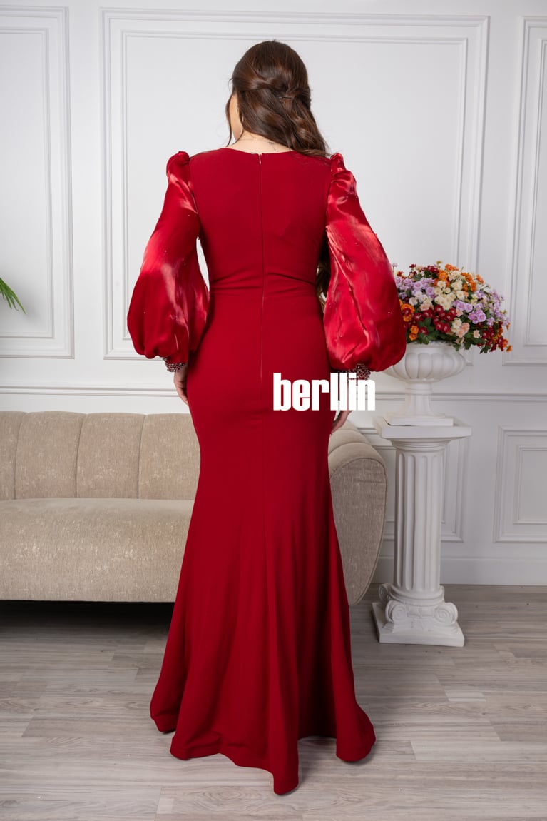 قصة الموديل : يتميز الفستان بقصة حورية البحر مميزة بالفصوص الفخمة وبستايل الكم المنفوخ جمالية بتطريز الراقي، والتي تعطي للفستان شكلًا أنيقًا وجذابًا. قصة حورية البحر يمكن أن تكون متنوعة، مثل القصة الضيقة أو القصة الواسعة، وتعزز جمال الفستان وتنساب بشكل متناغم على الجسم.