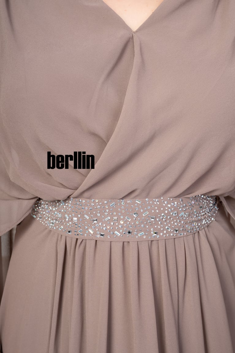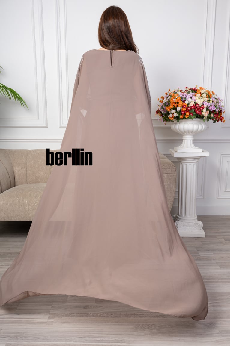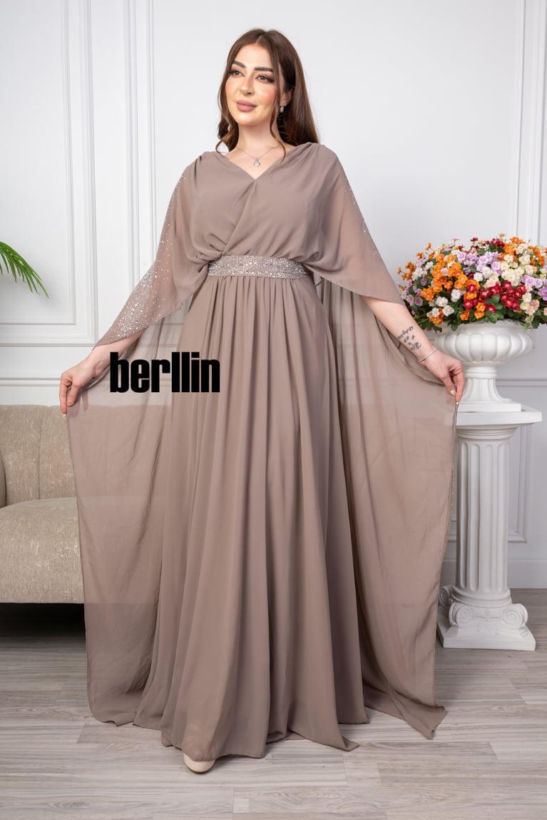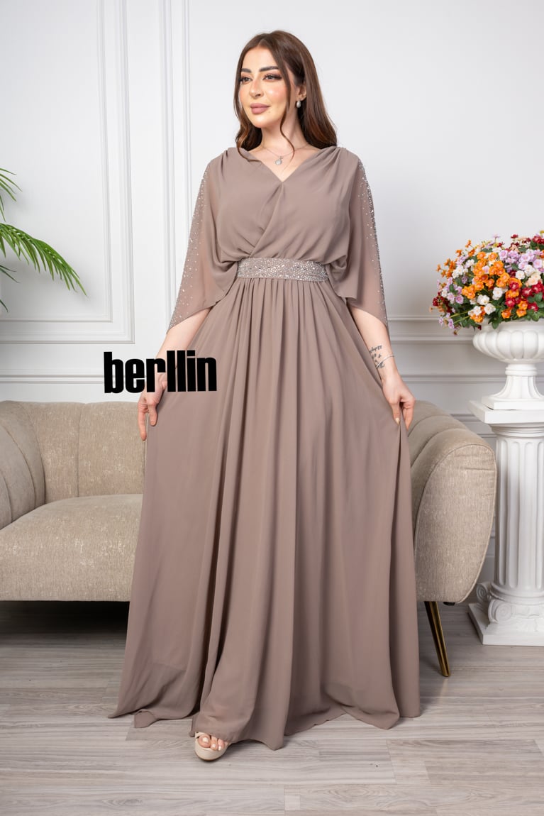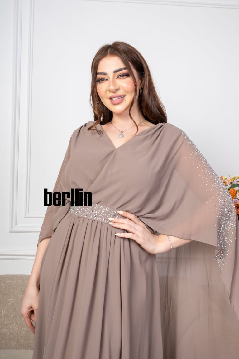 قصة الموديل : يتميز الفستان بقصة كلوش ومميز ومميز بالفصوص الكريستالية الراقي، والتي تعطي للفستان شكلًا أنيقًا وجذابًا. قصة الكلوش يمكن أن تكون متنوعة، مثل القصة الضيقة أو القصة الواسعة، وتعزز جمال الفستان وتنساب بشكل متناغم على الجسم.