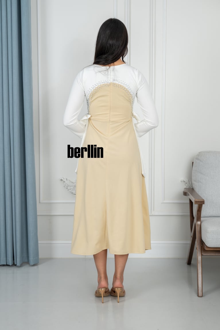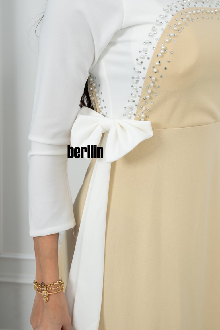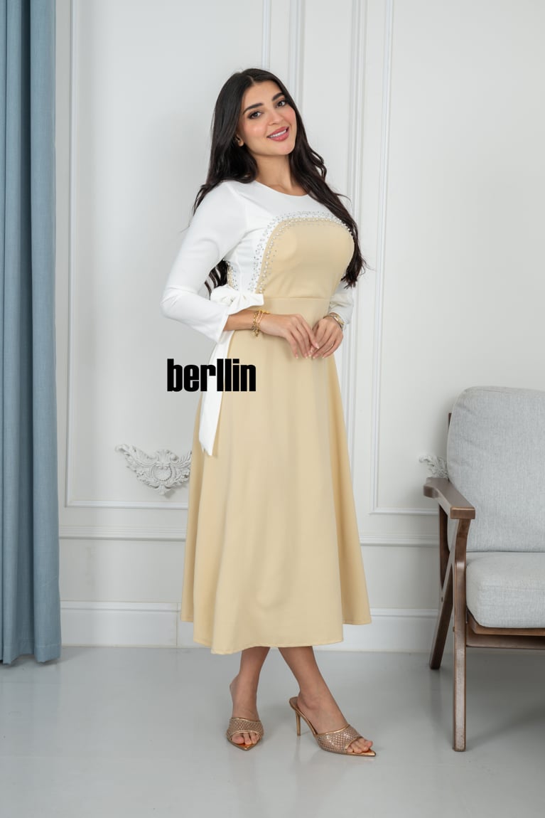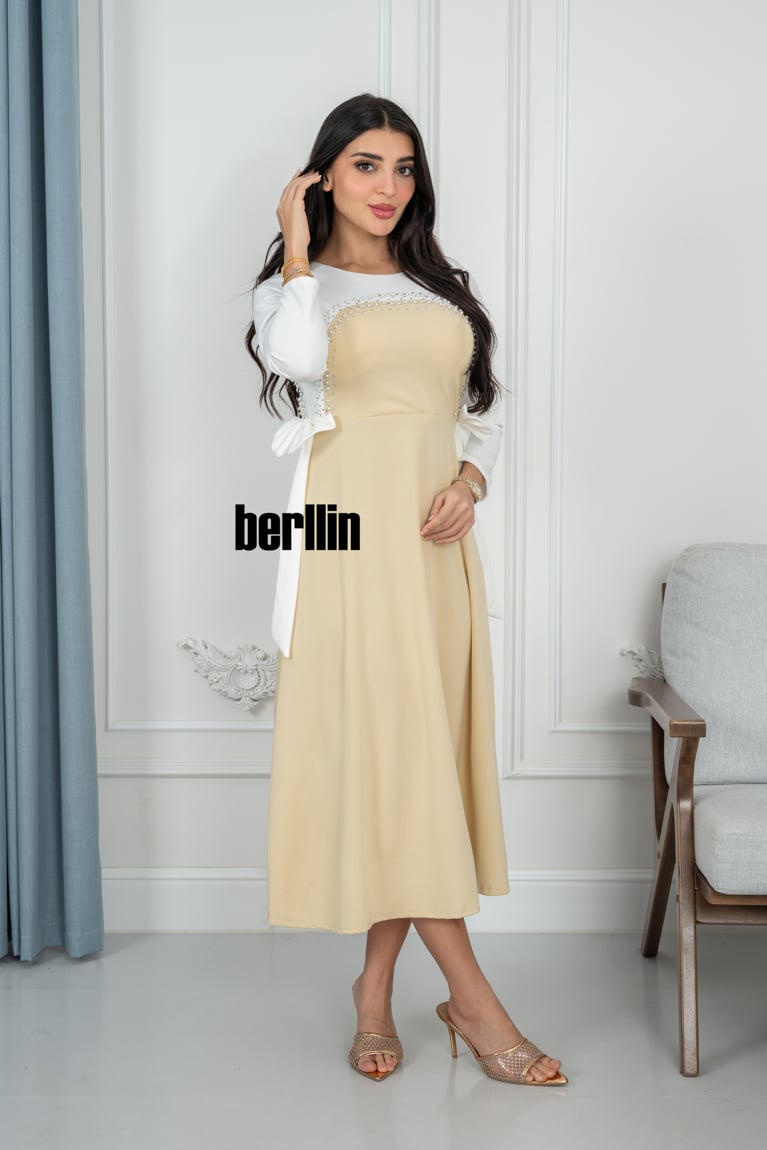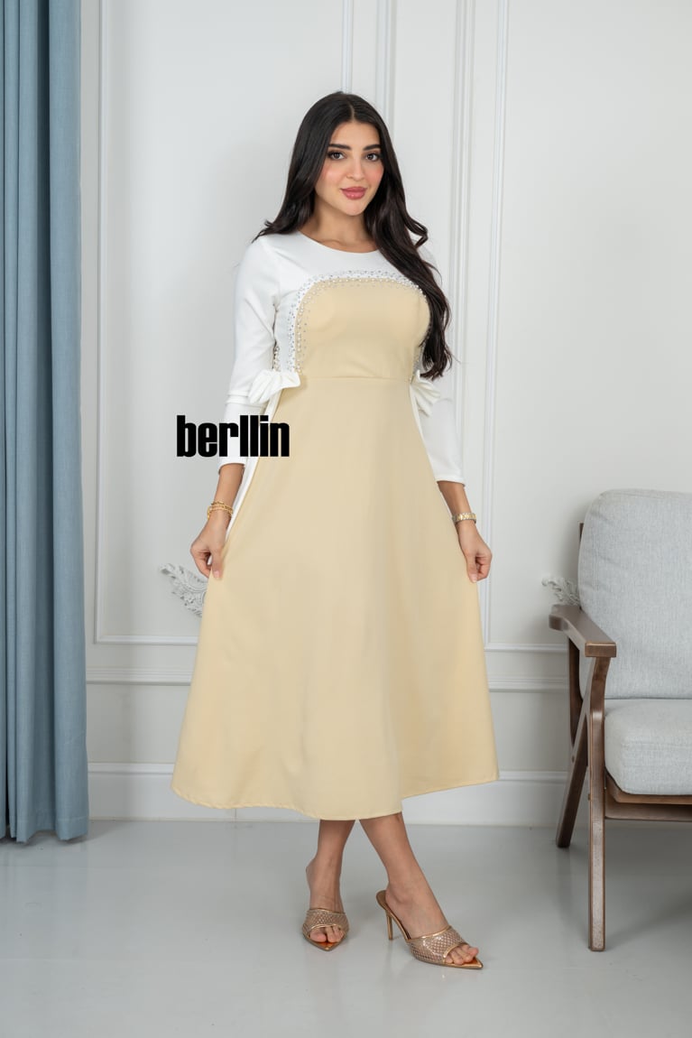 يتميز بتصميم أنيق وناعم مع لمسات عصرية. الجزء العلوي مزين بحبات اللؤلؤ البيضاء التي تضيف لمسة من الفخامة والرقي. الأكمام الطويلة باللون الأبيض تُكمل التصميم بتباين جميل، بينما الرباطات الجانبية تضيف عنصرًا عصريًا وانسيابيًا. القَصّة متوسطة الطول تجعل الفستان مناسبًا للمناسبات النهارية أو المسائية، ويمكن ارتداؤه بأسلوب بسيط أو مع إكسسوارات لإطلالة أكثر تألقًا.