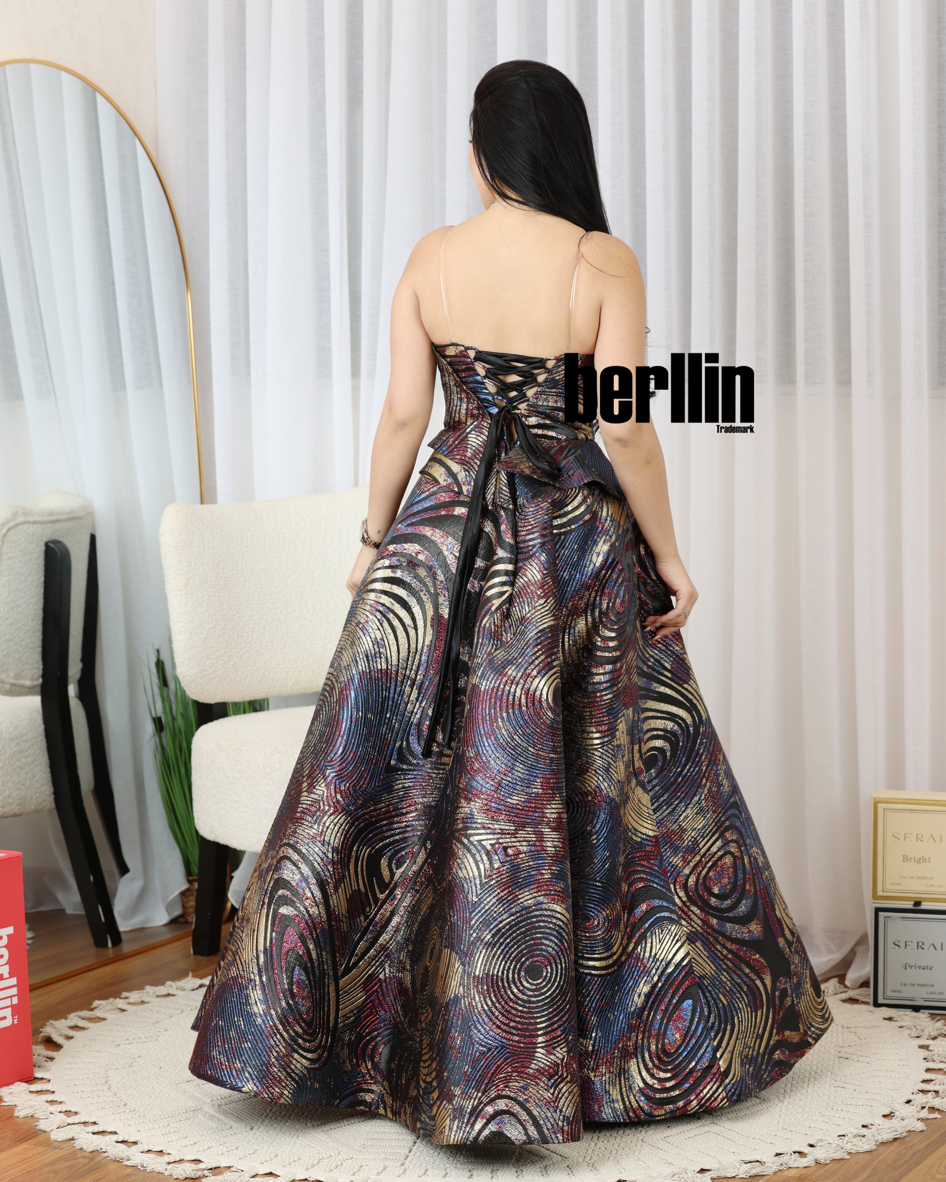 يتميز فستان السهرة من برلين بتوب سهرة مزخرف بالبروكار لتضفي لمسة ساحرة على مظهرك في المناسبات الخاصة. ويأتي مصنوعًا من تفتة روسي الفخم مسامي يمنحك إطلالة راقية عند تنسيقه مع مجوهرات وحذاء بكعب مرتفع وسيور.