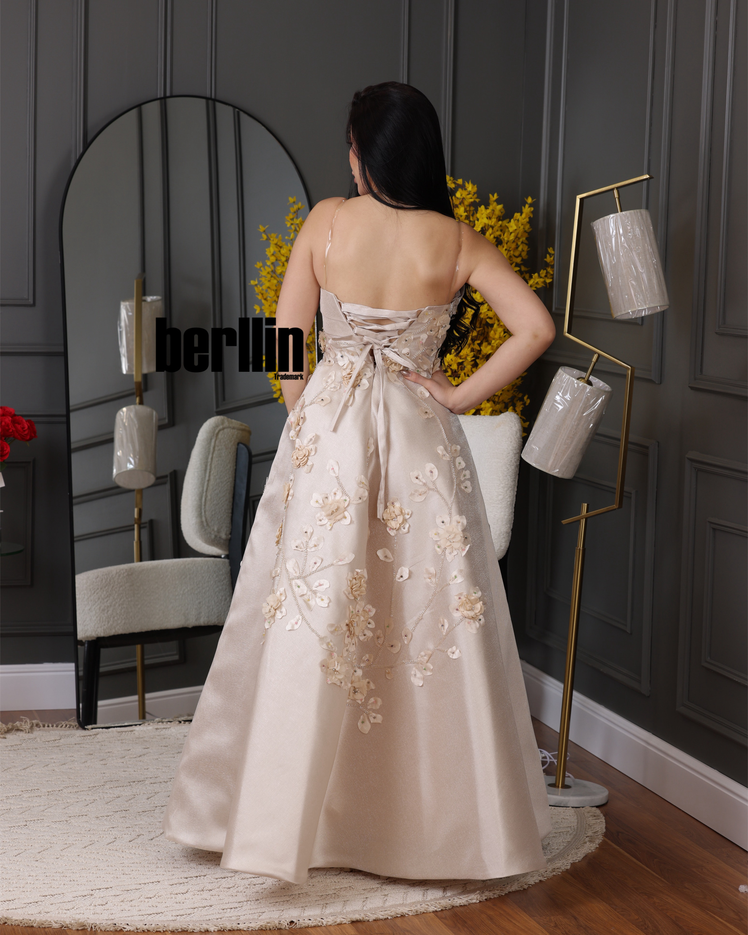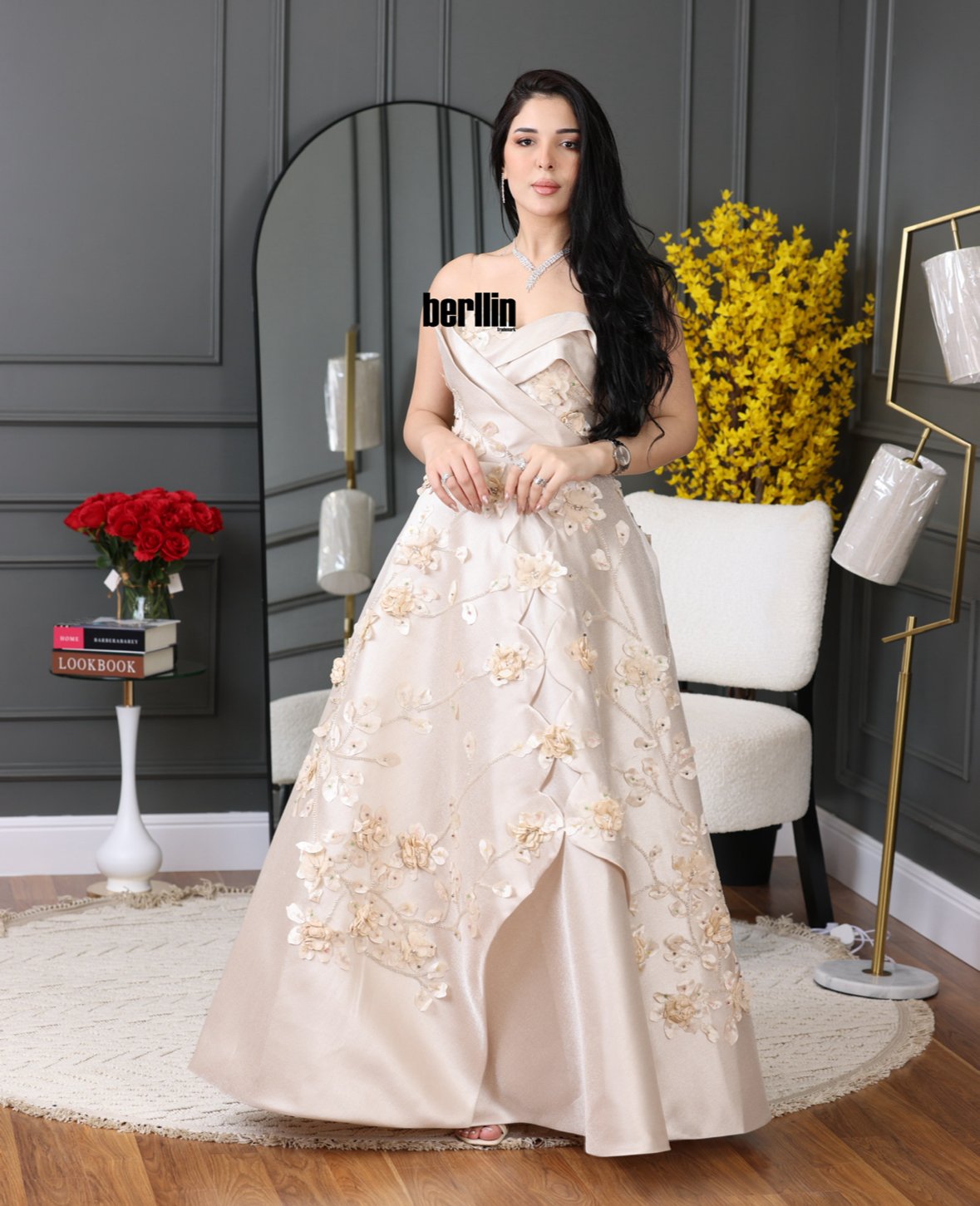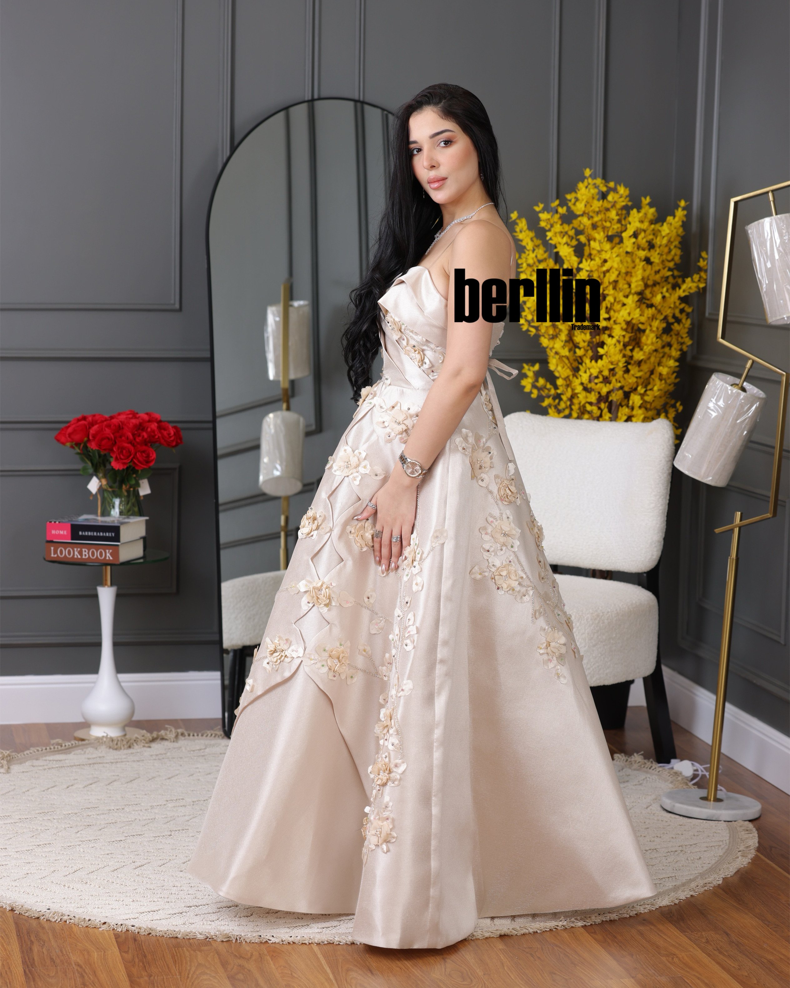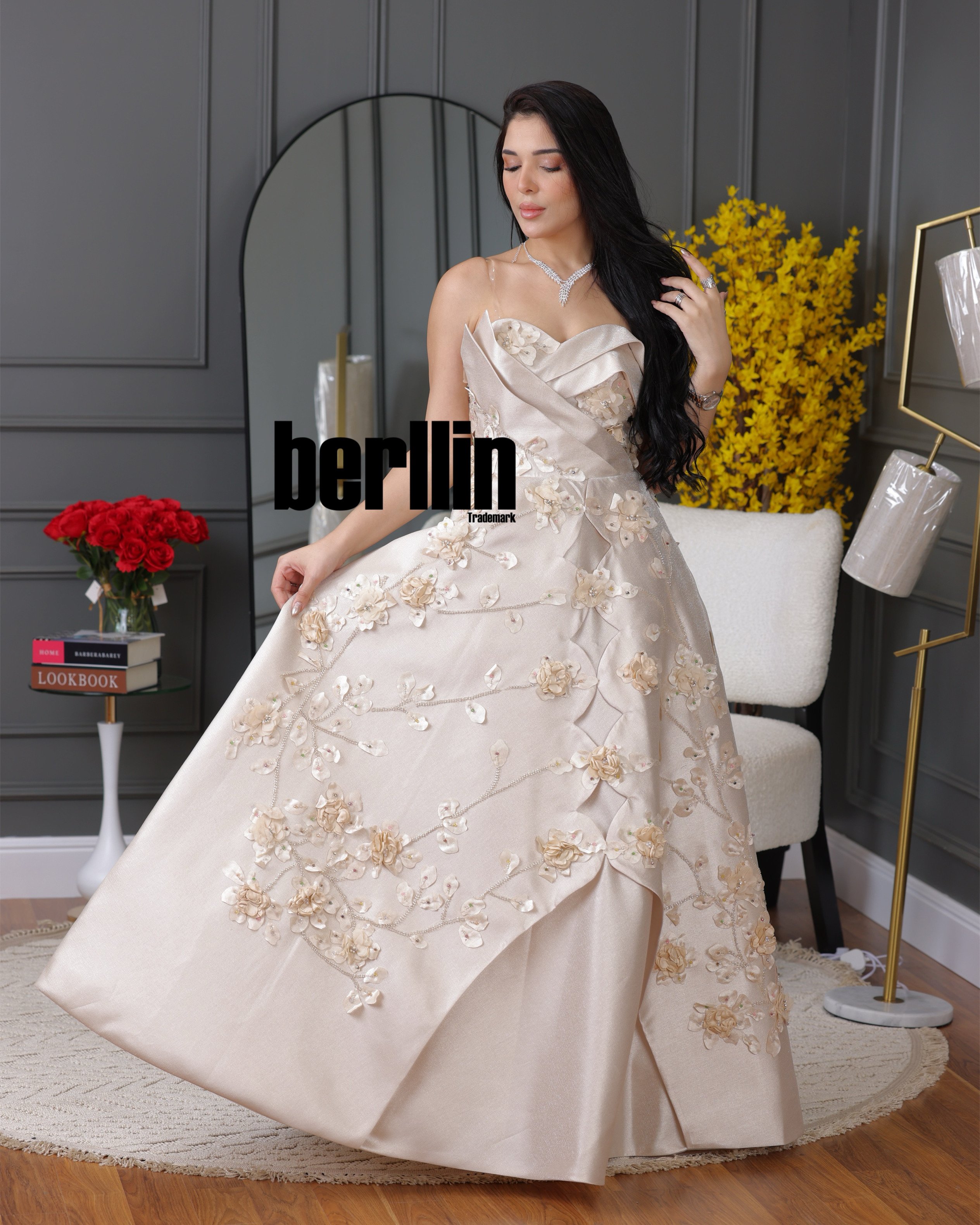 نوع التصميم: فستان توب بيج مزين بالورد البارز الفانلي الفخم