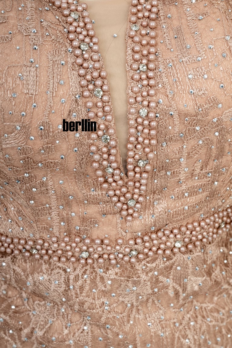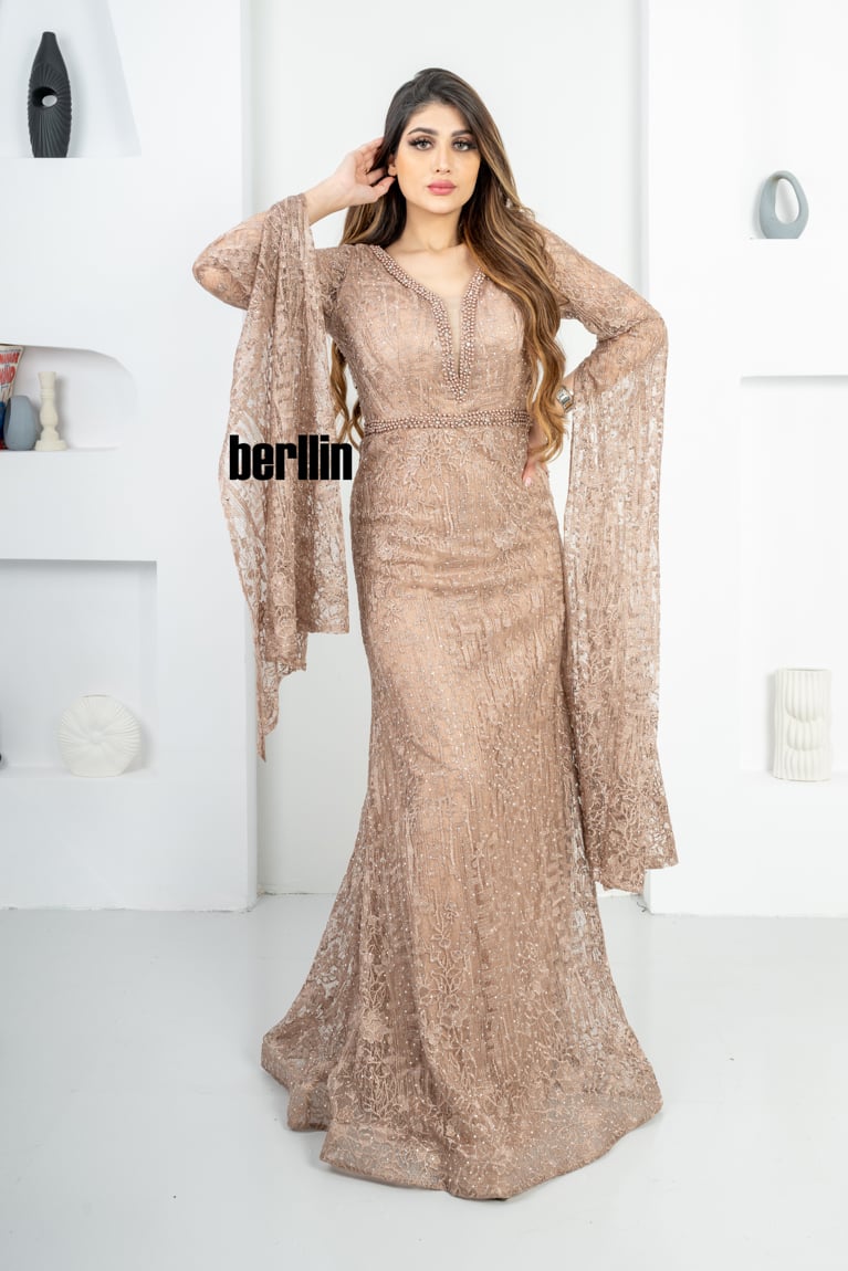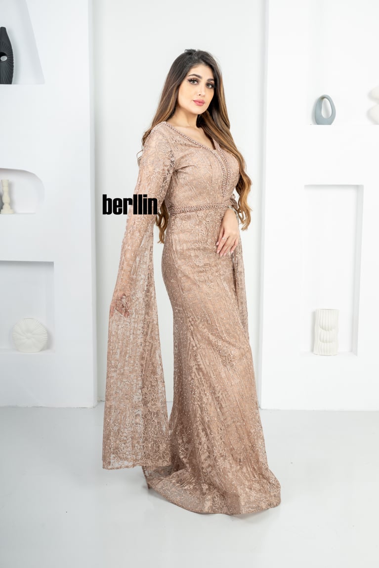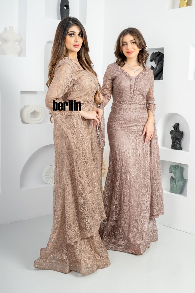 نوع التصميم: فستان سهره طويل بأكمام كيب مطرز ومزين بالفصوص