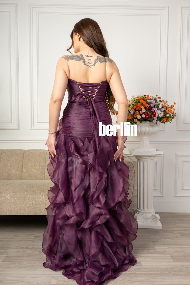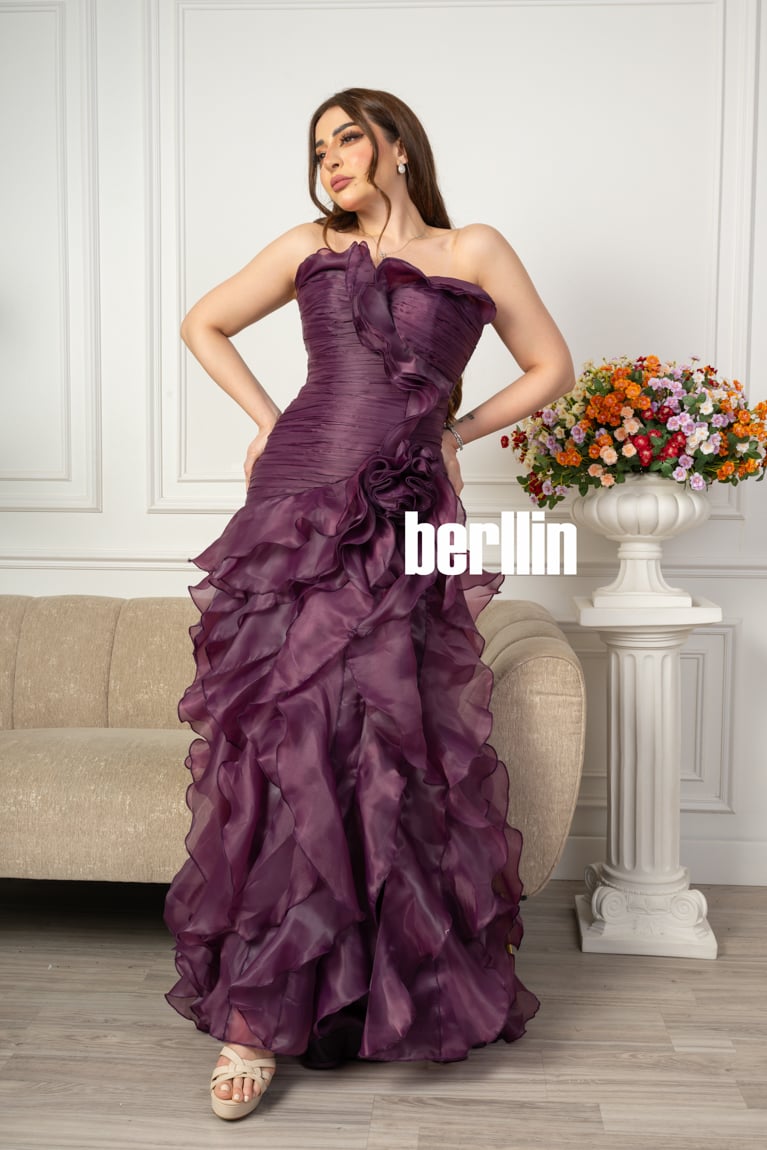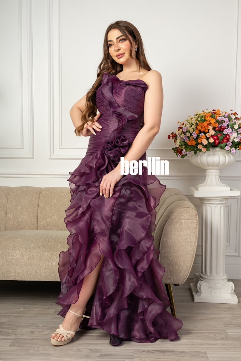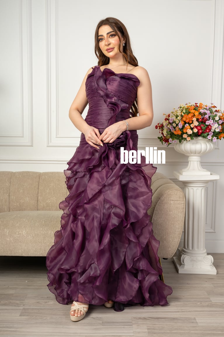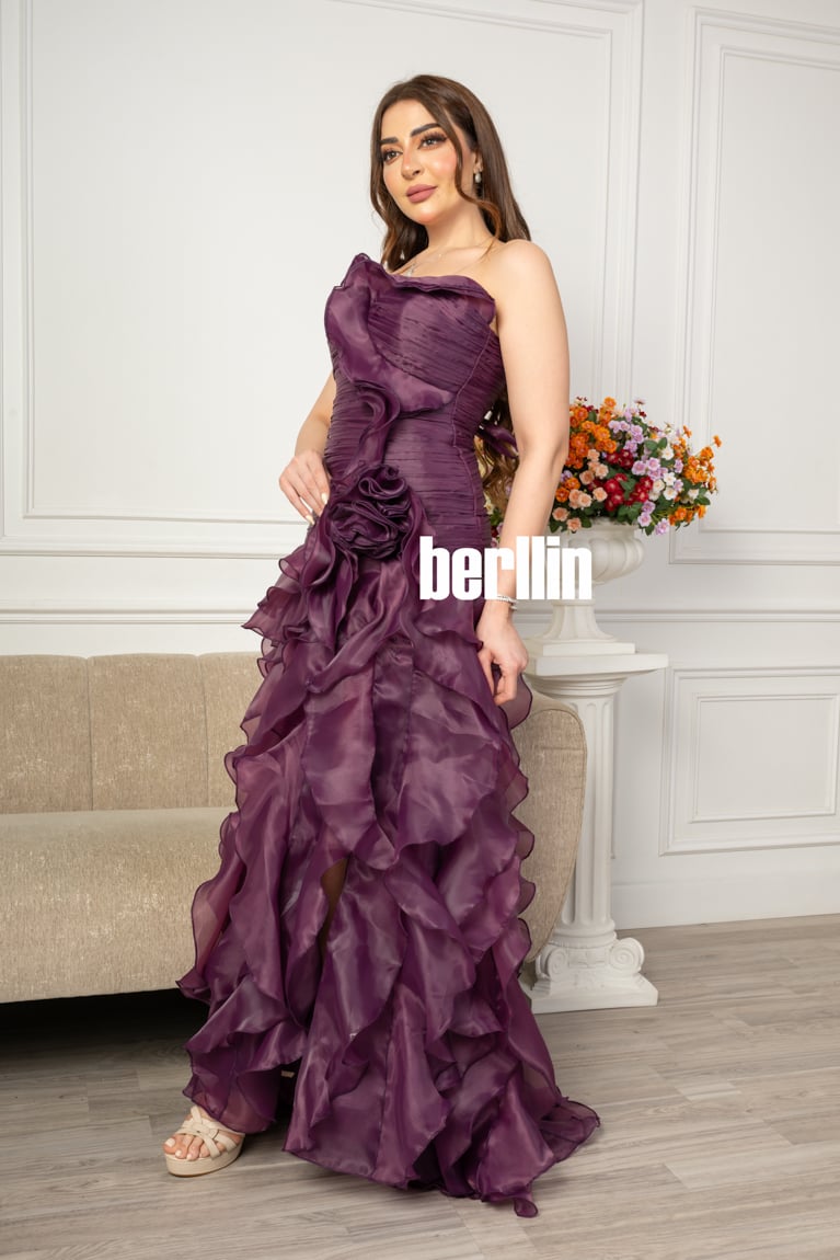 نوع التصميم: فستان سهرة بأكتاف مكشوفة وكشكش