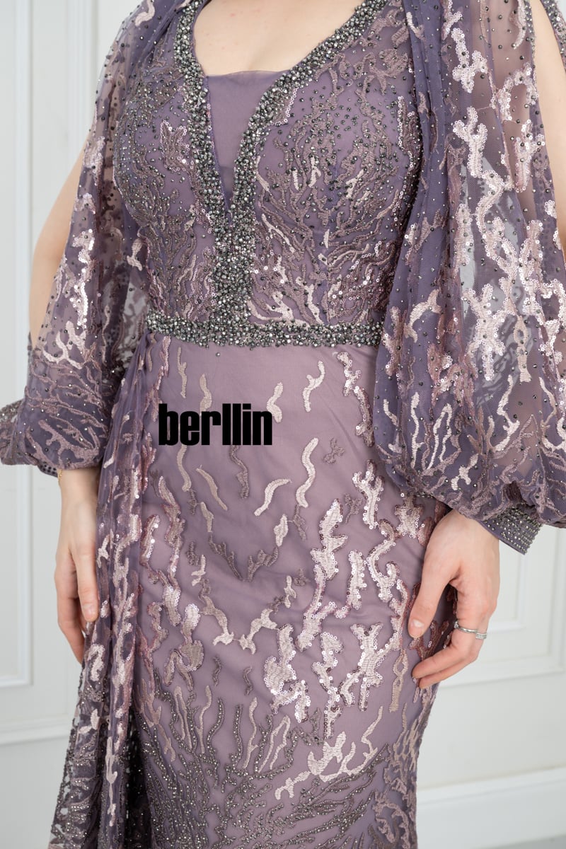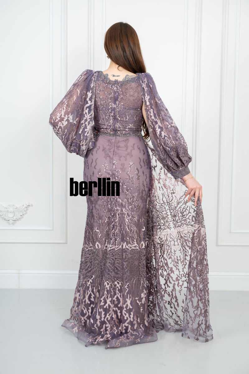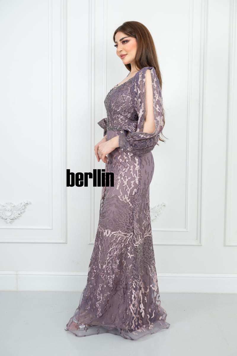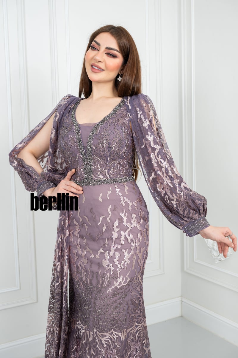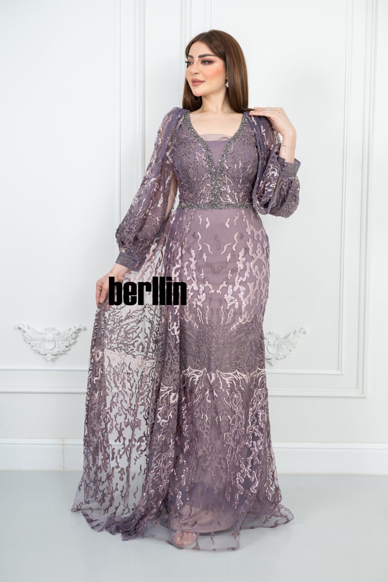 يأتي الفستان بلون ملكي فاخر يجمع بين درجات الأرجواني الداكن ولمسات من اللمعان الأنيق، ما يجعله خيارًا مثاليًا للسهرات والمناسبات الفخمة. يمكن تنسيقه مع مجوهرات فضية أو ذهبية لإبراز جماله الفريد.