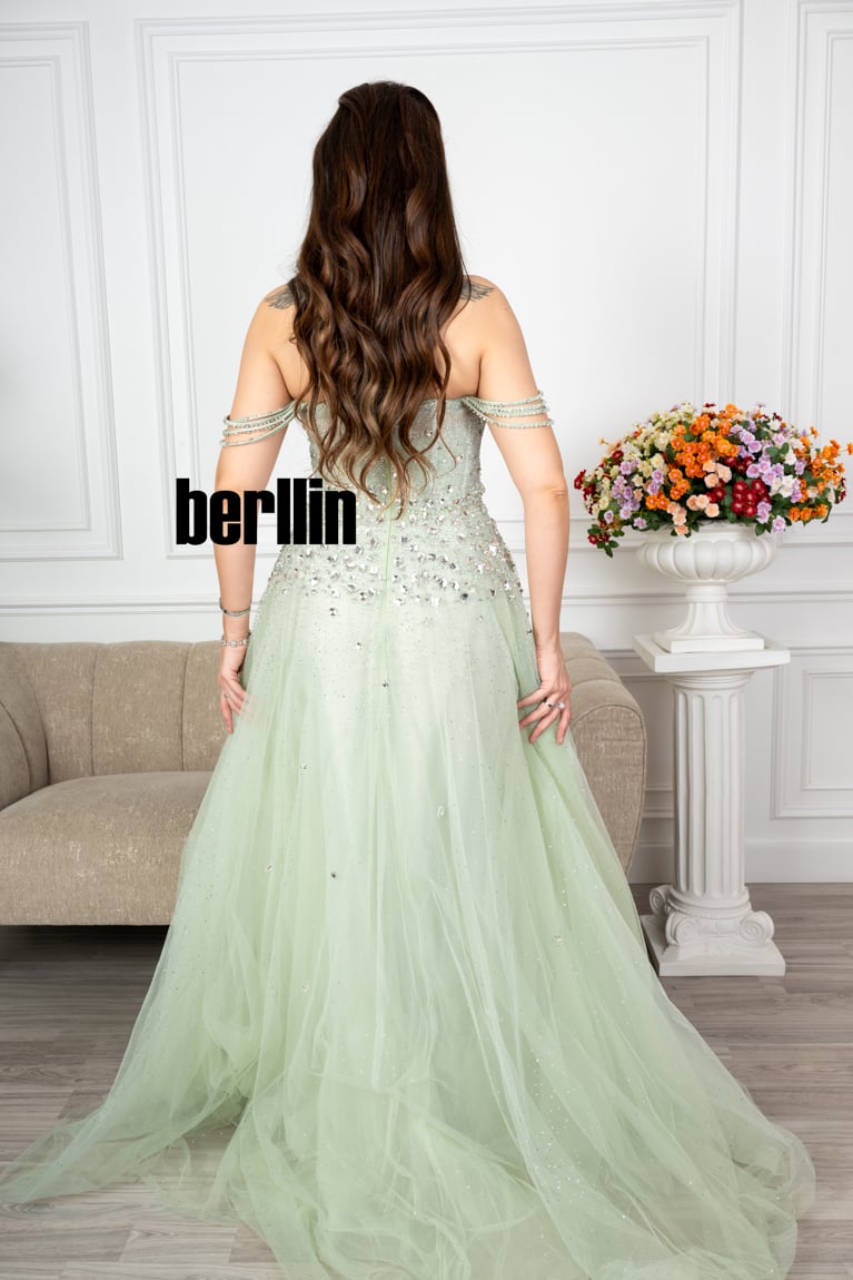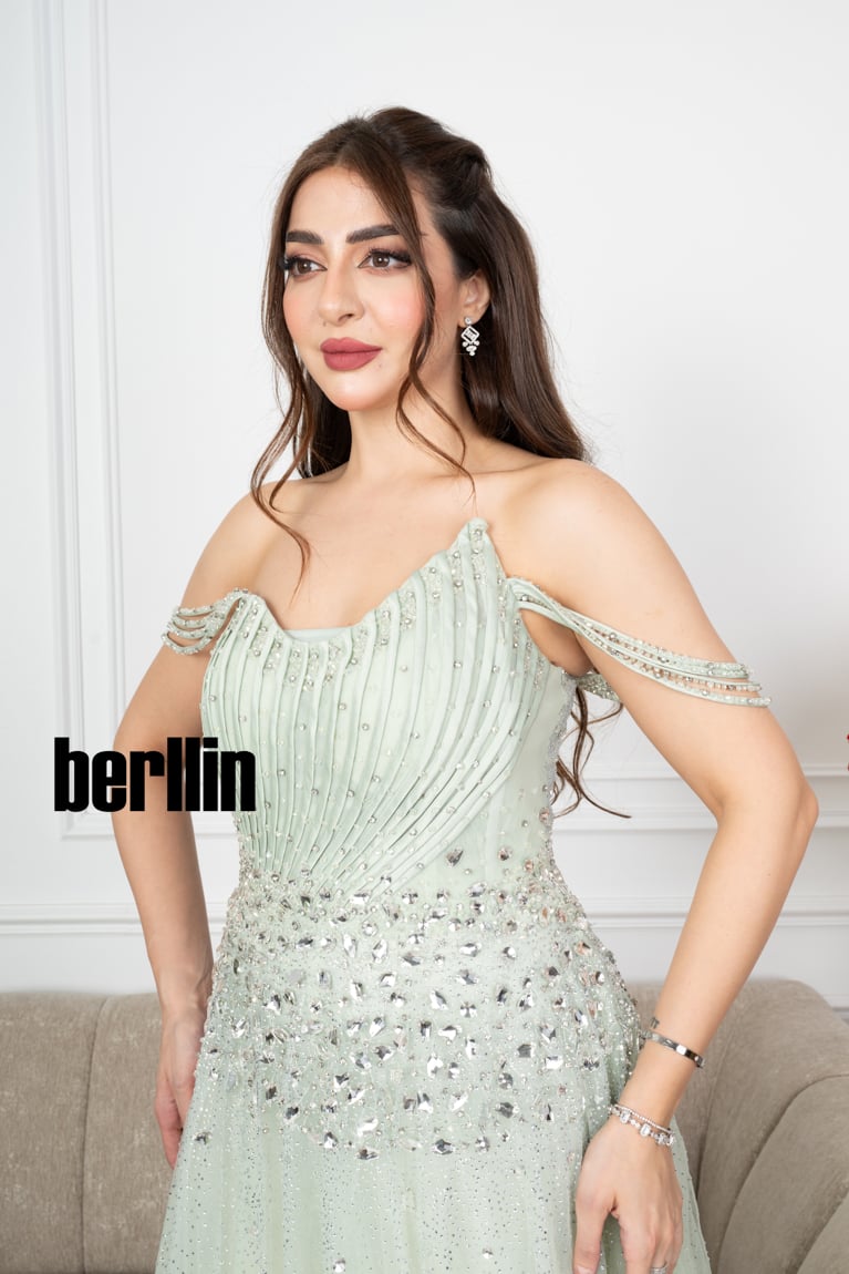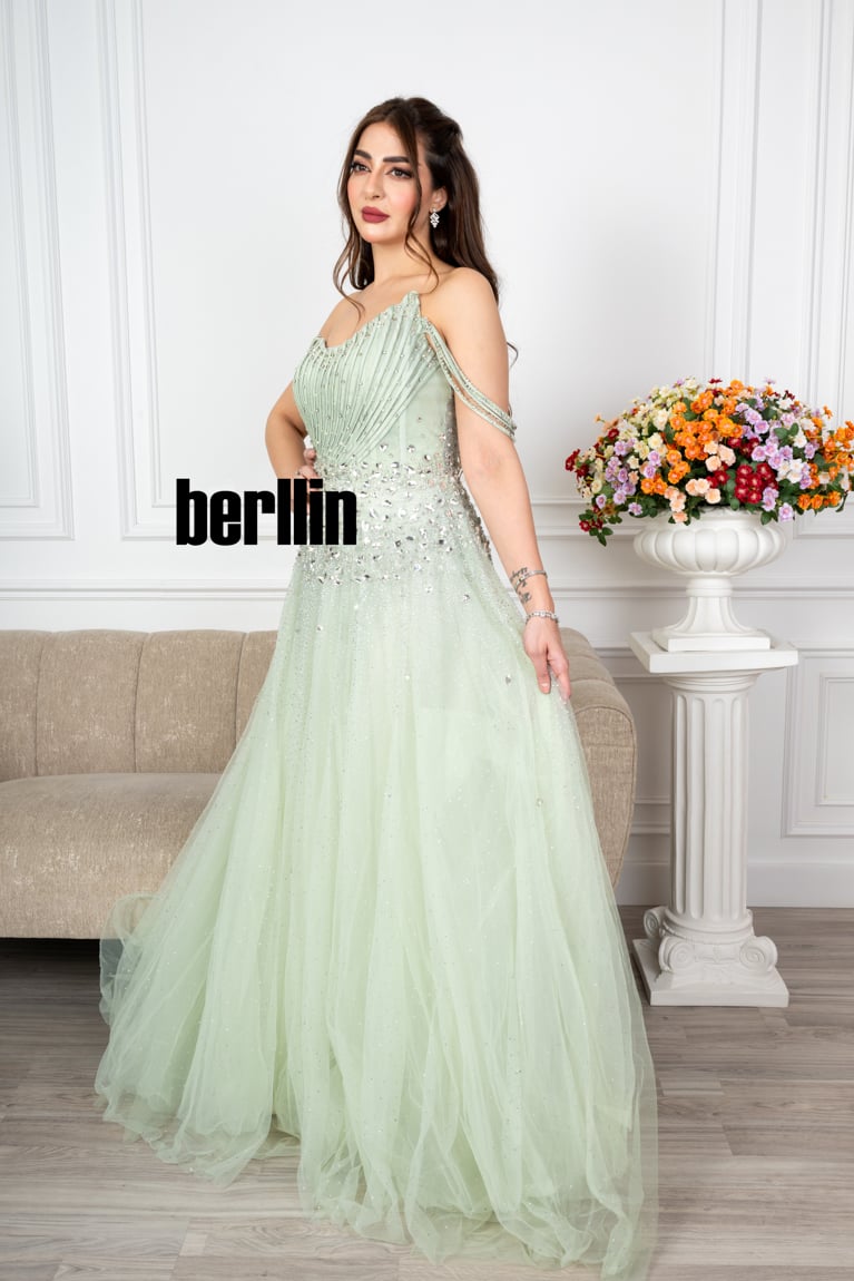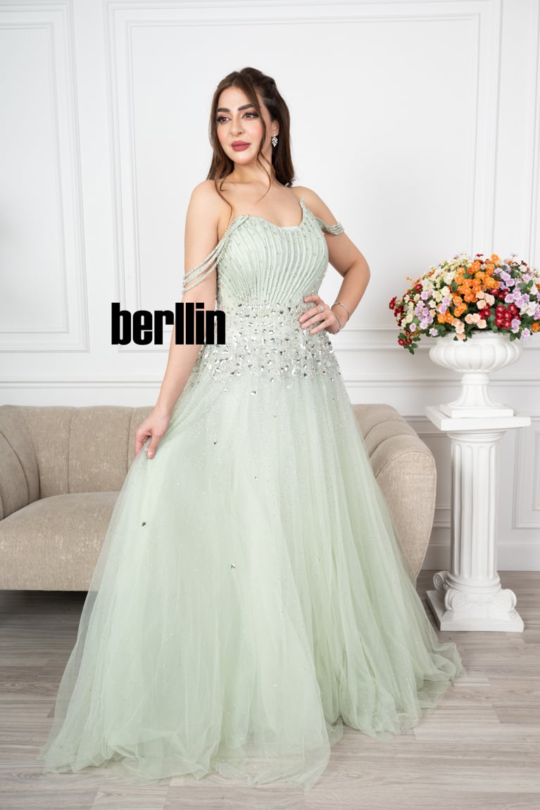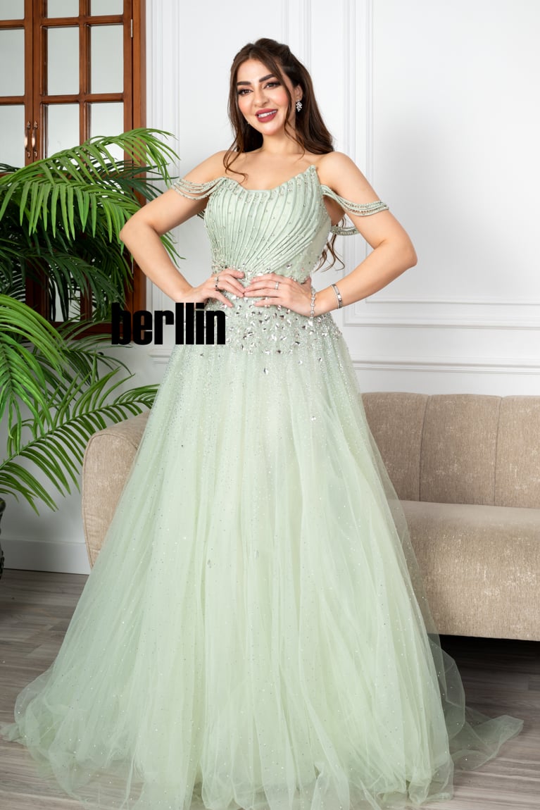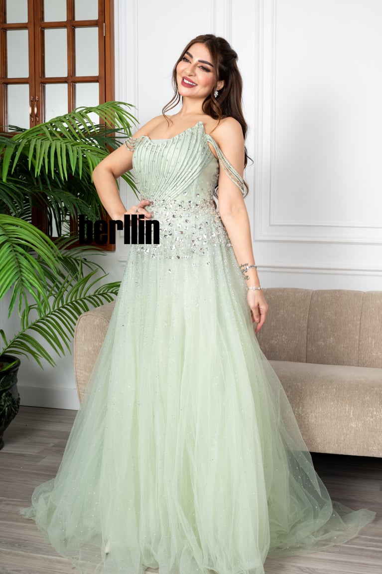 اكتشفي فستان سهرة طويل مميز بتطريز فخم لون تفاحي فاتح رائع وقصة عصرية. مثالي لإطلالة أنيقة ومتوفر بجميع المقاسات.