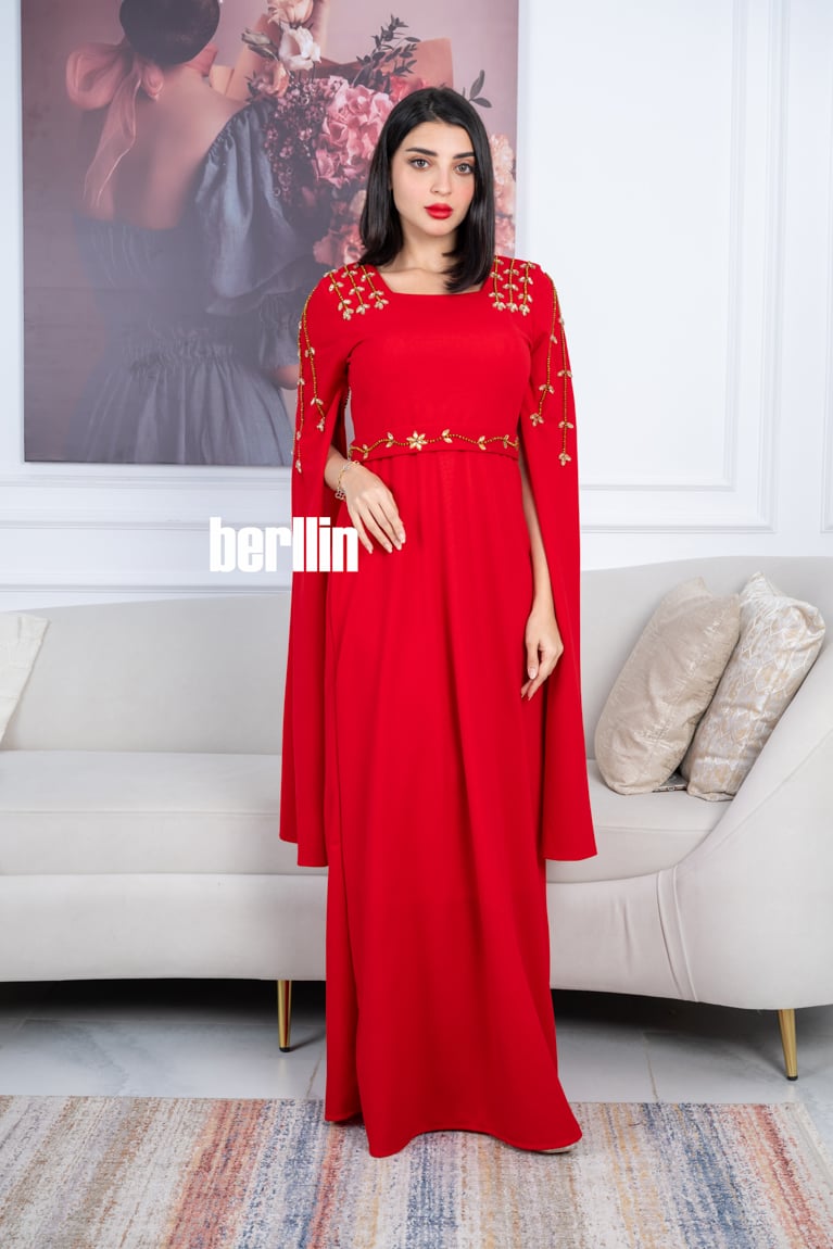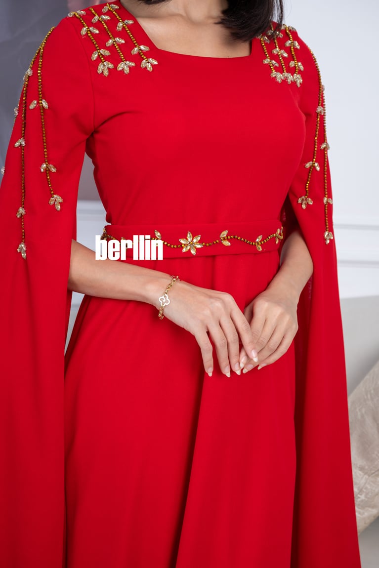 فستان أحمر طويل بأكمام كيب مزينة بكريستال