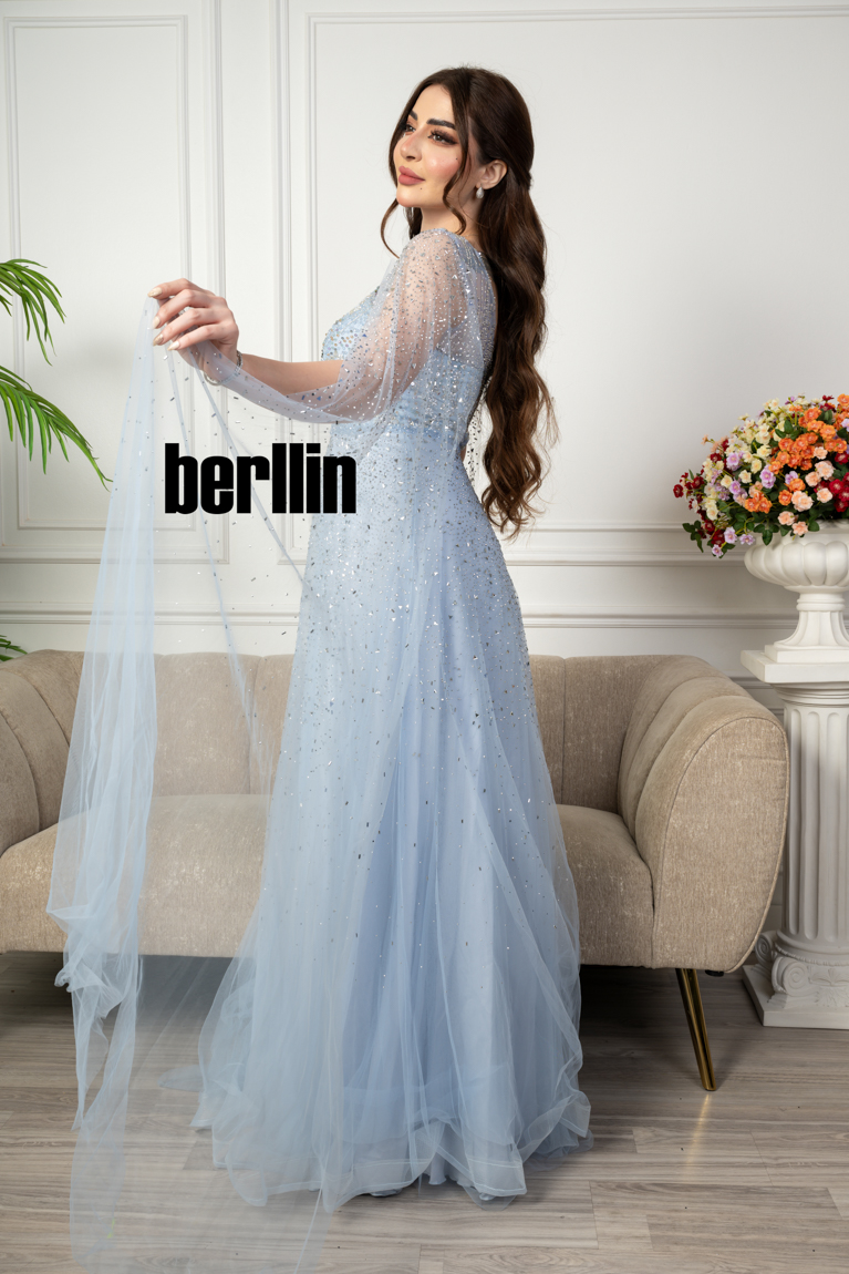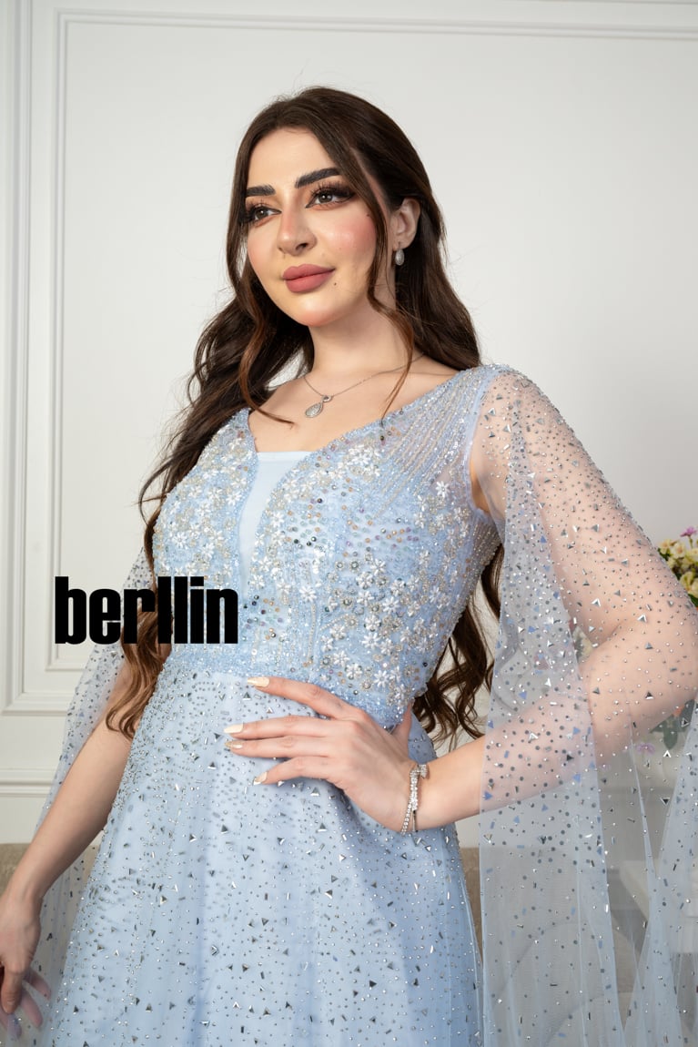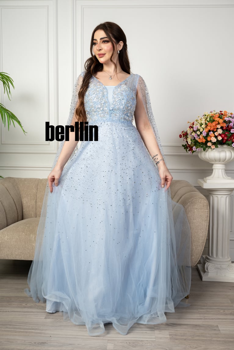 اكتشفي فستان سهرة مميز بتطريز من خامة التل الامع بأكمام كيب لون سماوي رائع وقصة عصرية. مثالي لإطلالة أنيقة ومتوفر بجميع المقاسات.