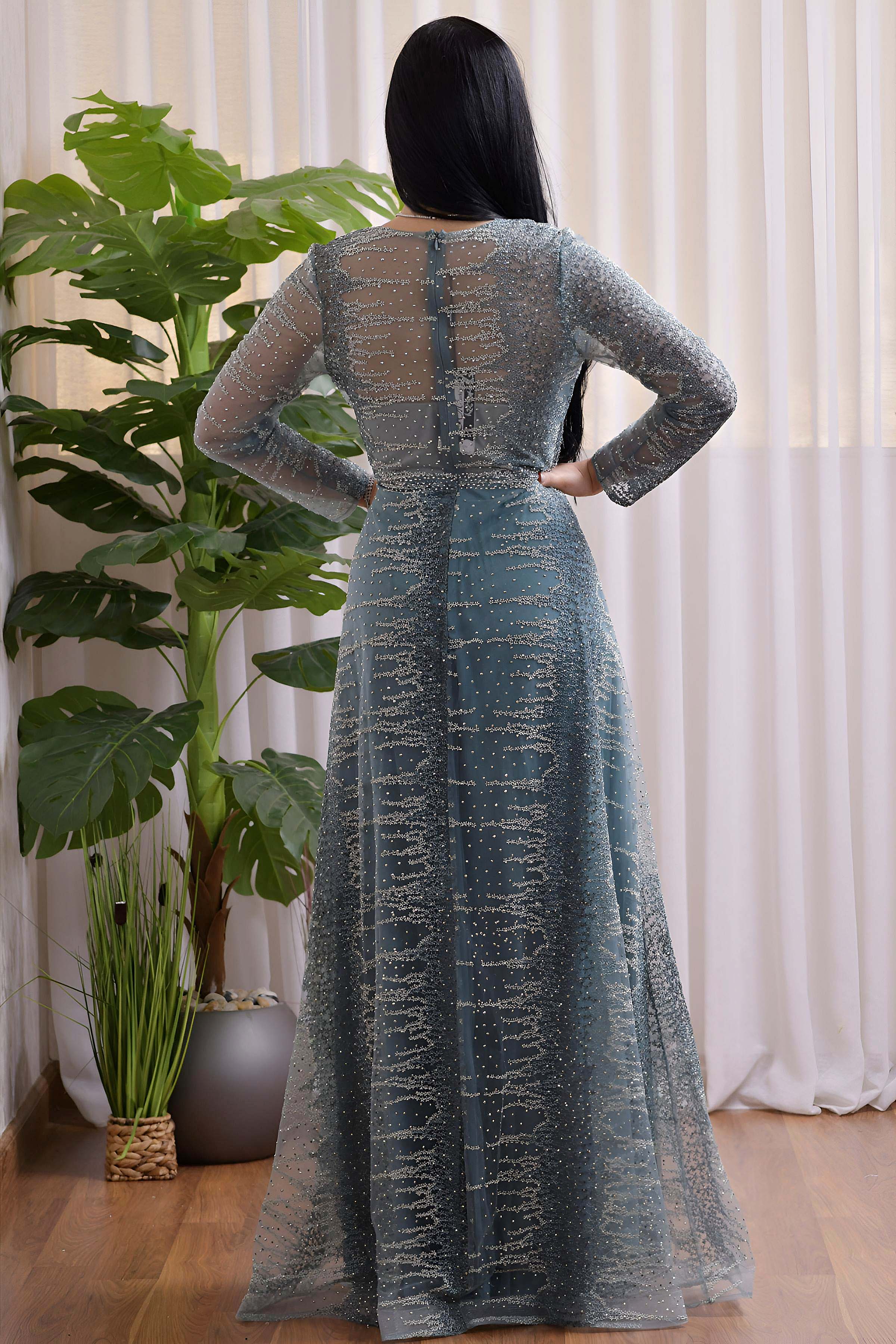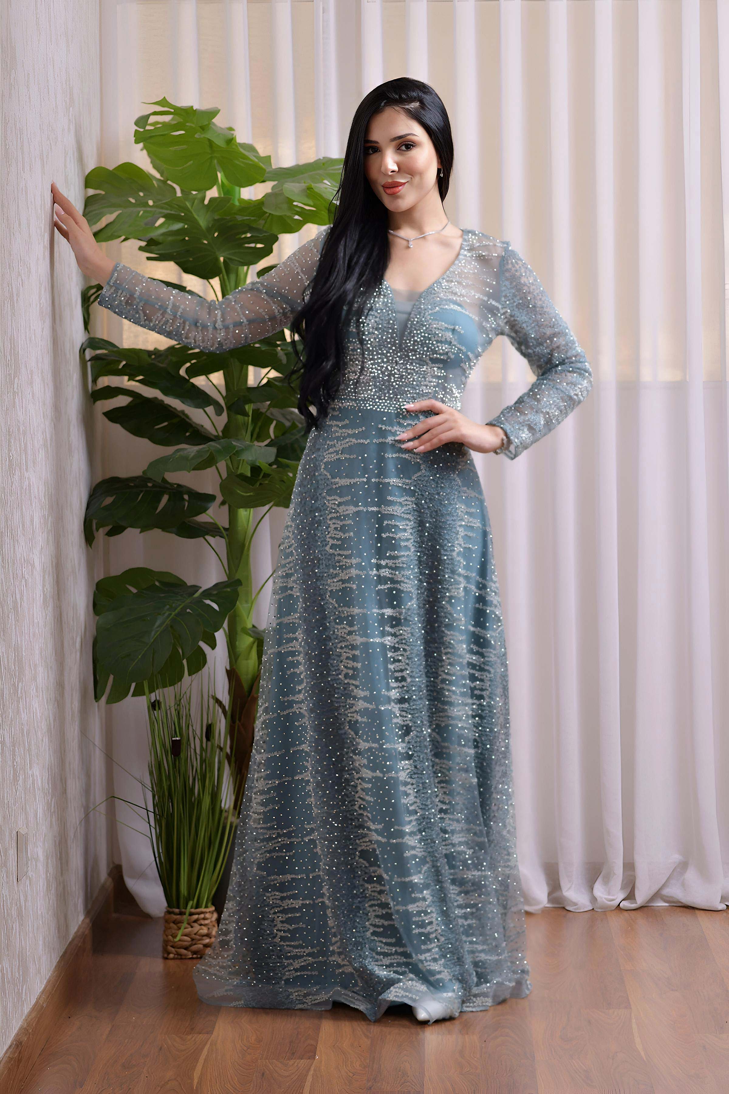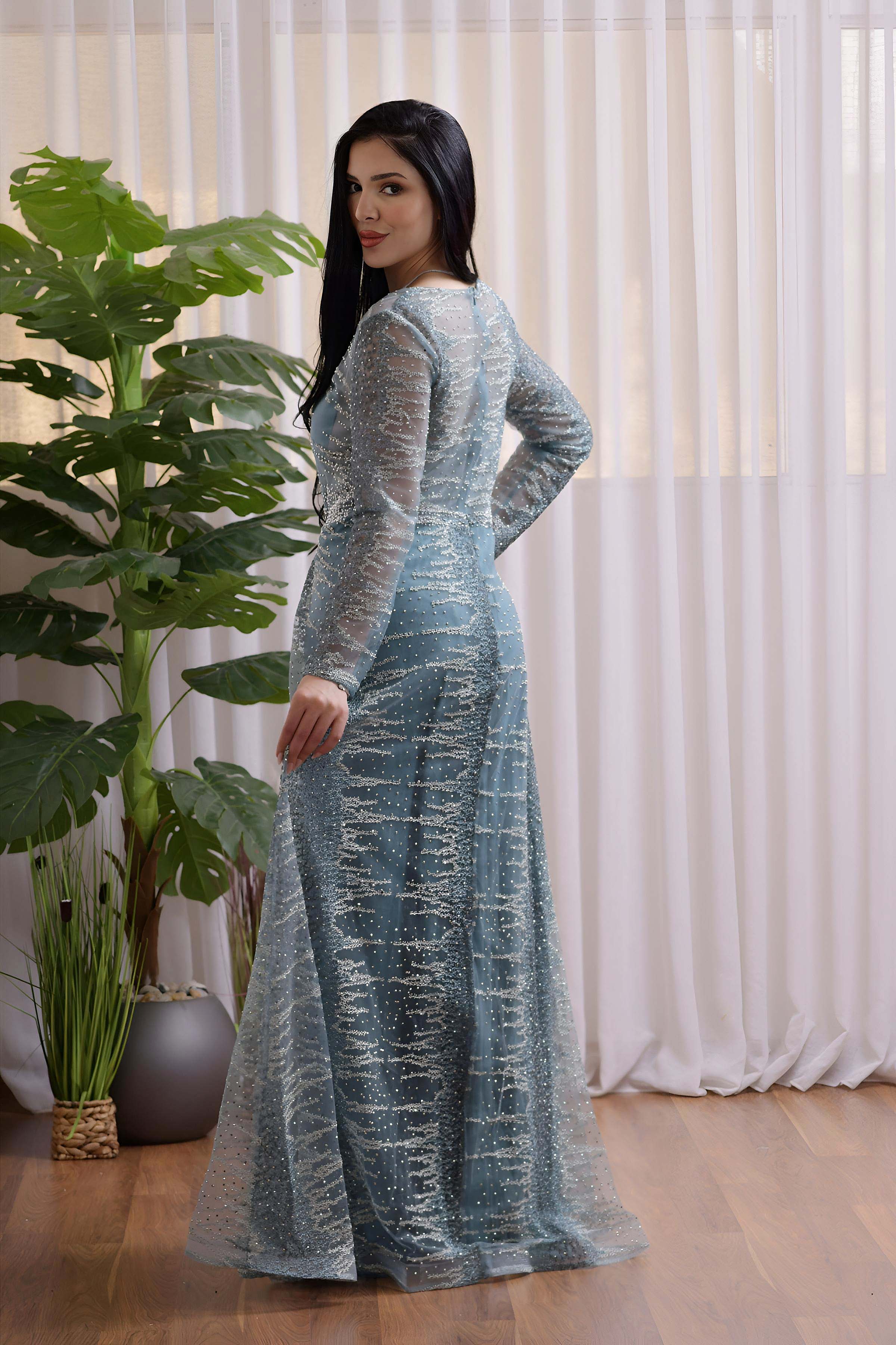 فستان سهرة بلون أزرق ضبابي أنيق، مطرز بخيوط فضية تلمع مع كل حركة. قصة انسيابية تبرز القوام، وأكمام شفافة بتفاصيل راقية تمنحك إطلالة ملكية في كل مناسبة.