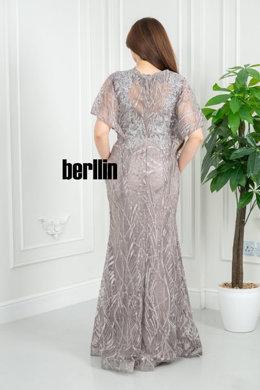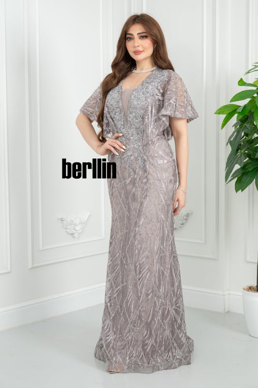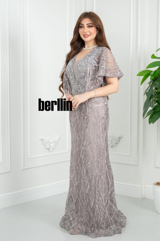ينسدل هذا الفستان الرمادي الموف كنسمة ليلٍ باردة؛ تلمع خرزاته كندى فضيّ يغمر الزهور، بينما يرفرف الكاب الفراشيّ حول كتفيك ليترك خلفك هالة سحر ناعم لا يُنسى.
