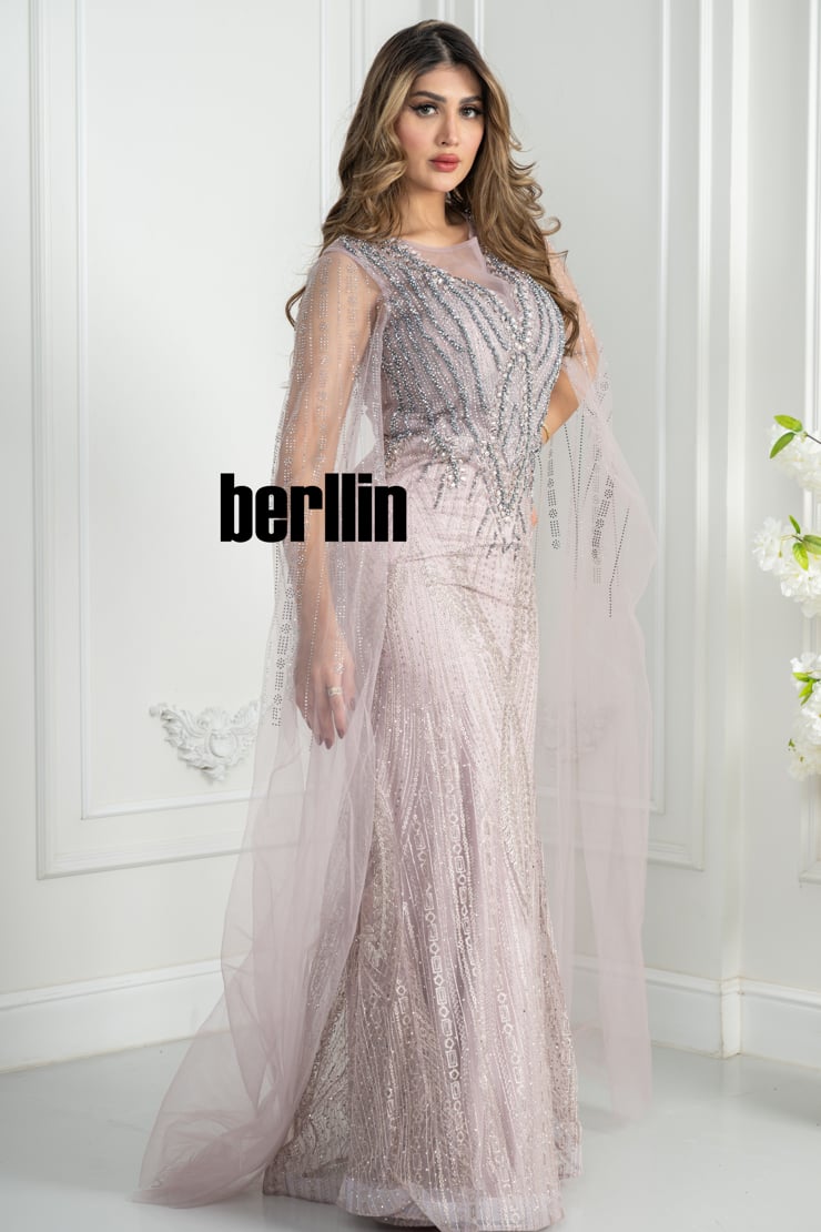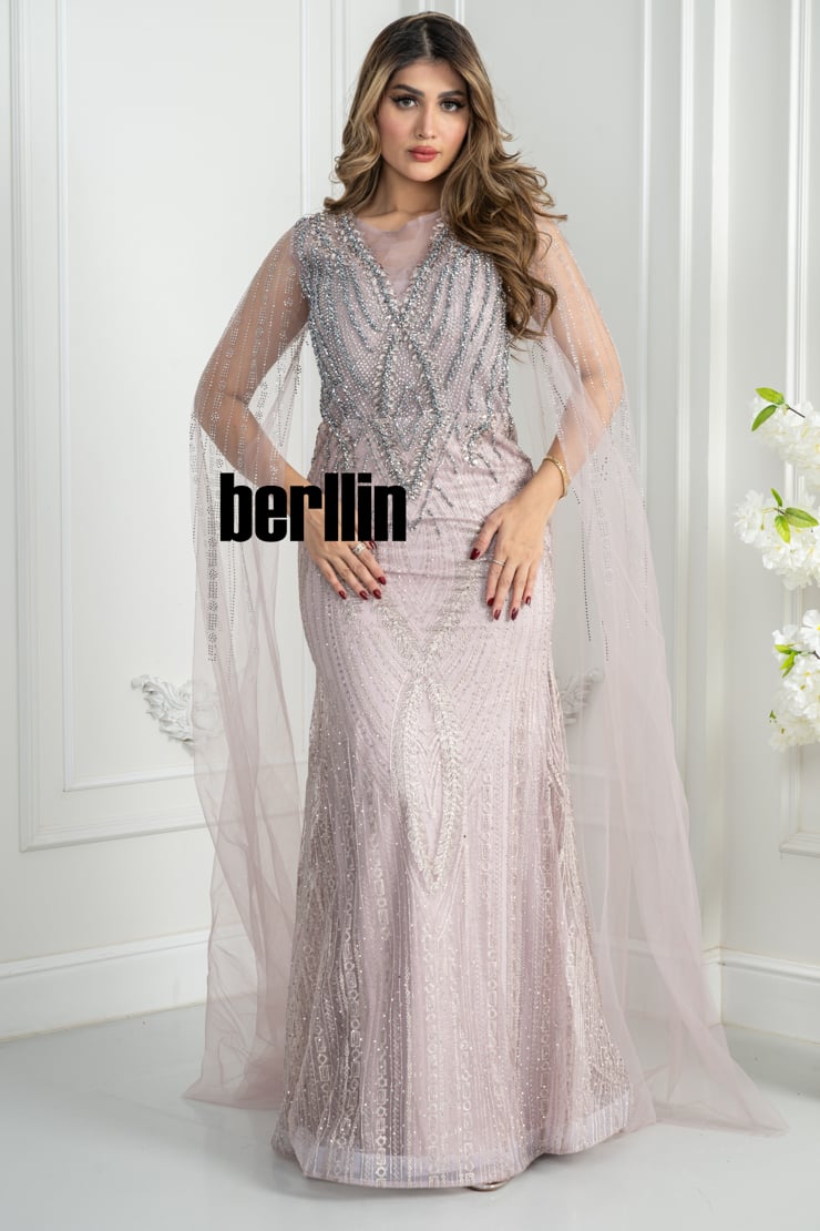 A luxurious mauve-pink evening dress that combines a subtle sheen with a long cape, adding a distinctly regal presence.