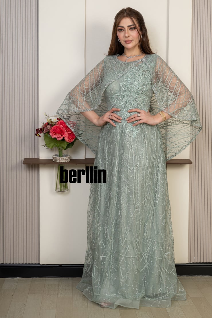 General Description: This elegant teak -green evening gown is a sophisticated and modern color that combines freshness and luxury, making it a highly sought-after choice for evening events and upscale occasions. The gown features shimmering embroidery covering the entire fabric, creating a balanced and feminine silhouette that exudes understated elegance.