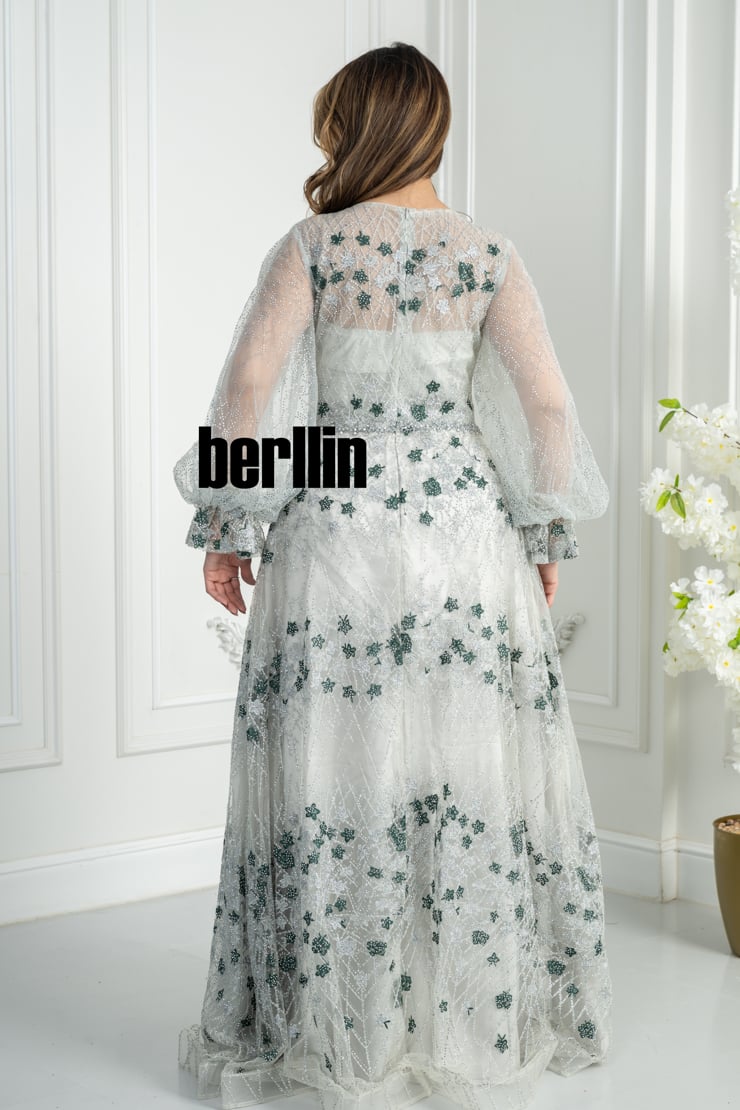 The white-gray dress gives a royal and sophisticated look, combining a calm sheen with a luxurious, understated design.