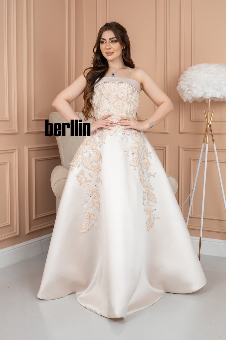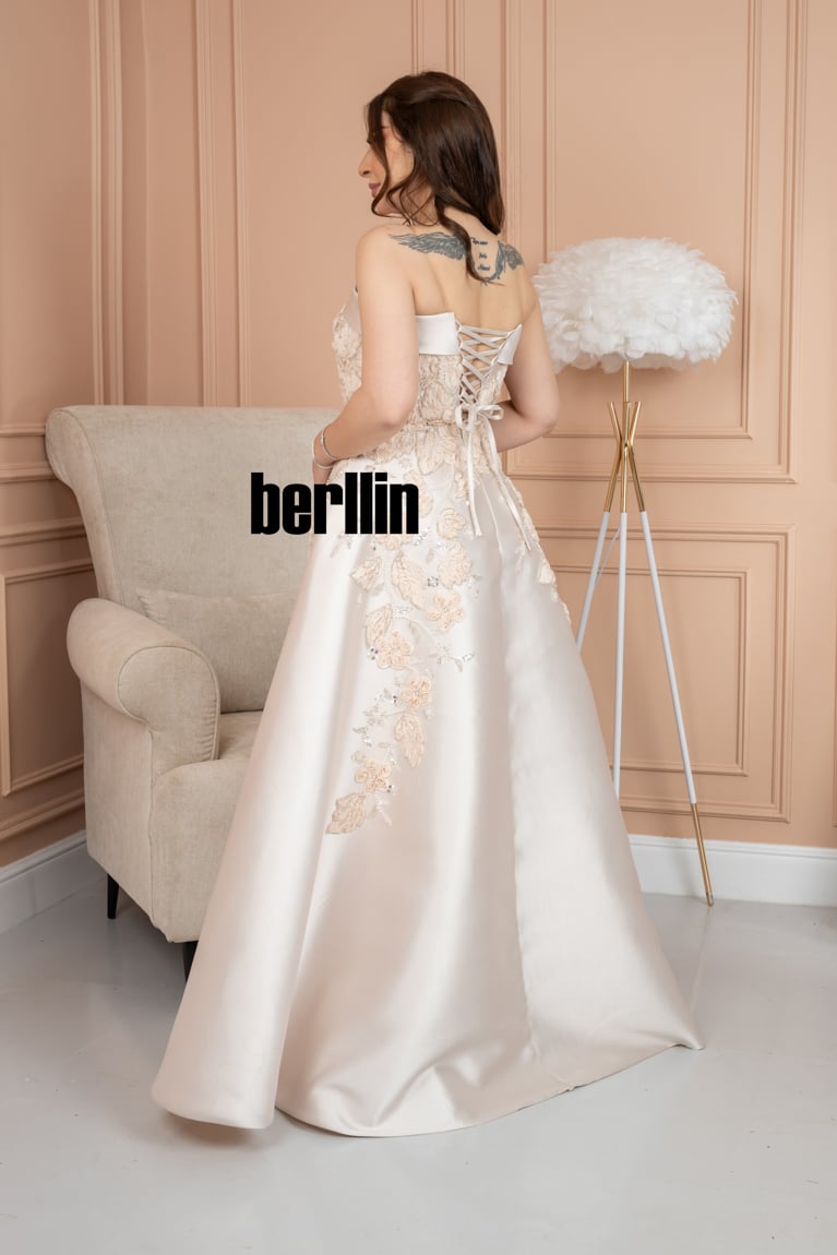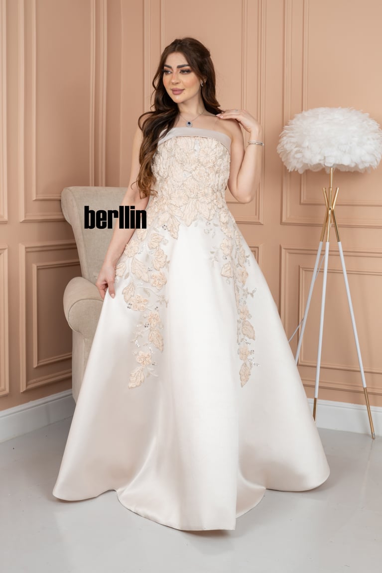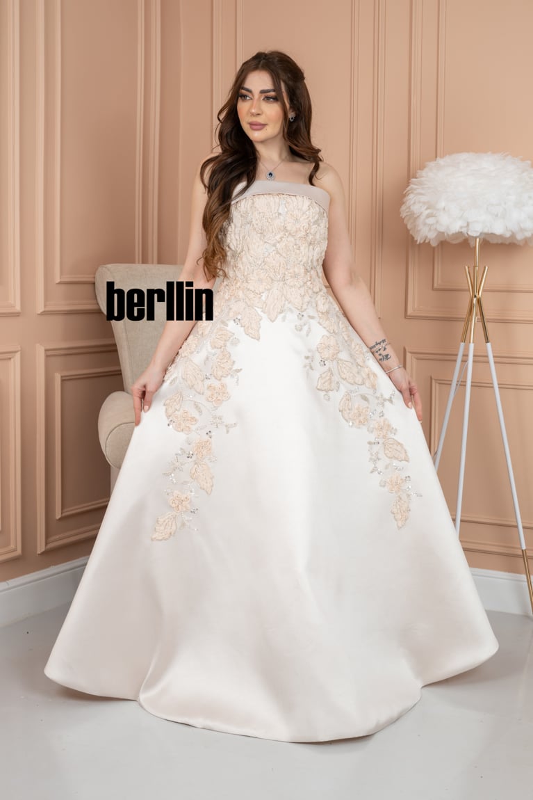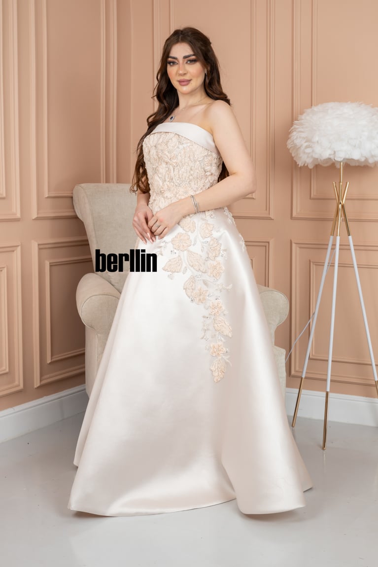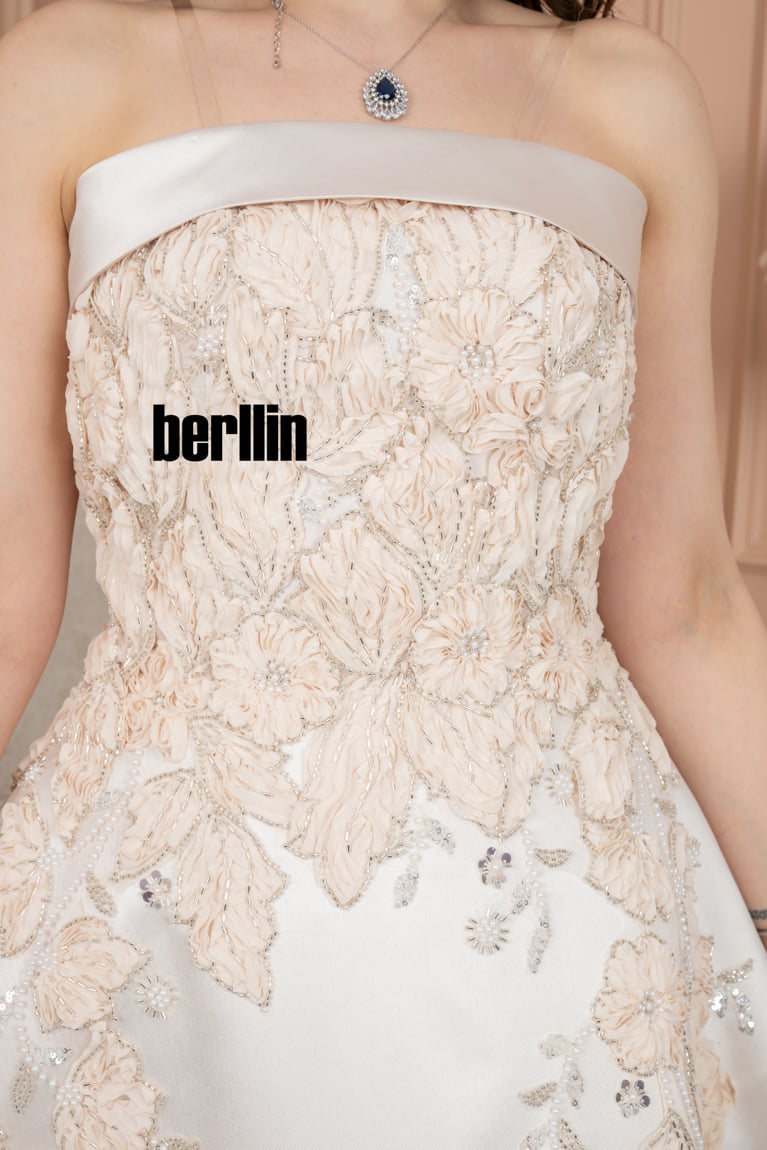يجمع فستان السهرة من برلين بين التصميم السهرة الفخم والحرفية الرقيقة، فهو مصنوع من جازار مسامي مزين بتطريزات زهور زخرفية رقيقة تكسبه طابعًا بارزًا. ويمكن تنسيقه مع حذاء بكعب مرتفع وكلاتش لإطلالة انسيابية تفيض بالرقة.