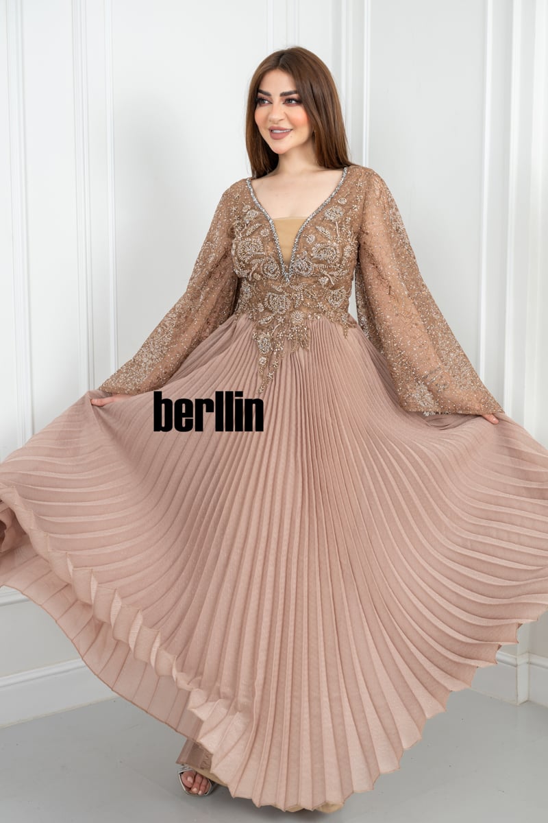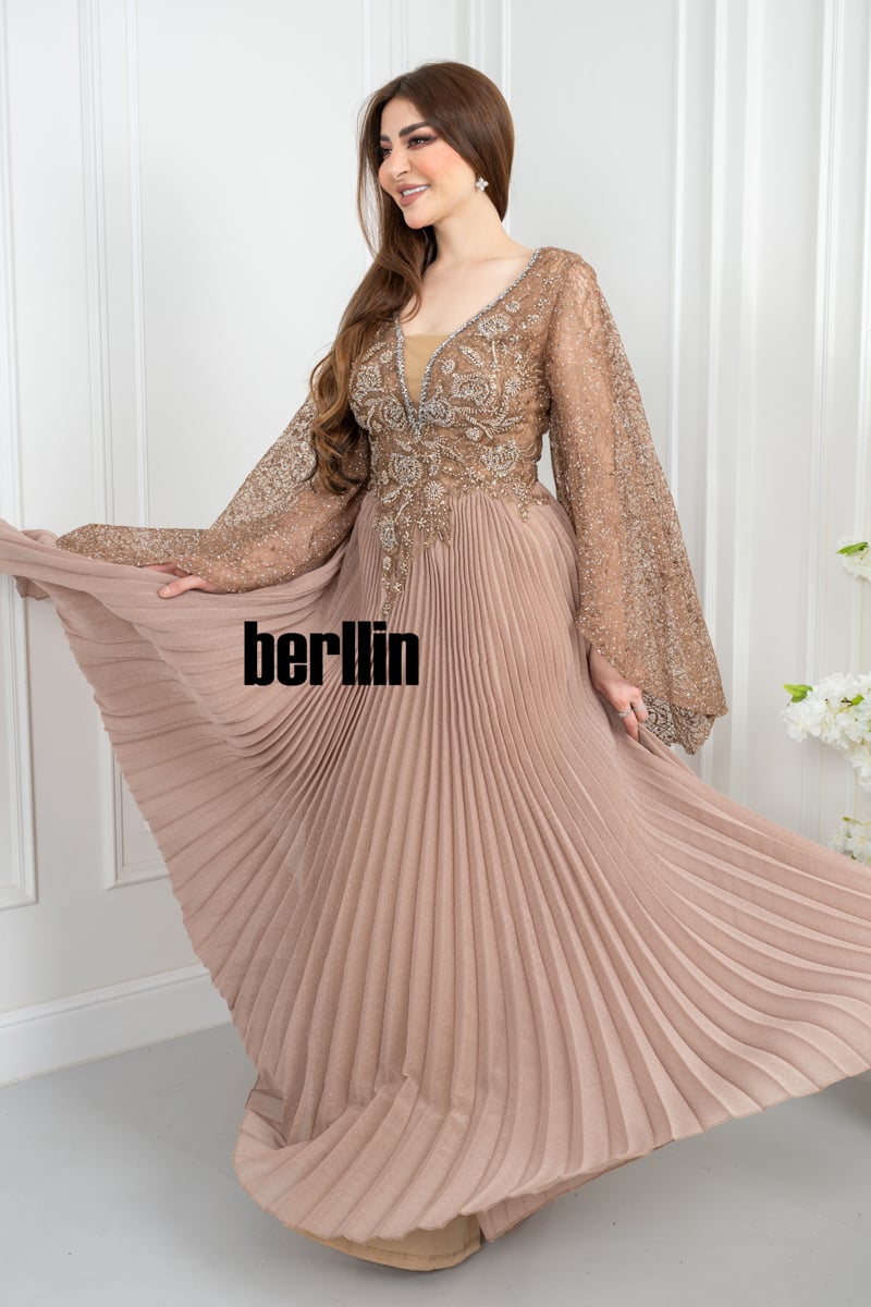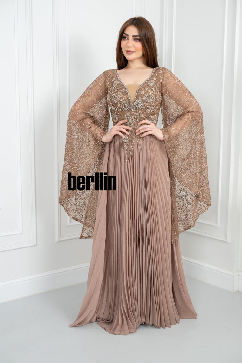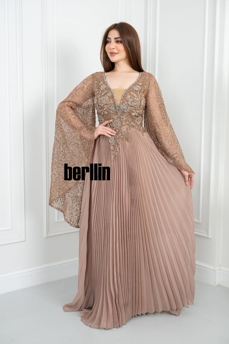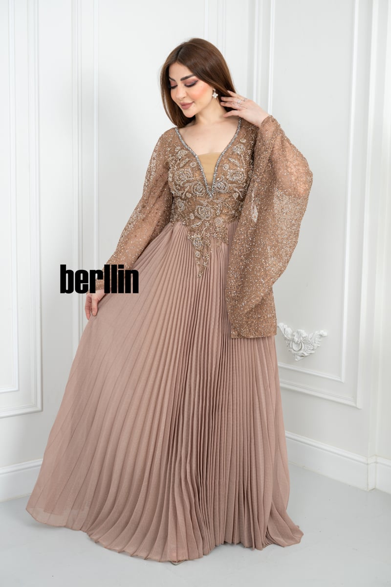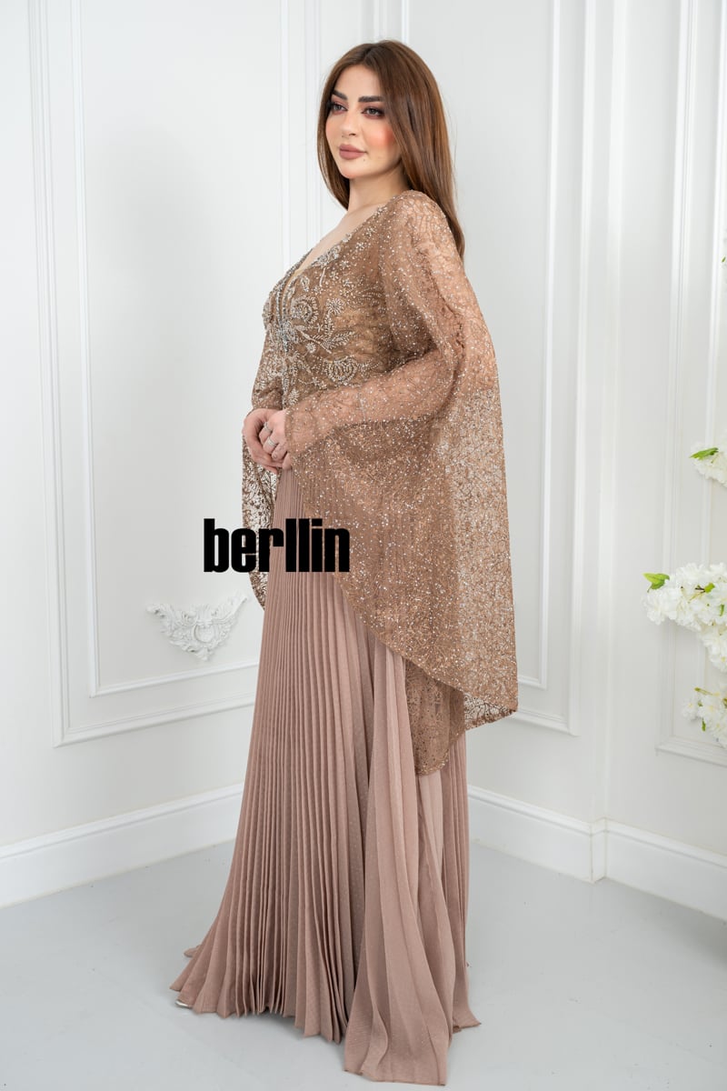 يتميز هذا الفستان بتصميم فاخر يجمع بين الأناقة والرقي، حيث يتألق بقصة انسيابية تمنح من ترتديه إطلالة راقية وجذابة. الفستان مكون من طبقتين رئيسيتين، حيث يبرز الجزء العلوي بتفاصيل غنية من التطريز اليدوي البارز، بينما تأتي التنورة بانسيابية راقية تمنح حرية الحركة وجمال الإطلالة.