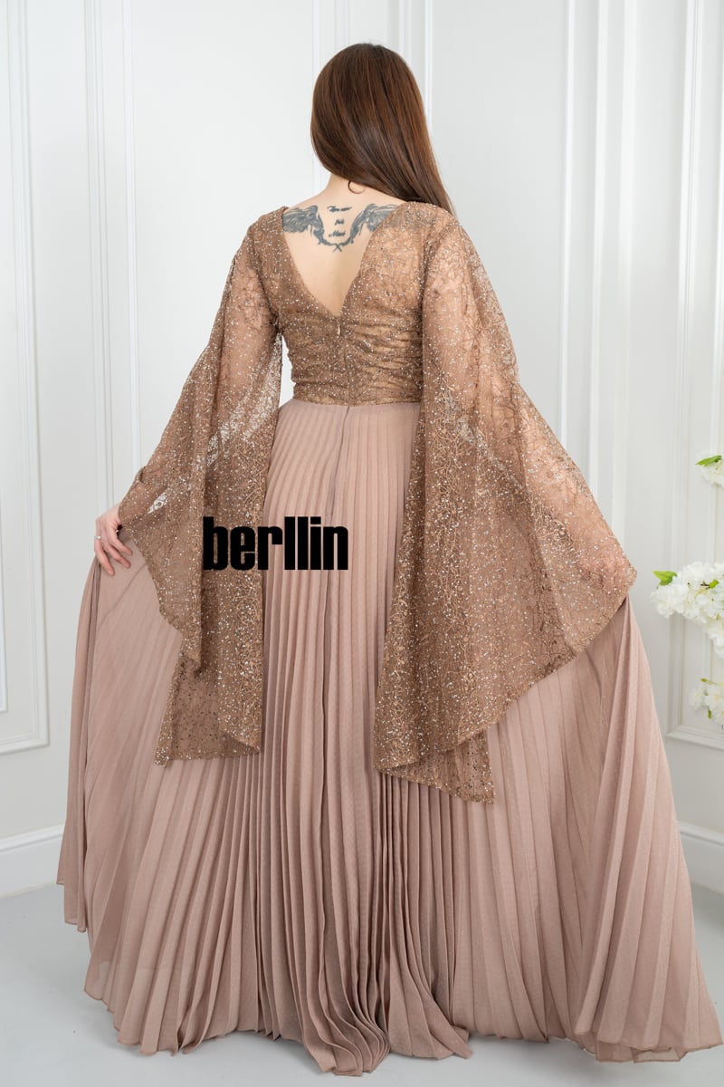 - الأكمام: طويلة وواسعة على شكل كاب من قماش الدانتيل الفاخر، حيث تمنح إطلالة ملكية بفضل التطريز الناعم والتدرجات اللامعة التي تعكس الضوء بطريقة راقية.