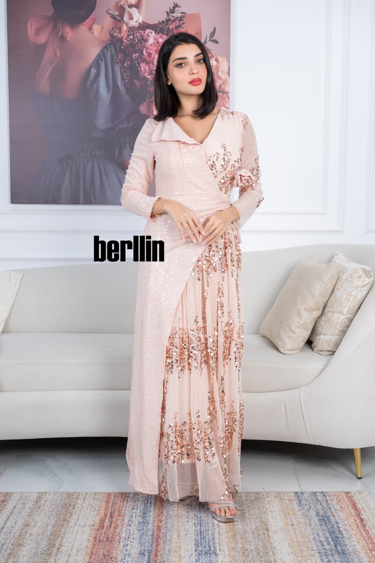 فستان طويل باللون الوردي الفاتح، يجمع بين الأناقة والبساطة بلمسات فاخرة.