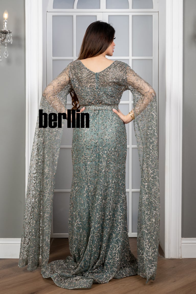نوع التصميم: فستان سهرة مزين بالفصوص بأكمام كيب لون اخضر غامق