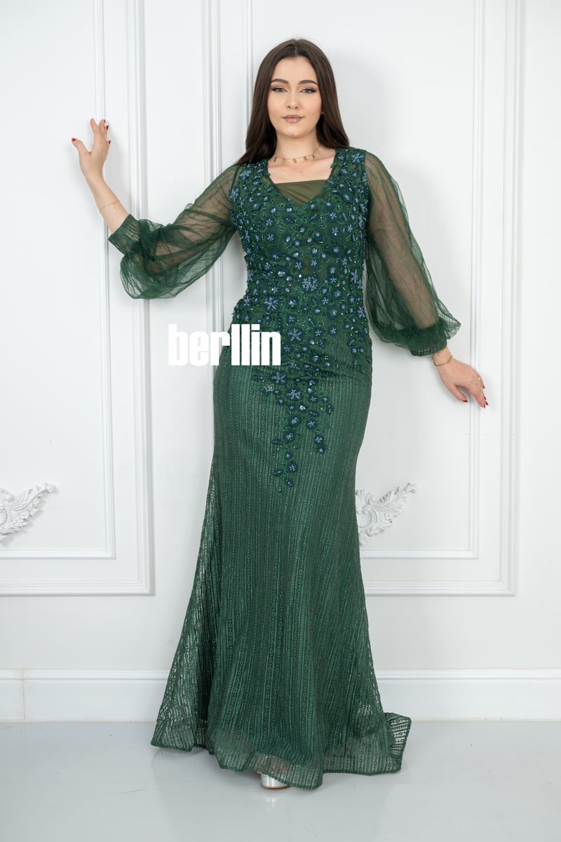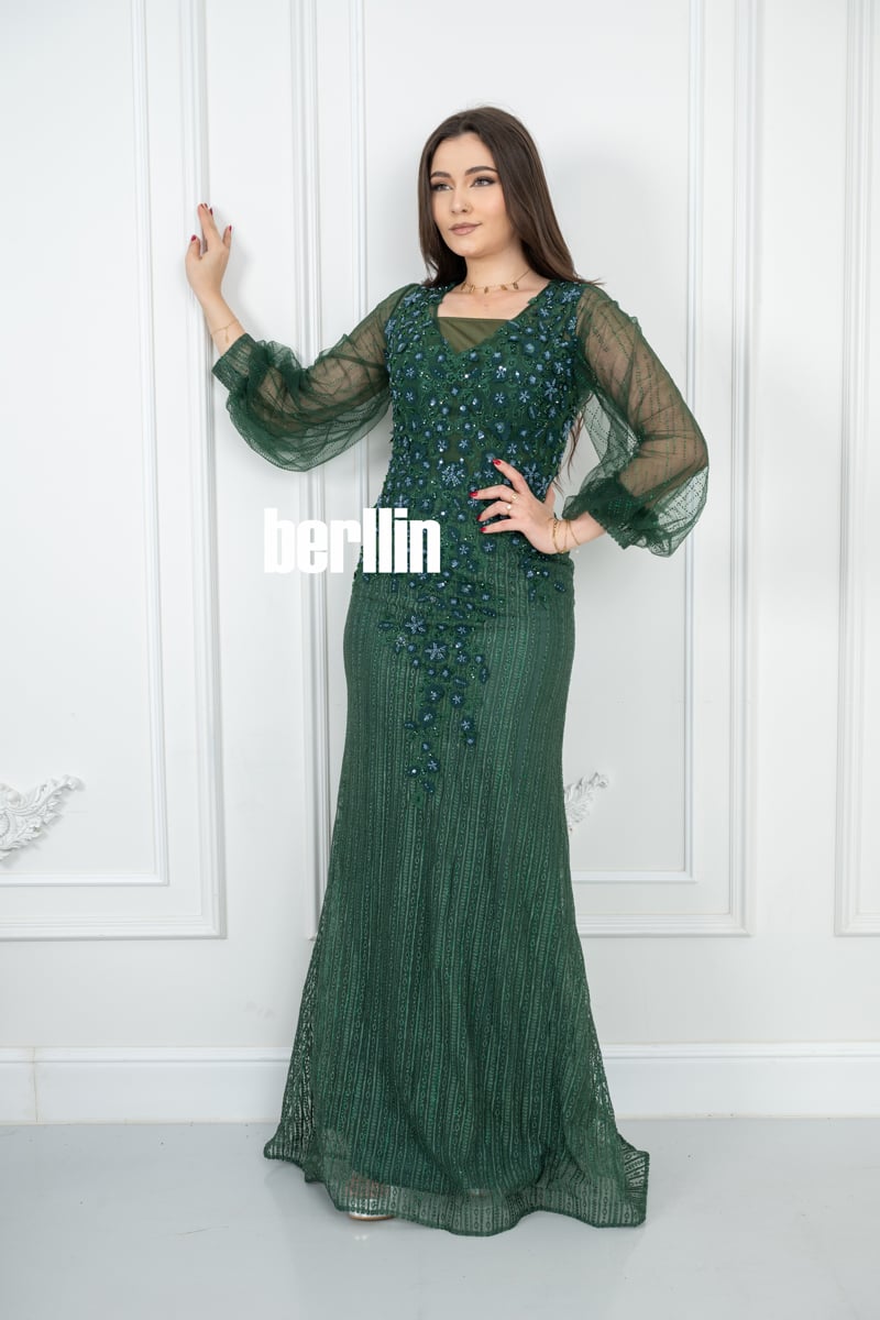 يتميز هذا الفستان بلونه أخضر الفخم الذي يعكس الأناقة والرقي، وهو مزين بتطريزات براقة تضيف لمسة فاخرة ومميزة. تم تصميمه بأسلوب أنثوي راقٍ يجمع بين التفاصيل العصرية واللمسات الكلاسيكية، مما يجعله خيارًا مثاليًا للسهرات والمناسبات الراقية.
