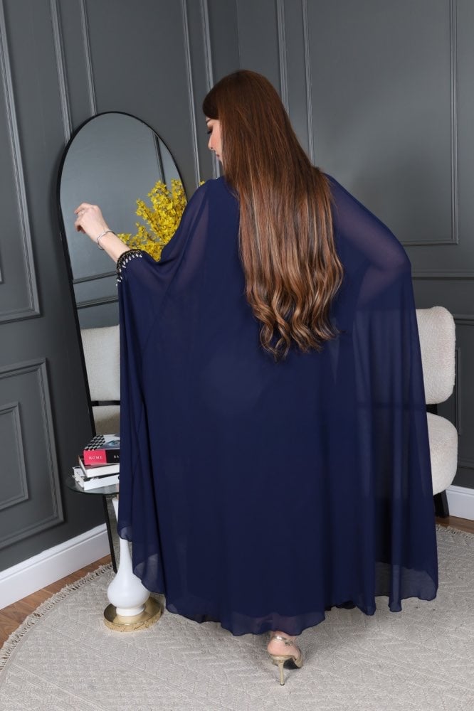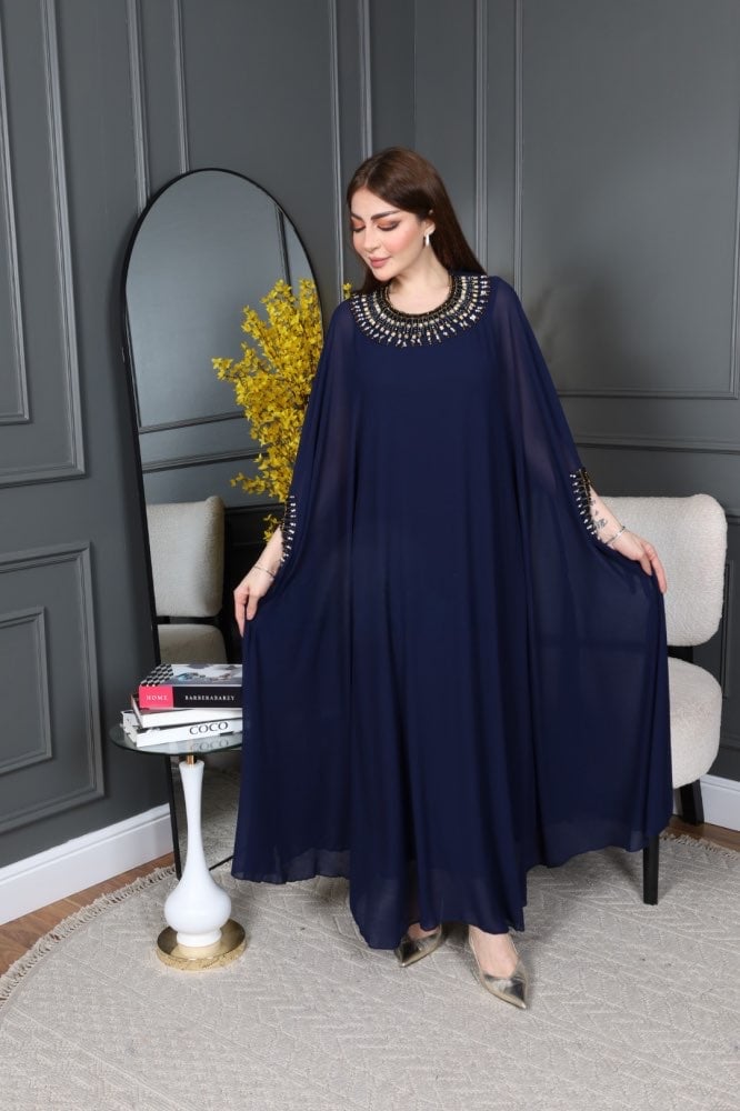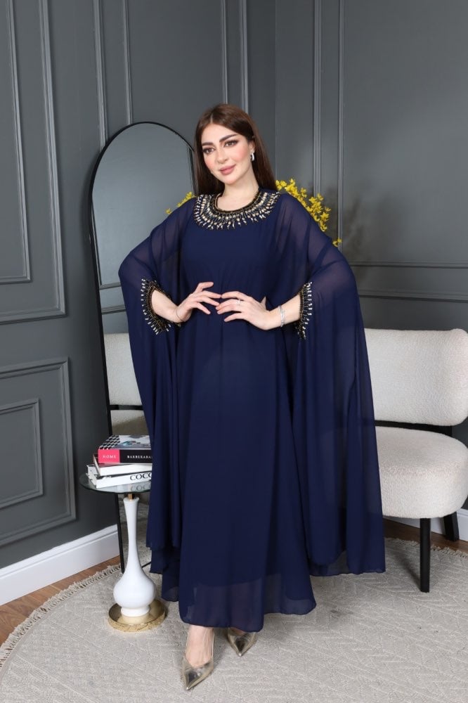 هذه الجلابية الفاخرة مصنوعة من قماش شفاف وناعم بلون كحلي داكن أو أسود، مما يضفي عليها لمسة راقية وأنيقة. تتميز بقصة فضفاضة واسعة توفر راحة مثالية مع مظهر راقٍ وانسيابي، ما يجعلها خيارًا مثاليًا للمناسبات الرسمية والسهرات الفاخرة.