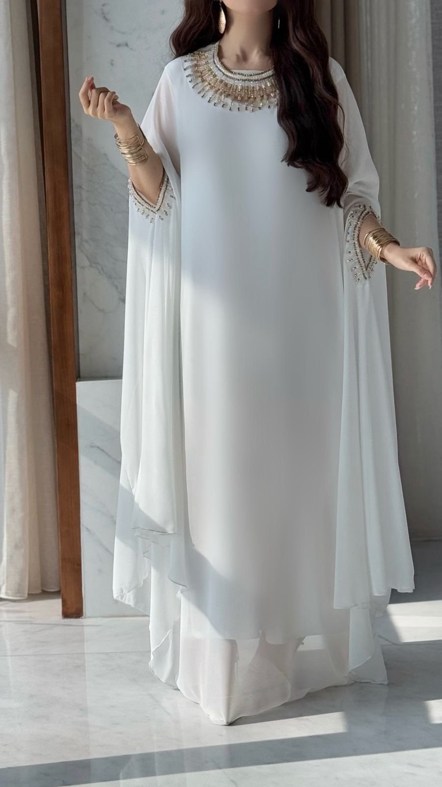 • الأكمام: طويلة وواسعة بنمط الكاب، تضفي لمسة من الفخامة والانسيابية، مع فتحة عند المعصم مزينة بتطريزات راقية من الخرز الذهبي والأسود، مما يعزز من جمال التصميم.