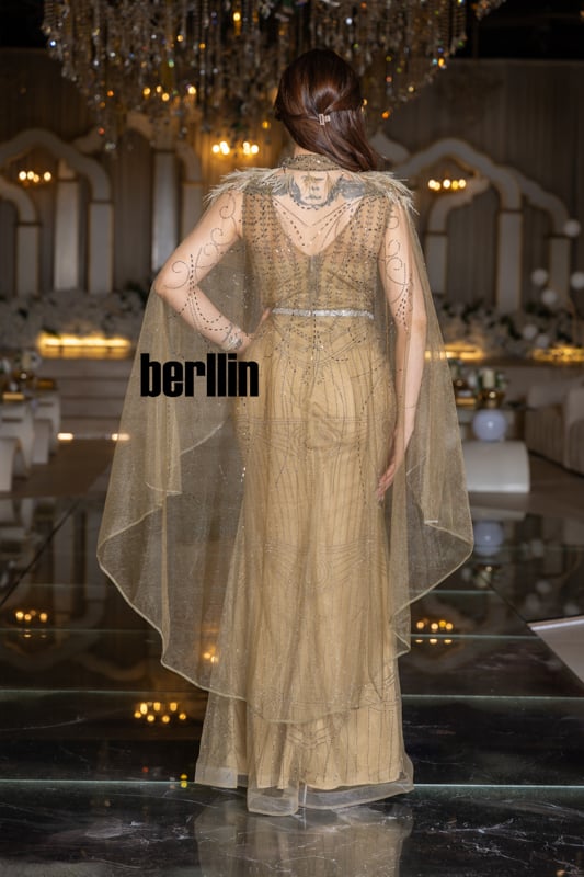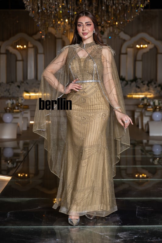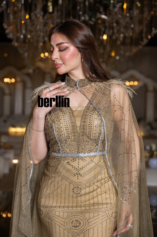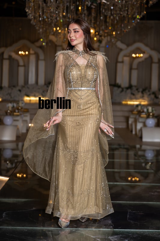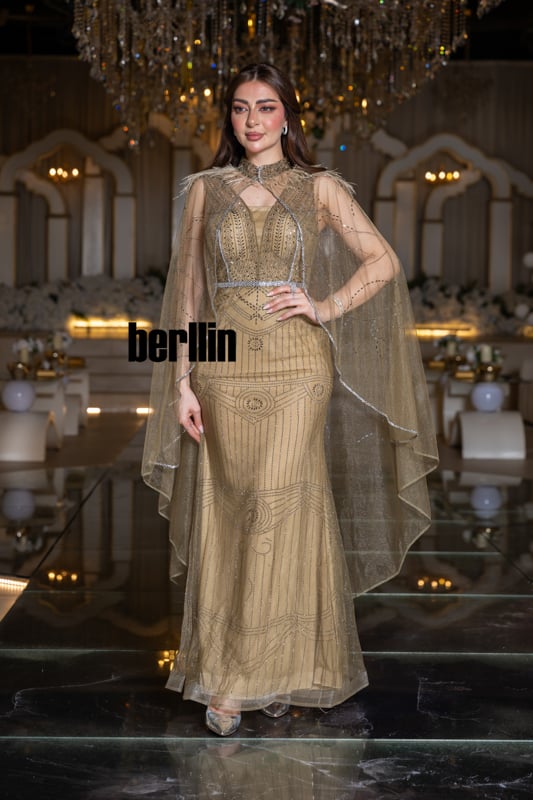 مع كلّ خطوة، يلمع التول الموشّى كالذهب المذاب ويخفق الكاب حولك كسربٍ من الضوء الغابر، فتشعرين وكأنك تسيرين في رواقٍ مرصّعٍ بالمشاعل. الريش الخفيف يلامس البشرة كنسمة فجرٍ دافئ، ليُذكِّرك بأنّ الفخامة قد تكون لطيفة الملمس أيضاً.