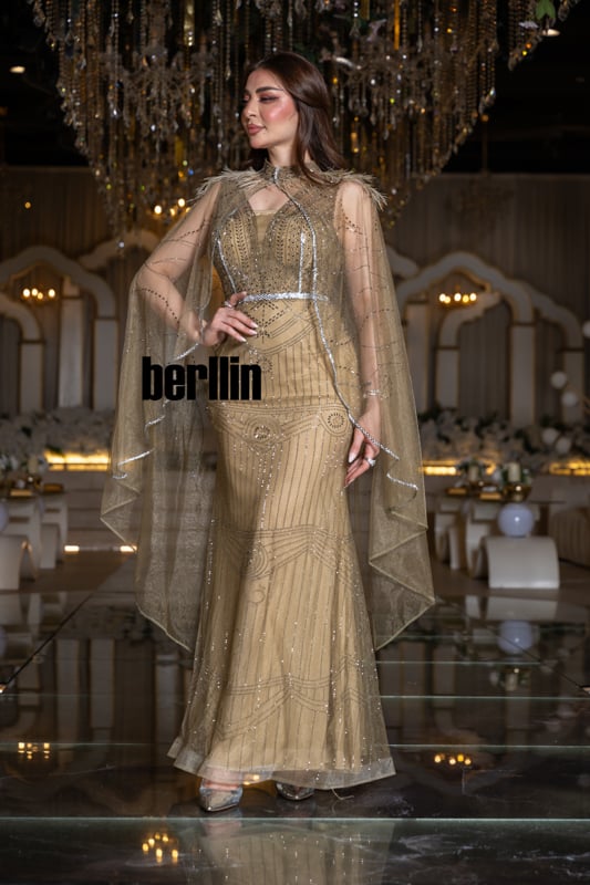 يستمدّ الفستان طاقته من قصور بغداد العبّاسية حين كانت تُزيَّن أروقتها بالحرير الموشّى والذهب السائل. يلتفّ الكاب غير المتناظر حولك كمظلّةٍ ملكيّة، فيما يضيف الريش عند الياقة مَسحةً مسرحيّة تُعانق الضوء وتُبرز ملامحك بإجلال.