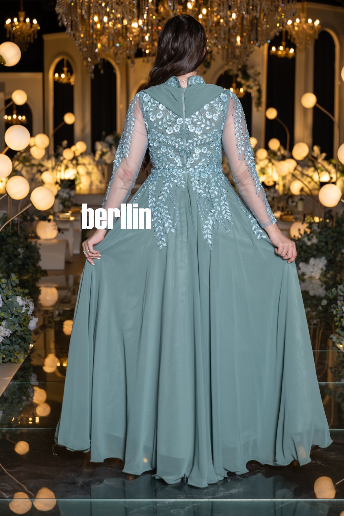 فستان سهرة طويل باللون الأخضر الهادئ بتصميم ملكي يجمع بين الرقي والفخامة. يتميز الفستان بياقة عالية أنيقة تضفي طابعًا كلاسيكيًا راقيًا، مع أكمام طويلة شفافة مطرزة بالزهور البراقة التي تمنح لمسة رومانسية ساحرة.
