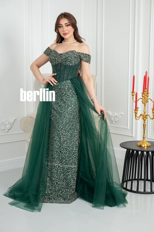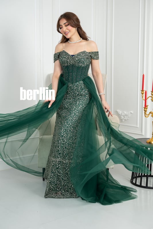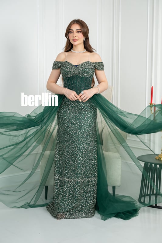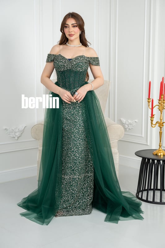 فستان سهرة أخضر تول ودانتيل بتصميم أكتاف مكشوفة وكورسيه محدد الخصر، مناسب للسهرات الرسمية والمناسبات الخاصة بإطلالة أنيقة وفاخرة.