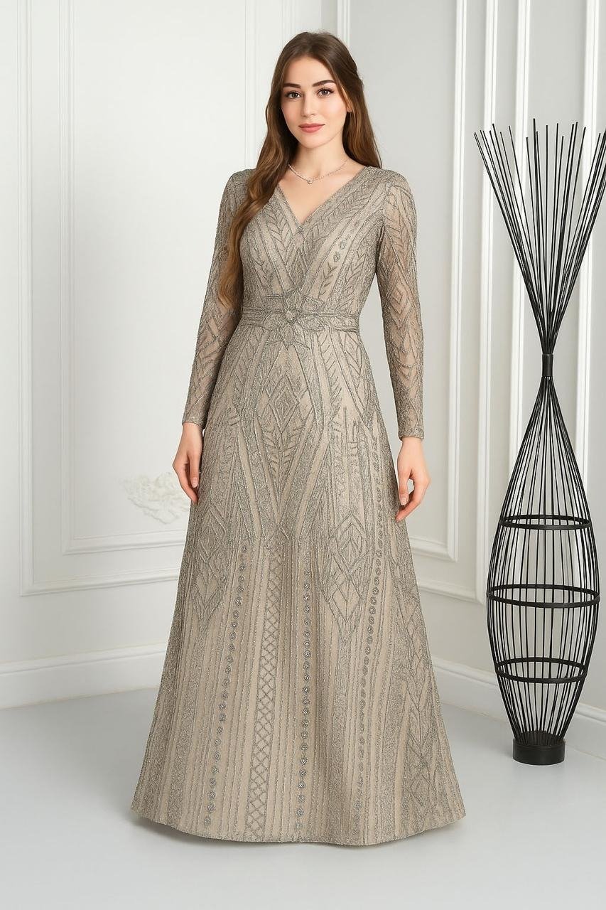 فستان سهرة رمادي مطرّز بتفاصيل هندسية فاخرة يعكس الأنوثة الراقية والفخامة الهادئة في تصميم واحد. مثالي للمناسبات المميزة والسهرات التي تتطلّب حضوراً راقياً وإطلالة تفيض بالجمال والثقة.