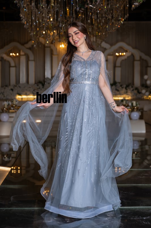 ارتدي “سَرابُ الثلج”… ودعي الفستان يعكس ضوء القمر على خطواتك؛ كابٌ يرفرف حولك كغمامة جليديّة مضيئة، وتطريزٌ فضيّ يهمس ببرقٍ هادئ كلّما تحرّكتِ. مع كل خطوة، يبدو وكأنّ أرض الحفل تتجمّد لتسجّل أثر وهجك، فتتحوّل إطلالتك إلى مشهد شتائيّ فاتن يخلّد اللحظة في ذاكرة كل عين.