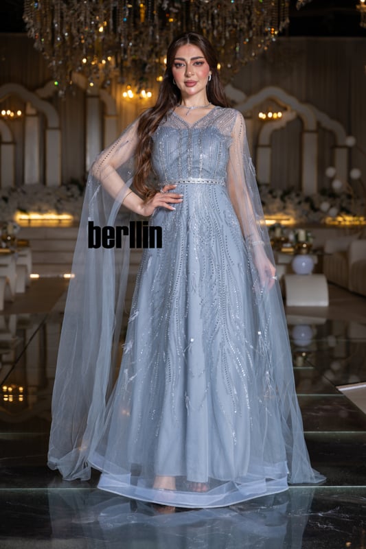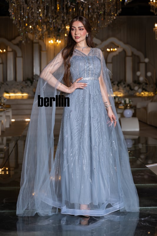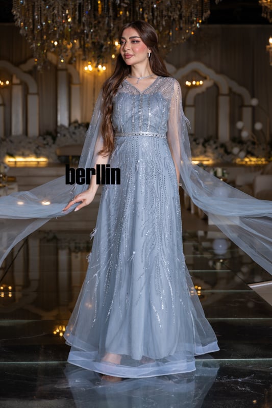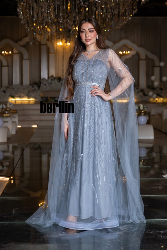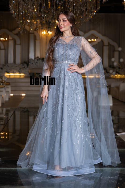 يتجلّى هدوء الليل الشتوي في هذا الفستان؛ خطوطٌ فضيّة تهطل كبلّورات ثلج ذائب على تولٍ سماويّ شفاف، بينما ينساب الكاب حولك مثل ضباب قمريّ يلتفّ على خُطاك.