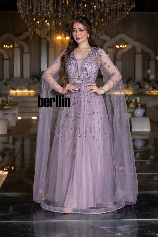 اختاري عقدًا بسيطًا وأقراط ألماس صغيرة لإبراز ياقة الـV؛ ارفعي شعرك بتسريحة شينيون منخفضة لتترك للكاب مساحة ليروي قصته بالكامل. فستان “ظِلّ اللافندر” سيجعل الليل مزهرًا بإشراقك، ويحوّل كل مشهد تمرّين به إلى لوحة فنيّة نابضة بالضوء.