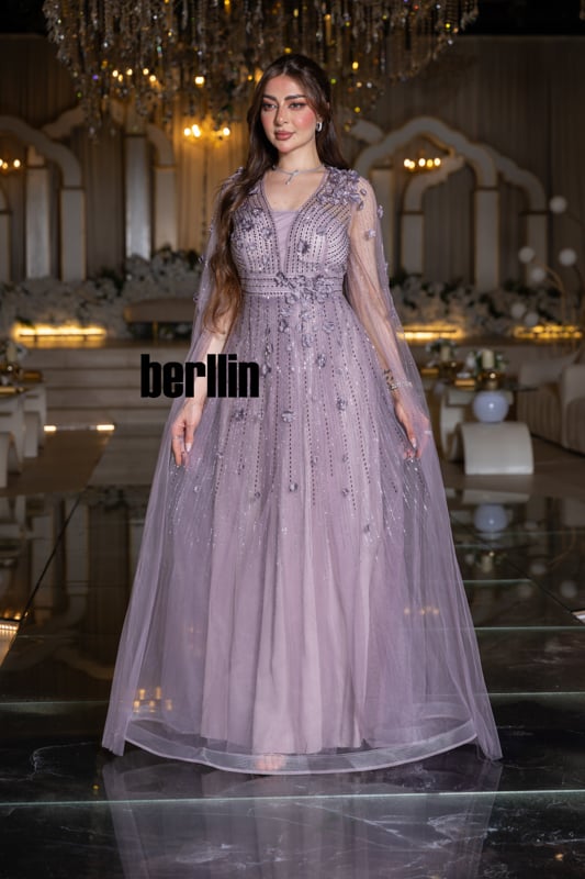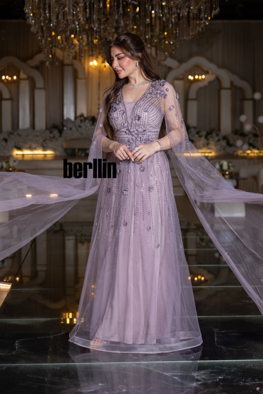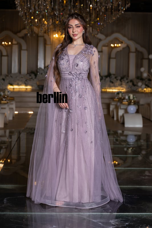 حين ترتدين “ظِلّ اللافندر” يصبح الليل نفسه ستاراً شفّافاً يحيطك بعبيره؛ قطراتُ ضوءٍ بنفسجية تنساب على تولٍ حريريٍّ فيرسمها التطريز كأنّها مجرّة صغيرة تستقر فوق كتفيك. الكاب يغفو على ذراعيك كأجنحة ياسمين، والزهور الثلاثية الأبعاد تتفتّح مع كل خُطوة لتترك خلفك مساراً من الهمس والبريق. إنّه فستان يحوِّل حضورك إلى قصيدة أثيريّة، حيث يلتقي الخيال بالفخامة وتختصر أنوثتك كل حكايات السهرة في ومضةٍ واحدة لا تُنسى.